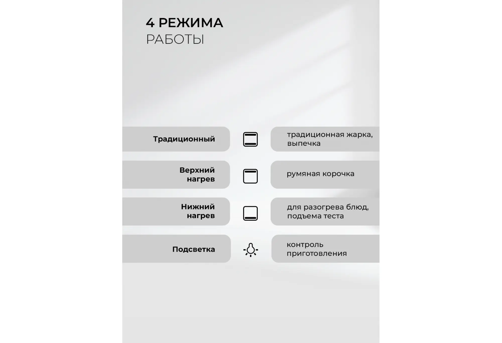 Верхний нагрев, Нижний нагрев, Подсветка, Традиционный