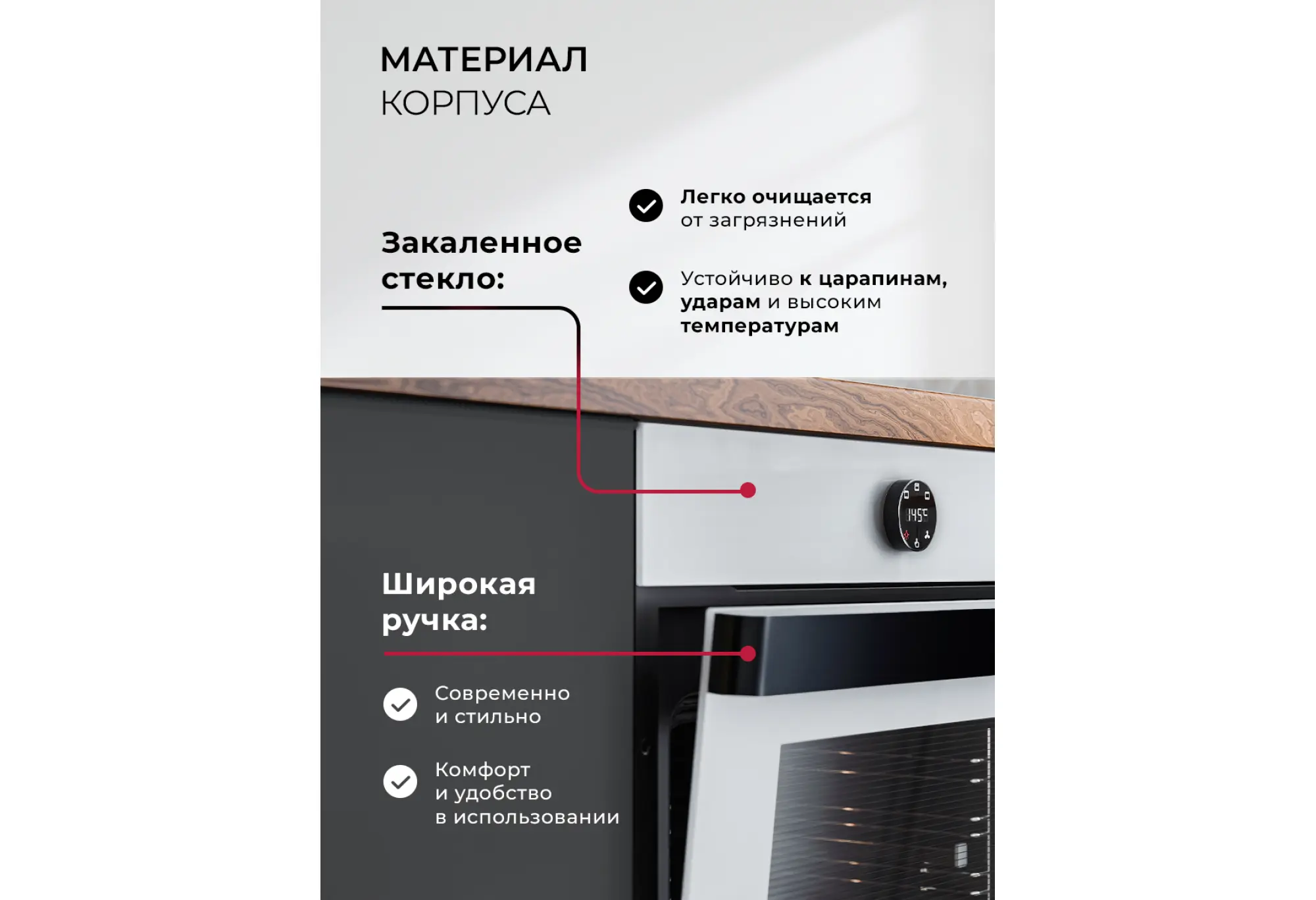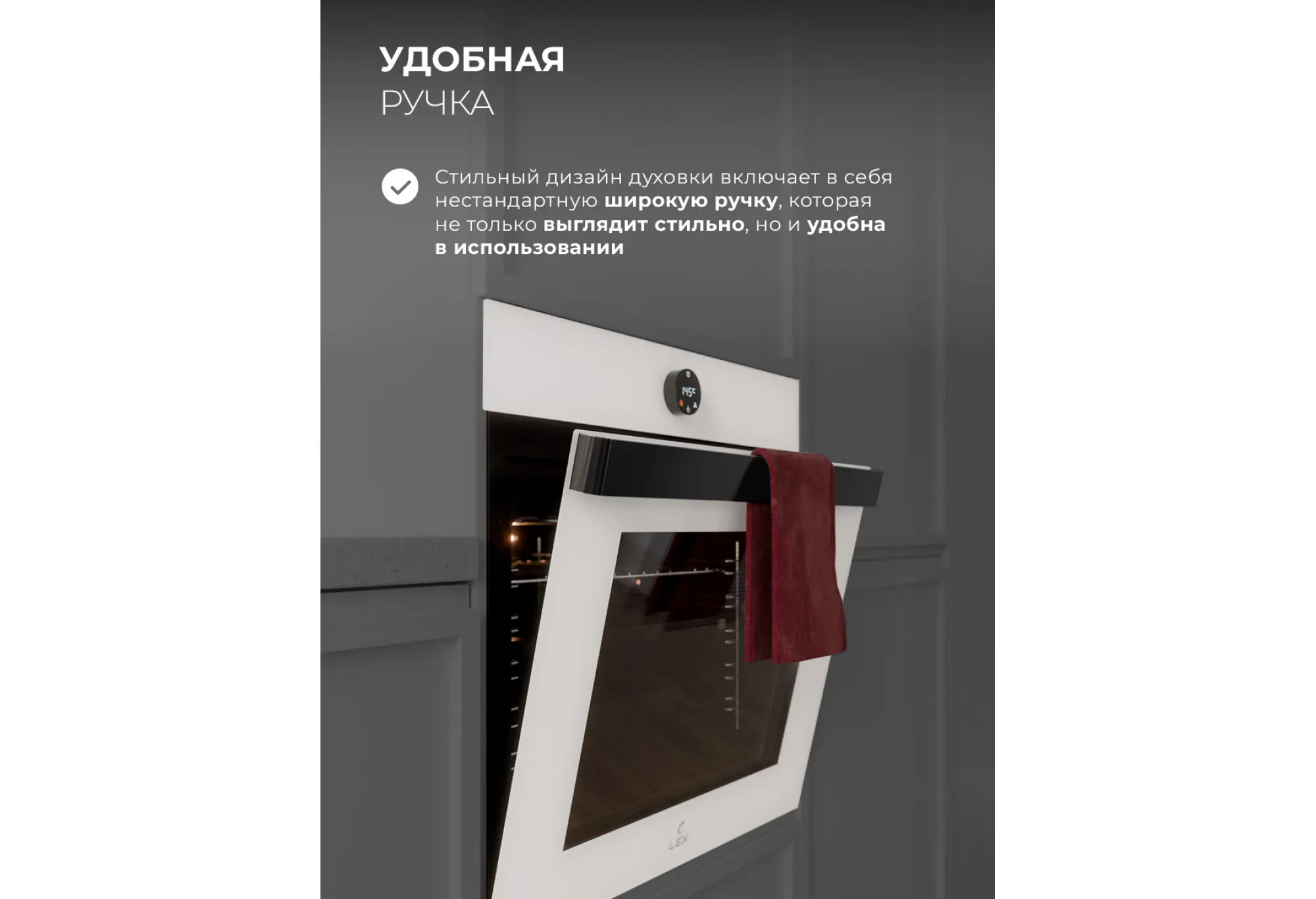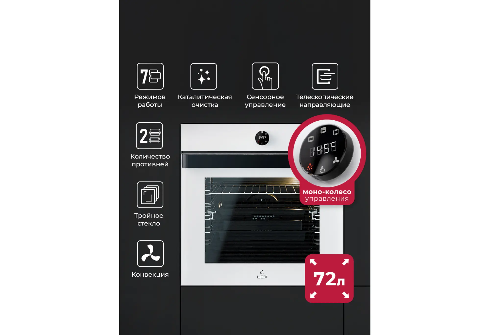 Духовой шкаф LEX EDP 607 Wide Series — комфорт и надежность в одном устройстве Эта модель предлагает просторную камеру объемом 75 литров, 7 режимов приготовления, идеально подходящую для приготовления больших блюд и семейных ужинов. Эргономичная широкая ручка и кольцо управления с экраном подчеркивают современный дизайн и удобство использования.Хромированные телескопические направляющие — удобство и безопасность с первого использования Духовой шкаф LEX EDP 607 Wide Series оснащен хромированными телескопическими направляющими, которые обеспечивают легкий доступ к блюдам во время приготовления. Благодаря им вы можете безопасно и удобно извлекать противни, снижая риск ожогов и делая процесс готовки более комфортным.Богатая цветовая палитра для гармоничного интерьера Модель представлена в следующих цветовых решениях: Black (черный c элементами управления из нержавеющей стали), Grey (серый), Black Black (черный) и White (белый). Такой выбор позволяет подобрать духовку, идеально дополняющую дизайн вашей кухни.White (белый)Белый цвет символизирует чистоту и простор, наполняя кухню ощущением свежести и легкости.7 режимов для реализации ваших кулинарных идей Духовка предоставляет семь различных режимов работы, включая традиционный нагрев, конвекцию, гриль и подсветку. С мощностью гриля 1200 Вт и максимальной температурой 270 °C вы сможете приготовить блюда с идеальной текстурой и вкусом.Интуитивное управление для вашего удобства Комбинированная система управления, объединяющая сенсорные и механические элементы, позволяет легко настраивать необходимые параметры. LED-дисплей четко отображает текущие настройки, а цифровой таймер обеспечивает точный контроль процесса приготовления.Современные технологии для безопасной эксплуатации Тройное стекло дверцы и встроенный термостат защищают от перегрева, обеспечивая безопасность использования. Каталитическая система очистки облегчает уход за духовкой, эффективно устраняя жировые отложения. Быстросъемная дверца упрощает обслуживание прибора.Исключительные результаты для каждого блюда С LEX EDP 607 Wide Series и его энергопотреблением класса A вы сможете наслаждаться превосходными кулинарными результатами, делая процесс приготовления приятным и эффективным.