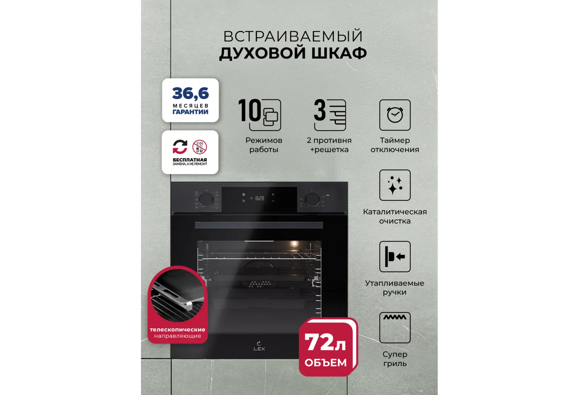 Духовой шкаф LEX EDP 610 — надежность и стиль в каждой деталиЭта модель с объемом рабочей камеры 75 литров создана для тех, кто ценит функциональность и комфорт. 10 режимов работы, управление с LED-дисплеем и двумя утапливаемыми ручками делает процесс приготовления интуитивно понятным.Хромированные телескопические направляющие — удобство и безопасность в использованииДуховой шкаф LEX EDP 610 оснащен хромированными телескопическими направляющими, которые обеспечивают легкий доступ к блюдам во время готовки. Они позволяют безопасно и удобно извлекать противни, снижая риск ожогов и облегчая процесс приготовления.Широкая цветовая палитра для идеального сочетания с вашим интерьеромДуховой шкаф LEX EDP 610 доступен в следующих цветовых решениях: White (белый), Black (черный), Dark Inox (темная нержавеющая сталь), Grey (серый) и Inox (нержавеющая сталь). Такой ассортимент позволяет подобрать модель, которая гармонично впишется в дизайн вашей кухни.LEX EDP 610 — 10 режимов для вашего вдохновения!Духовой шкаф предлагает 10 различных режимов работы, включая традиционный нагрев, конвекцию, гриль и размораживание. Это универсальный выбор для приготовления разнообразных блюд. Мощность гриля 2100 Вт и температурный диапазон от 50 до 270 °C обеспечивают быстрые и равномерные результаты.Точная настройка под ваши нуждыКомбинированное управление, сочетающее сенсорные и механические элементы, позволяет гибко настраивать параметры готовки. LED-дисплей отображает важную информацию, а цифровой таймер помогает точно следовать рецептам.Современные технологии для максимальной безопасностиТройное стекло дверцы обеспечивает надежную теплоизоляцию, а встроенный термостат гарантирует безопасную эксплуатацию. Каталитическая система очистки упрощает уход за духовкой, эффективно поглощая жировые отложения. Быстросъемная дверца способствует легкому поддержанию чистоты.Превосходный результат каждый разС LEX EDP 610 вы сможете наслаждаться идеально приготовленными блюдами благодаря конвекции и мощному грилю. Духовой шкаф с энергоэффективностью класса A станет незаменимым помощником на вашей кухне.