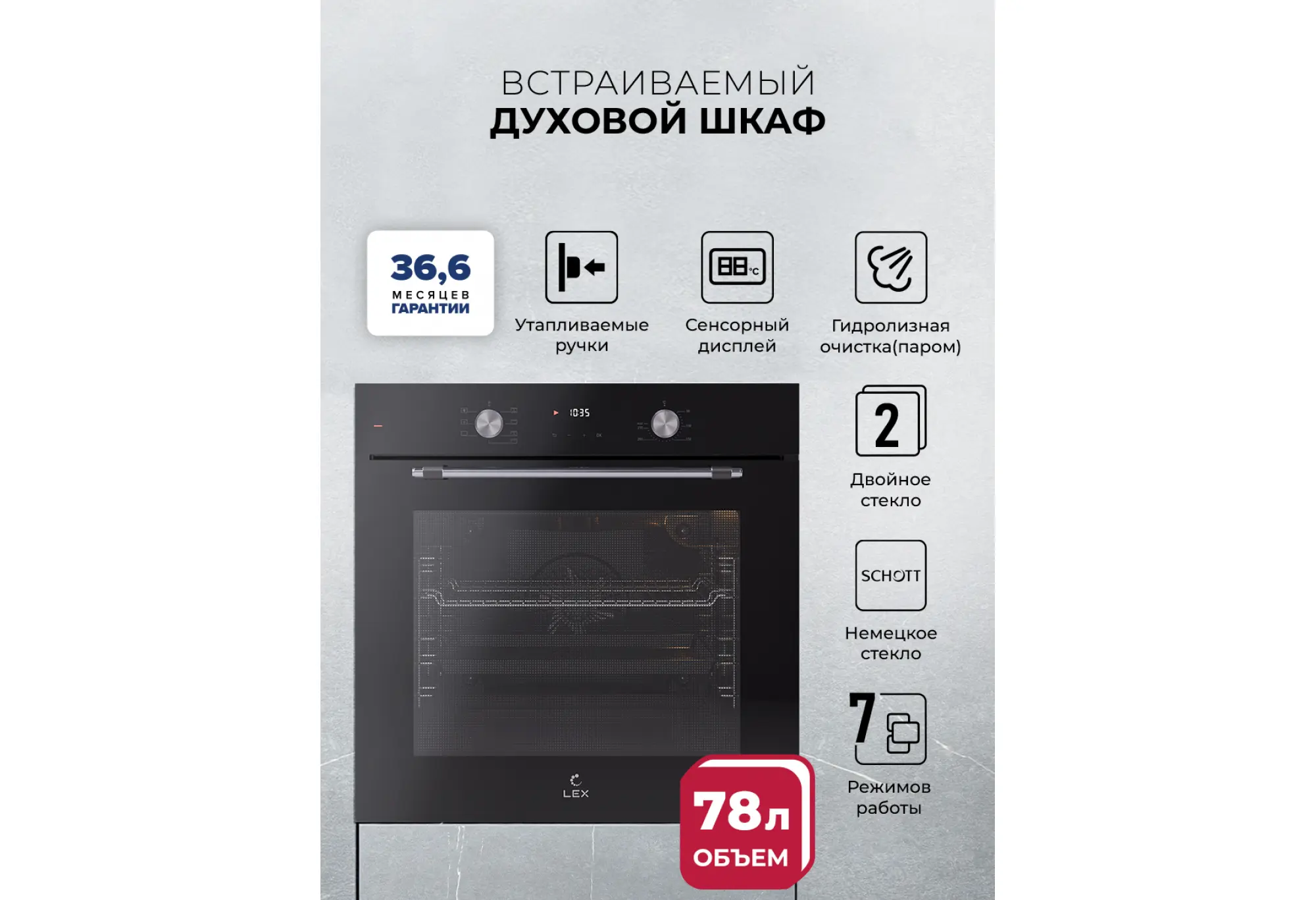 Преимущества:- Большой полезный объем 78 литров для приготовления на нескольких уровнях