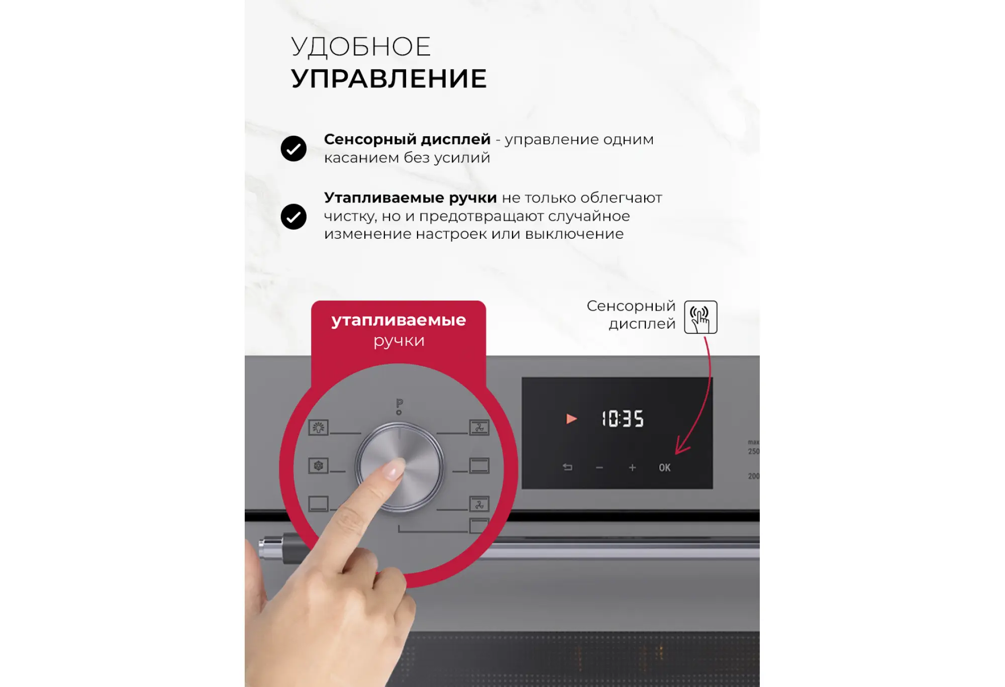 Механическое управление дополнено сенсорным блоком и LED-дисплеем. Настройки температур и времени работы считываются быстро и без лишних действий. Утапливаемые ручки защищены от случайного задевания и сохраняют аккуратный вид панели, когда духовка не используется. Таймер помогает контролировать время приготовления, не отвлекаясь от других дел на кухне.