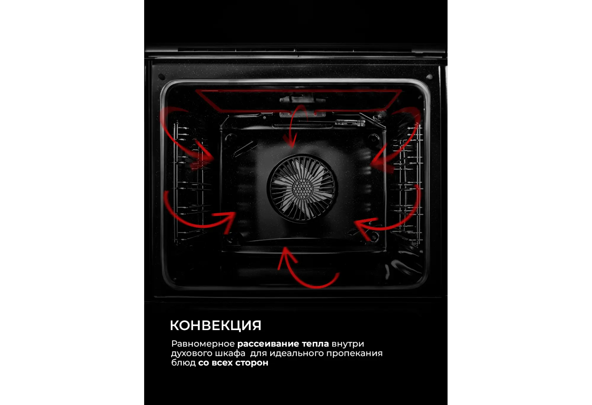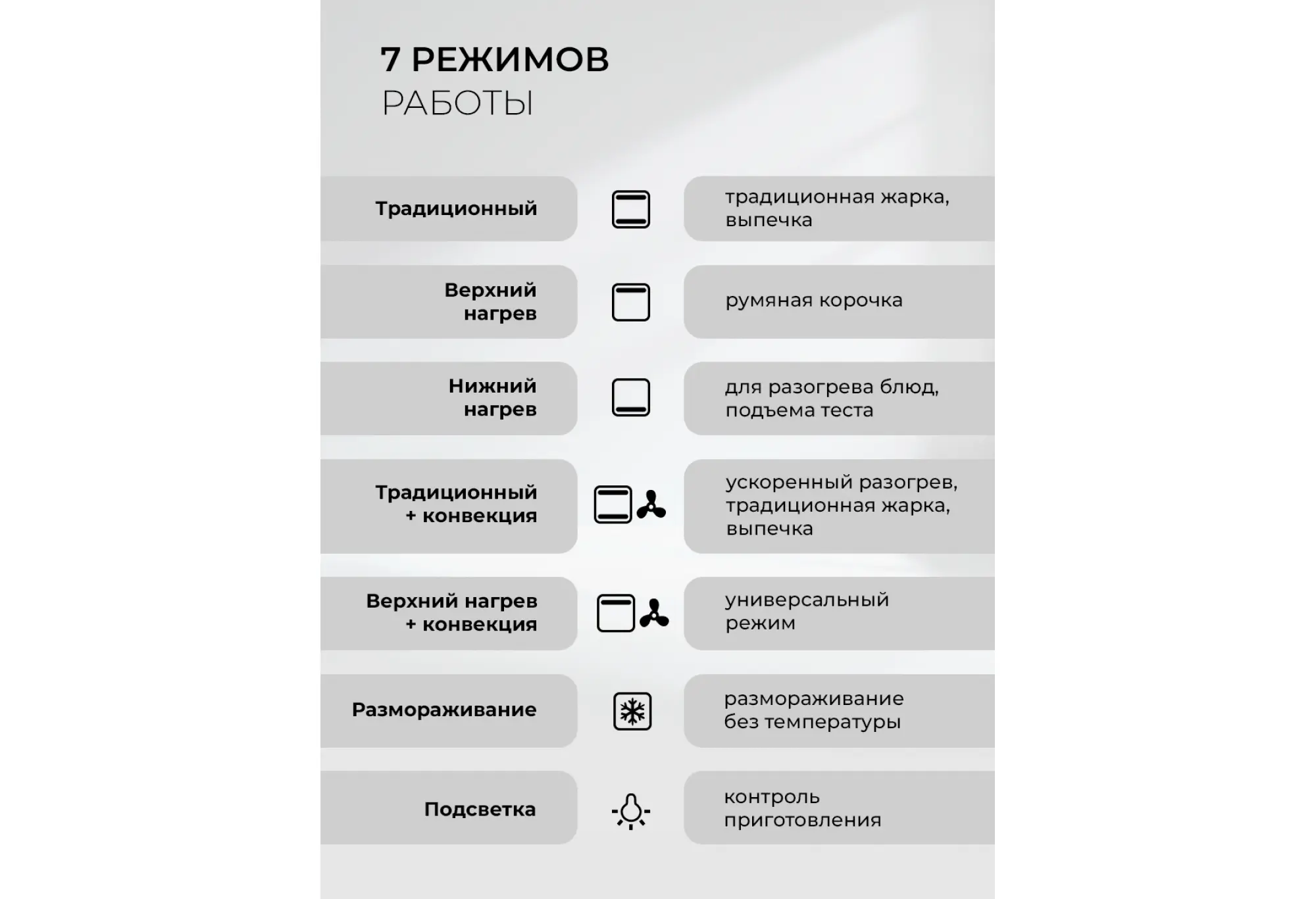 Полезный объем 78 литров позволяет готовить на нескольких уровнях одновременно — удобно для семейных обедов и запекания крупных блюд. Набор режимов охватывает основные кулинарные задачи - верхний и нижний нагрев, традиционный режим, варианты с конвекцией, размораживание и подсветку камеры. Конвекция помогает равномерно распределять тепло по всей внутренней поверхности, что особенно важно при выпечке и запекании больших порций.
