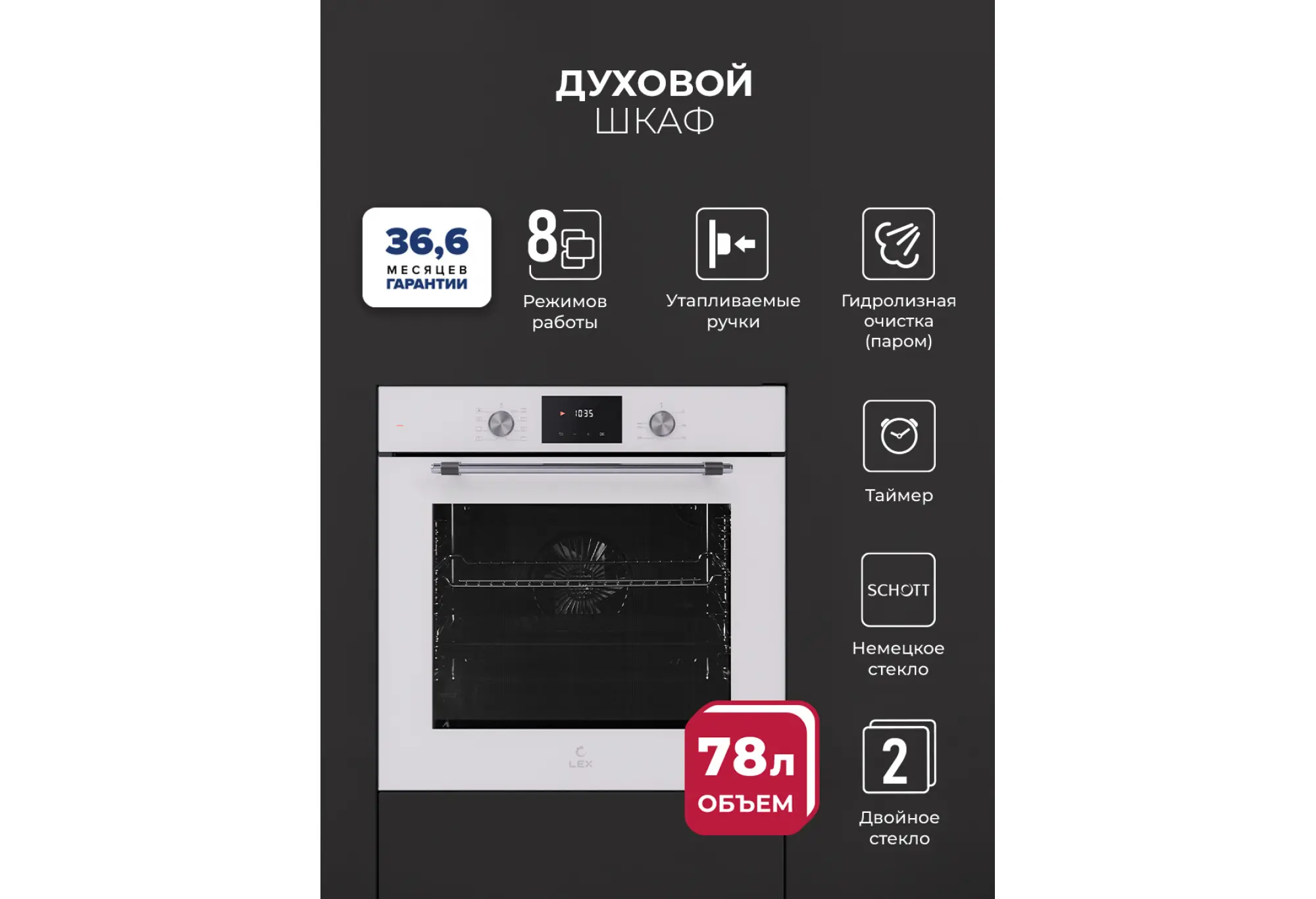 LEX EDP 680 WH MAX подойдет тем, кто хочет совместить вместительную духовку с продуманным набором режимов и лаконичным современным дизайном. Выбирая эту модель, вы получаете функциональный и визуально аккуратный центр рабочей зоны на кухне.