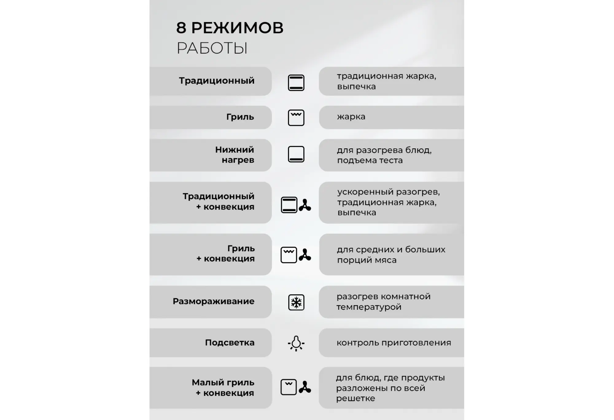 - Широкий набор режимов, включая гриль, конвекцию и размораживание
