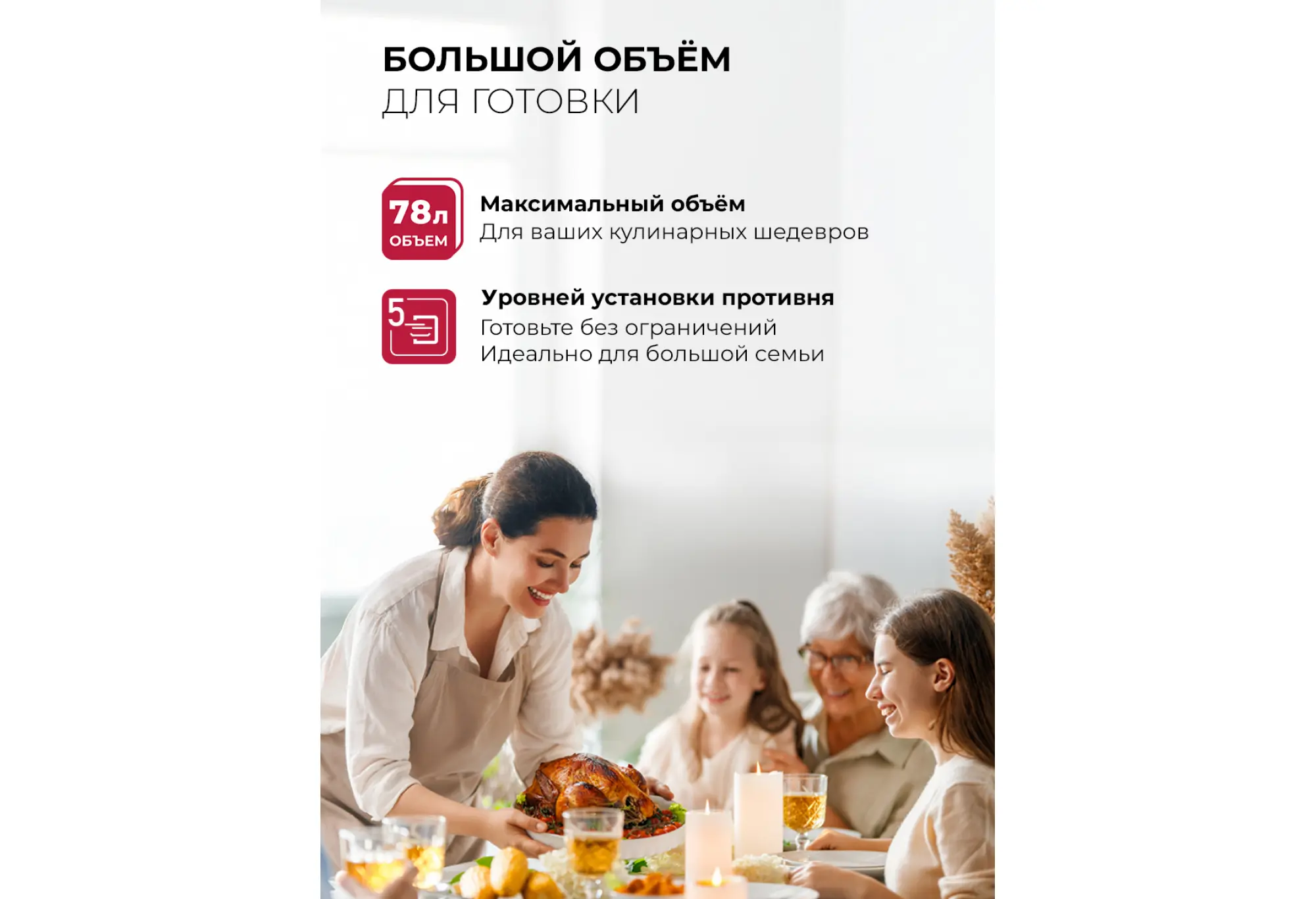 Преимущества:- Большой полезный объем духовки 78 л для приготовления на нескольких уровнях