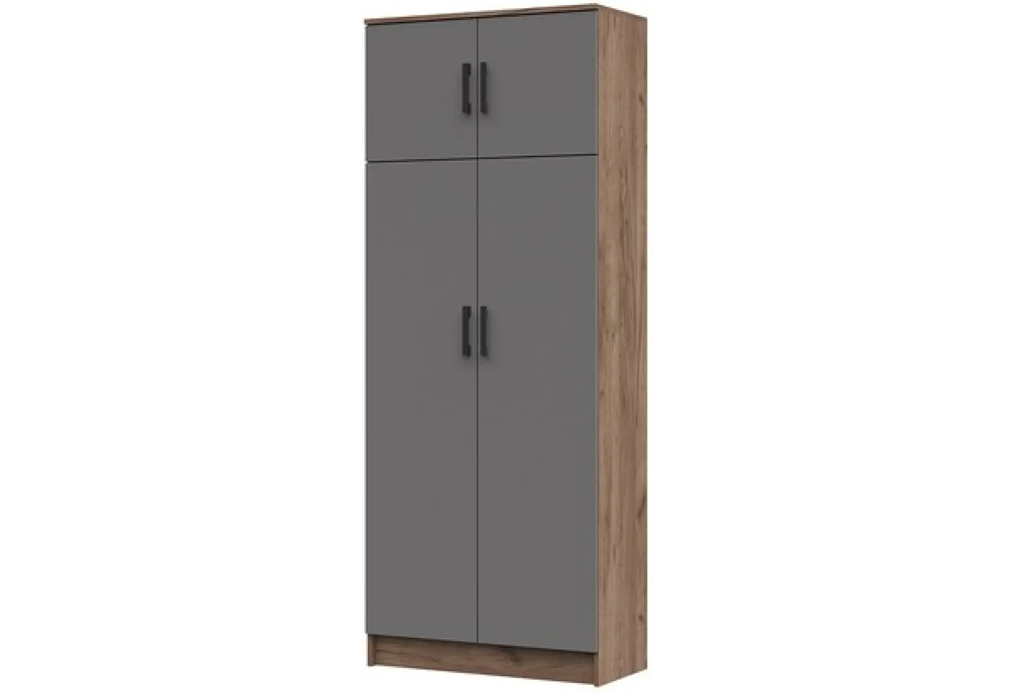 Корпус шкафа выполнен в тёмном цвете венге, а фасады — в светлом оттенке дуб белфорд. Такое сочетание делает шкаф визуально легким и универсальным для современных интерьеров. Верхние и нижние дверцы снабжены удобными вертикальными ручками, которые обеспечивают комфортное открывание. Конструкция из ЛДСП обеспечивает устойчивость, а ровные плоскости корпуса и фасадов облегчают уход за поверхностями.