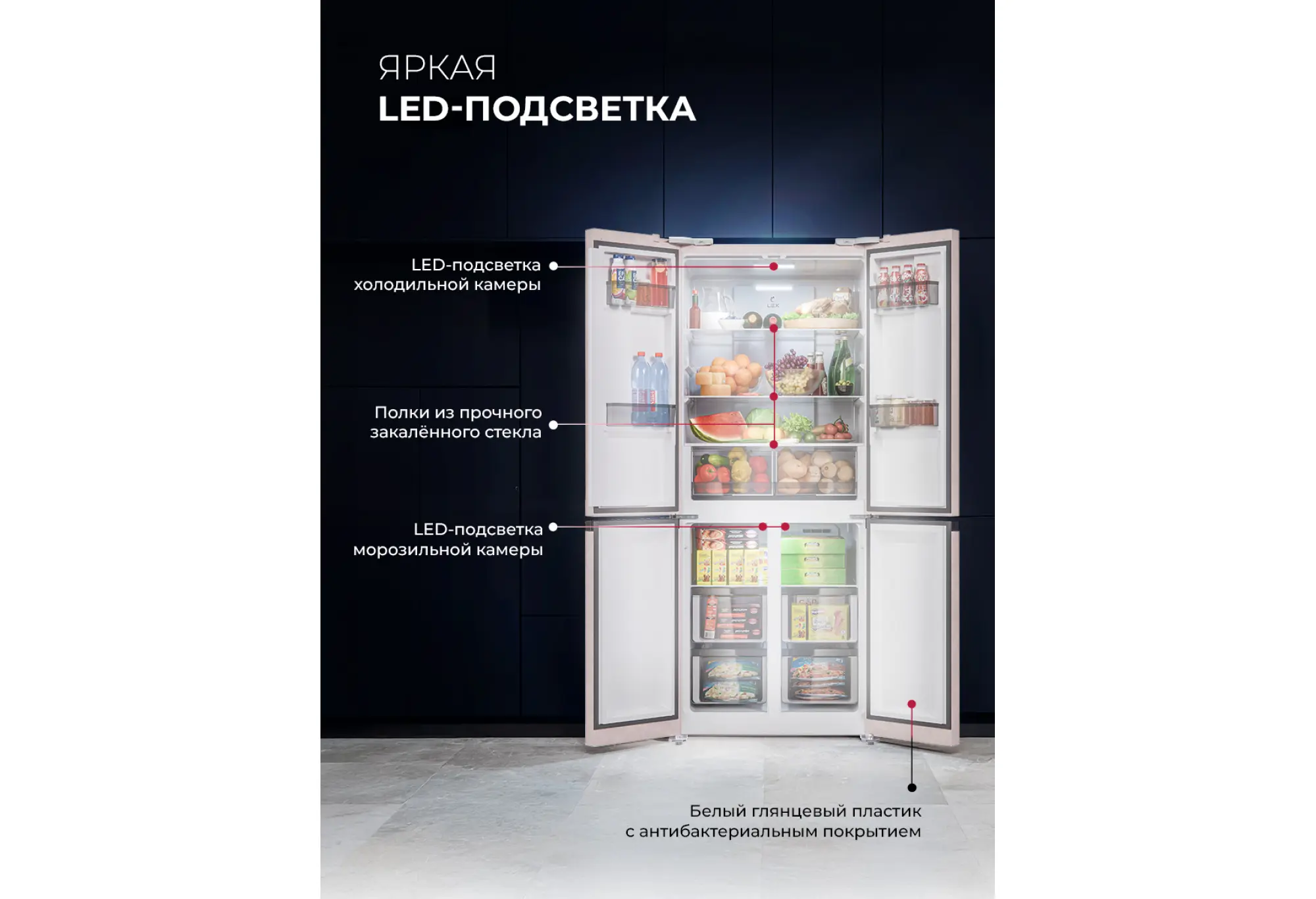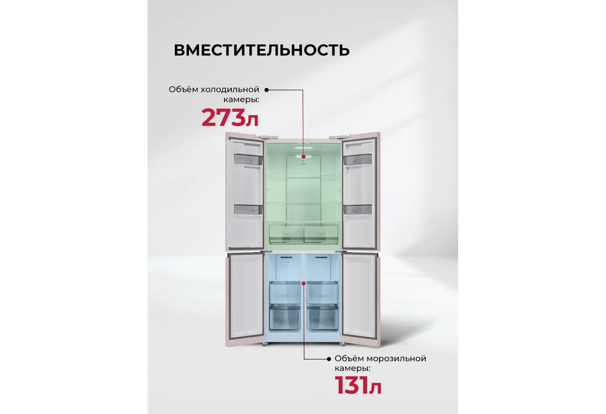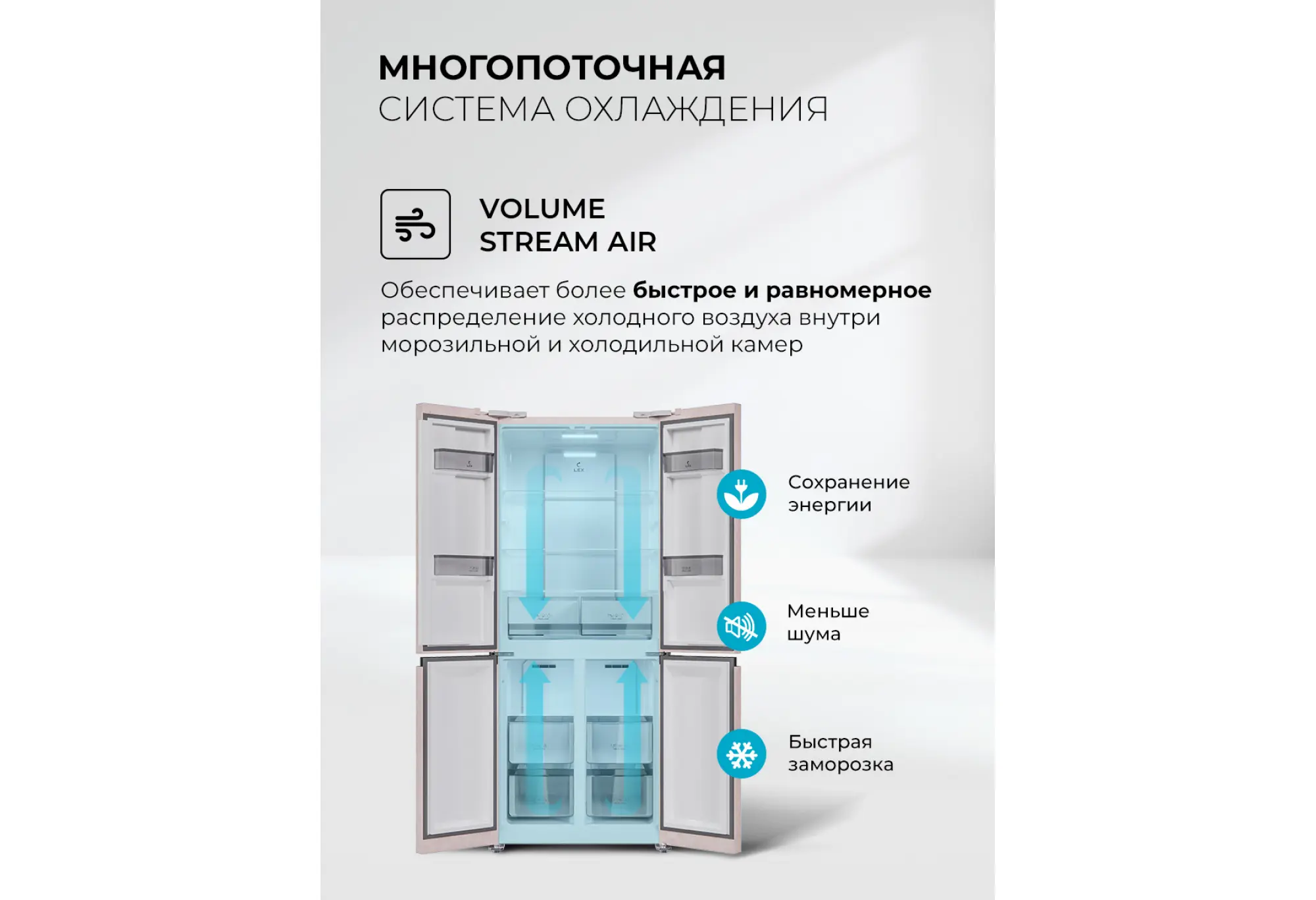 LCD432 — холодильник с двумя морозильными отделениями и самой современной технической начинкой. Благодаря конструкции CROSS DOOR и удобной электронной панели управления со светодиодными индикаторами в рабочих камерах всегда легко поддерживать наиболее подходящие параметры хранения. Большой холодильник с энергоэффективным инверторным компрессором имеет систему охлаждения Total No Frost, поэтому не требует разморозки. Запатентованная вентиляционная система Volume Stream Air равномерно распределяет холодный воздух по всем отделениям и зонам. Яркие LED-лампы помогут быстро найти все любимые продукты даже при максимальной загрузке холодильника. Модель имеет температурный диапазон от +8 °С в холодильном до –23 °С в морозильном отделении. А функция суперзаморозки быстро устанавливает значение –28 °С. Холодильная камера тоже оснащена режимом ускоренного охлаждения. При отключении света также пригодится функция сохранения температуры на 12 часов. Модель представлена в сером и белом металлическом оформлении. Ширина 76 см подойдет для любой, даже небольшой кухни. С холодильником LEX LCD432 ваши мечты станут реальностью!