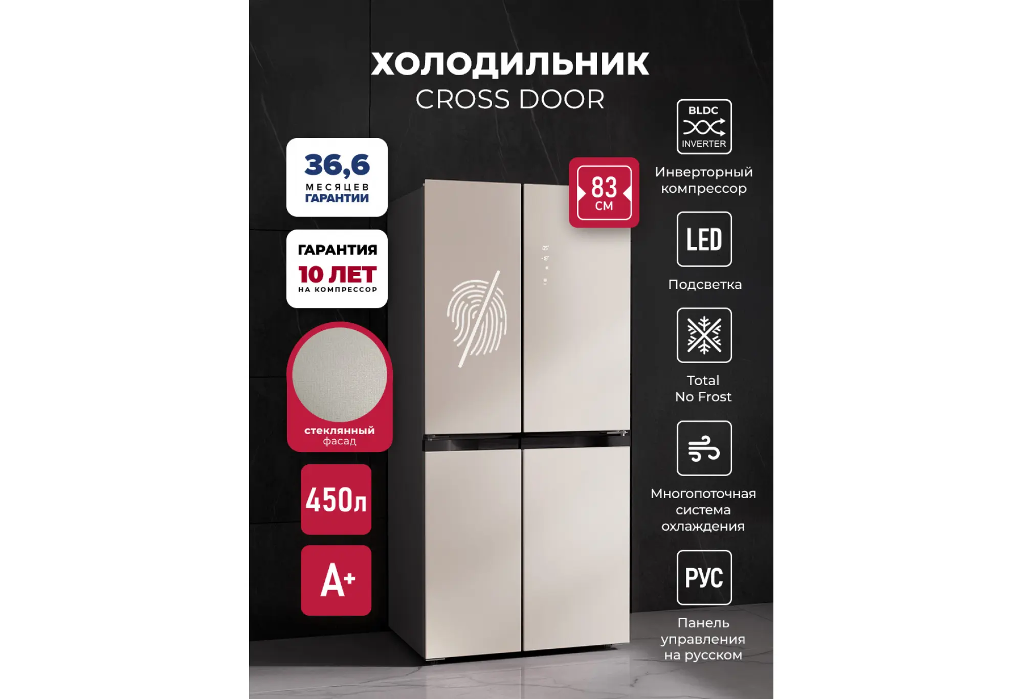 Модель LEX LCD 450 — передовые технологии и множество вариантов дизайна. Удобная панель управления и расположение дверей по типу CROSS DOOR помогут поддерживать нужные параметры хранения для каждого отделения. Холодильник с мощным, экономичным и тихим инверторным компрессором работает по технологии Total No Frost, которая не дает инею скапливаться внутри рабочих камер, значительно упрощая уход за устройством. Запатентованная многопоточная система охлаждения быстро и равномерно распределяет холодный воздух по всем зонам хранения. Модель позволяет хранить продукты при температуре от +8 °С в холодильном отделении до –23 °С в морозильном. А в режиме суперзаморозки можно установить еще более низкое значение: –28 °С. Суперрежимы позволяют максимально охладить содержимое во всех отделениях за короткое время. Это удобно, если вы загружаете сразу много продуктов, например, после похода в супермаркет или отключения электричества. В последнем случае также может пригодиться режим поддержания температуры, который будет работать 10 часов. Еще одна полезная функция — «Отпуск»: когда она активна, в каждой камере устанавливается температура, оптимальная одновременно и для сохранения свежести продуктов, и для уменьшения расхода электричества. Для этого холодильника можно выбрать один из шести стилей матового или глянцевого, стеклянного или металлического корпуса в разных цветах.