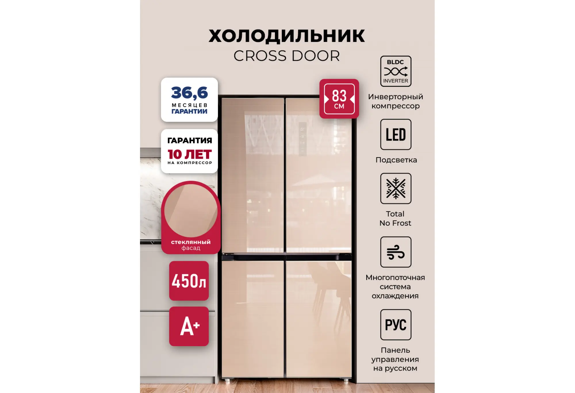 Модель LEX LCD 450 — передовые технологии и множество вариантов дизайна. Удобная панель управления и расположение дверей по типу CROSS DOOR помогут поддерживать нужные параметры хранения для каждого отделения. Холодильник с мощным, экономичным и тихим инверторным компрессором работает по технологии Total No Frost, которая не дает инею скапливаться внутри рабочих камер, значительно упрощая уход за устройством. Запатентованная многопоточная система охлаждения быстро и равномерно распределяет холодный воздух по всем зонам хранения. Модель позволяет хранить продукты при температуре от +8 °С в холодильном отделении до –23 °С в морозильном. А в режиме суперзаморозки можно установить еще более низкое значение: –28 °С. Суперрежимы позволяют максимально охладить содержимое во всех отделениях за короткое время. Это удобно, если вы загружаете сразу много продуктов, например, после похода в супермаркет или отключения электричества. В последнем случае также может пригодиться режим поддержания температуры, который будет работать 10 часов. Еще одна полезная функция — «Отпуск»: когда она активна, в каждой камере устанавливается температура, оптимальная одновременно и для сохранения свежести продуктов, и для уменьшения расхода электричества. Для этого холодильника можно выбрать один из шести стилей матового или глянцевого, стеклянного или металлического корпуса в разных цветах.