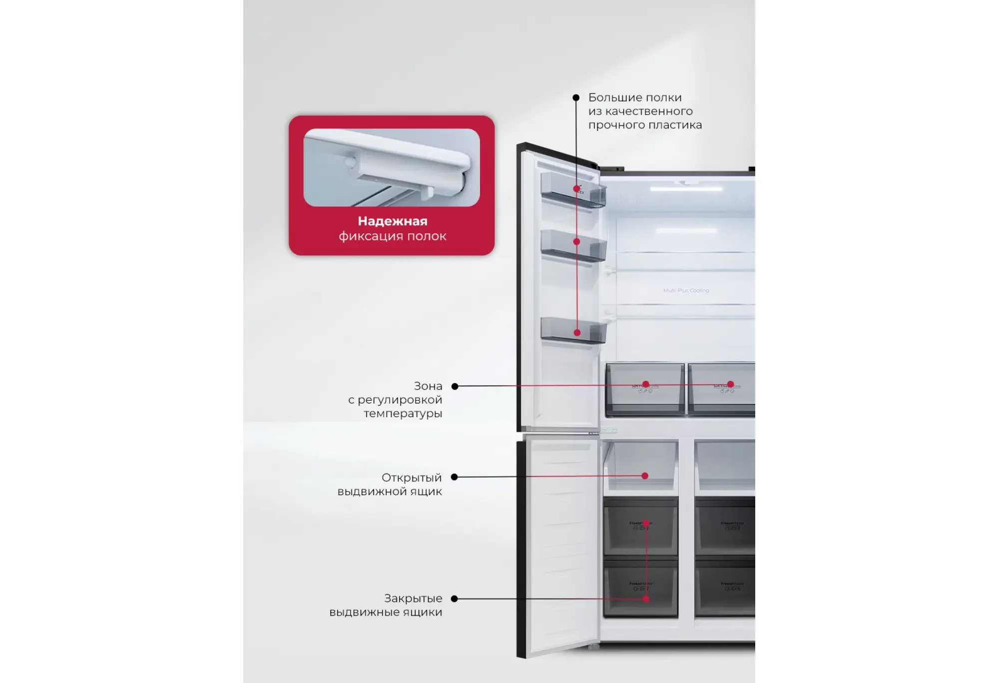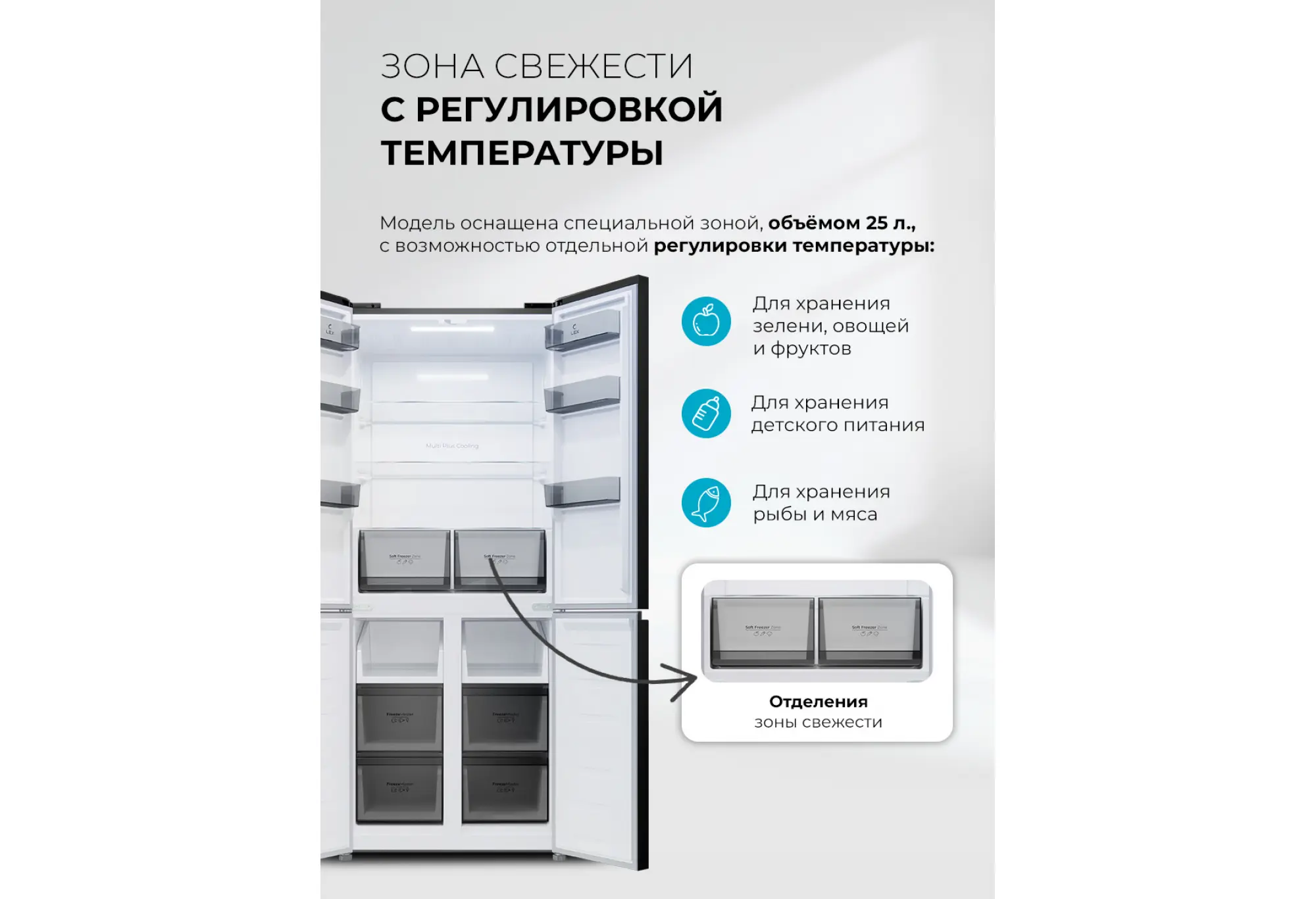 - Зоны с регулировкой температуры и влажности для разных типов продуктов