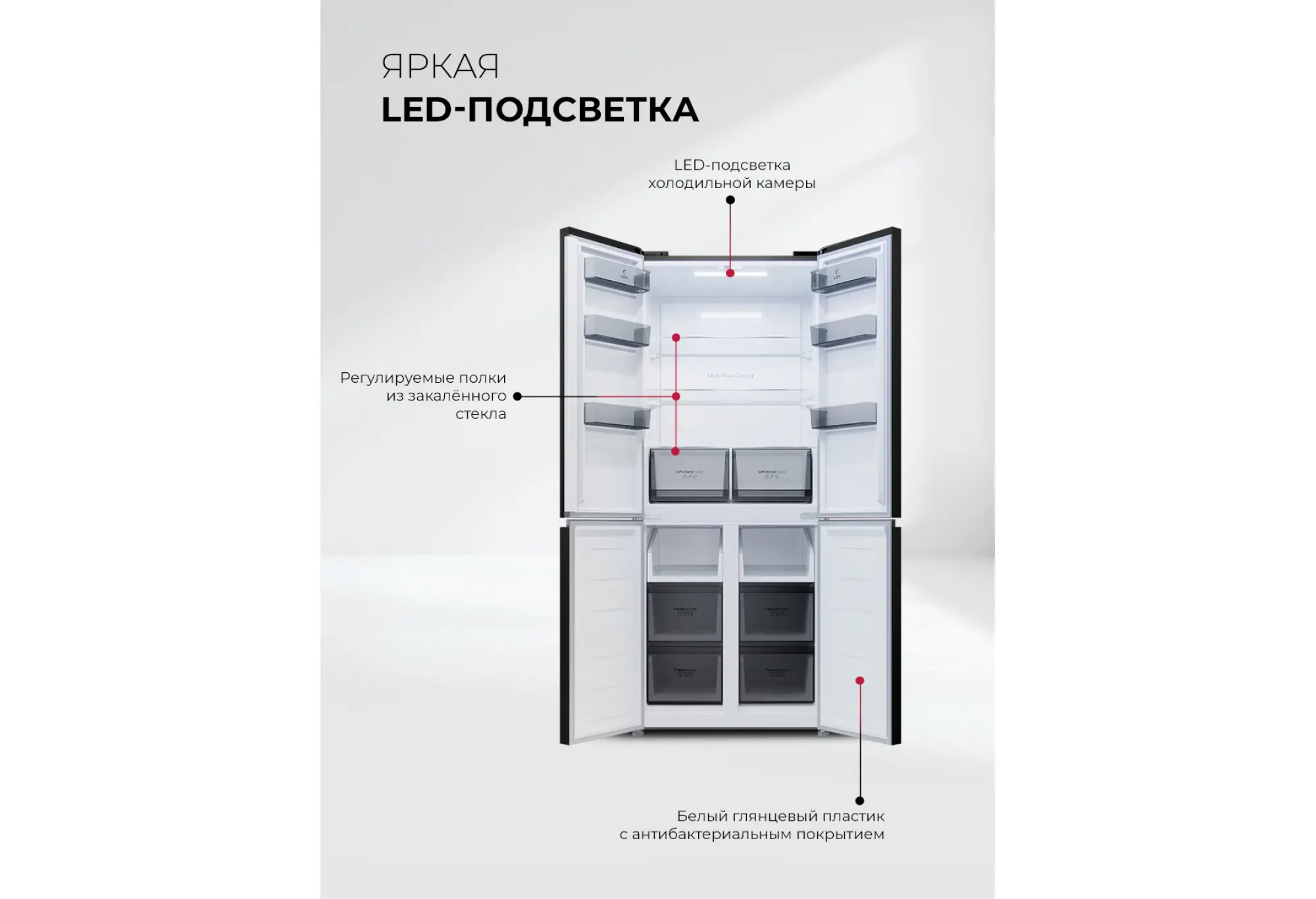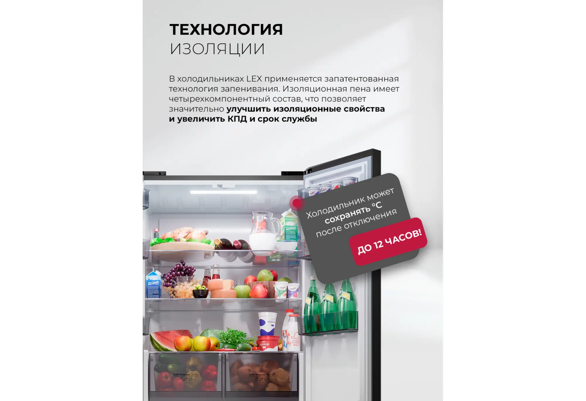 Система No Frost в холодильной и морозильной камерах избавляет от необходимости размораживания и поддерживает равномерное охлаждение. Несколько независимых зон с регулировкой температуры и влажности дают возможность настроить идеальные условия для хранения овощей, фруктов и других продуктов. Режимы суперохлаждения и суперзаморозки удобно использовать после крупных покупок или при заготовке продуктов впрок.