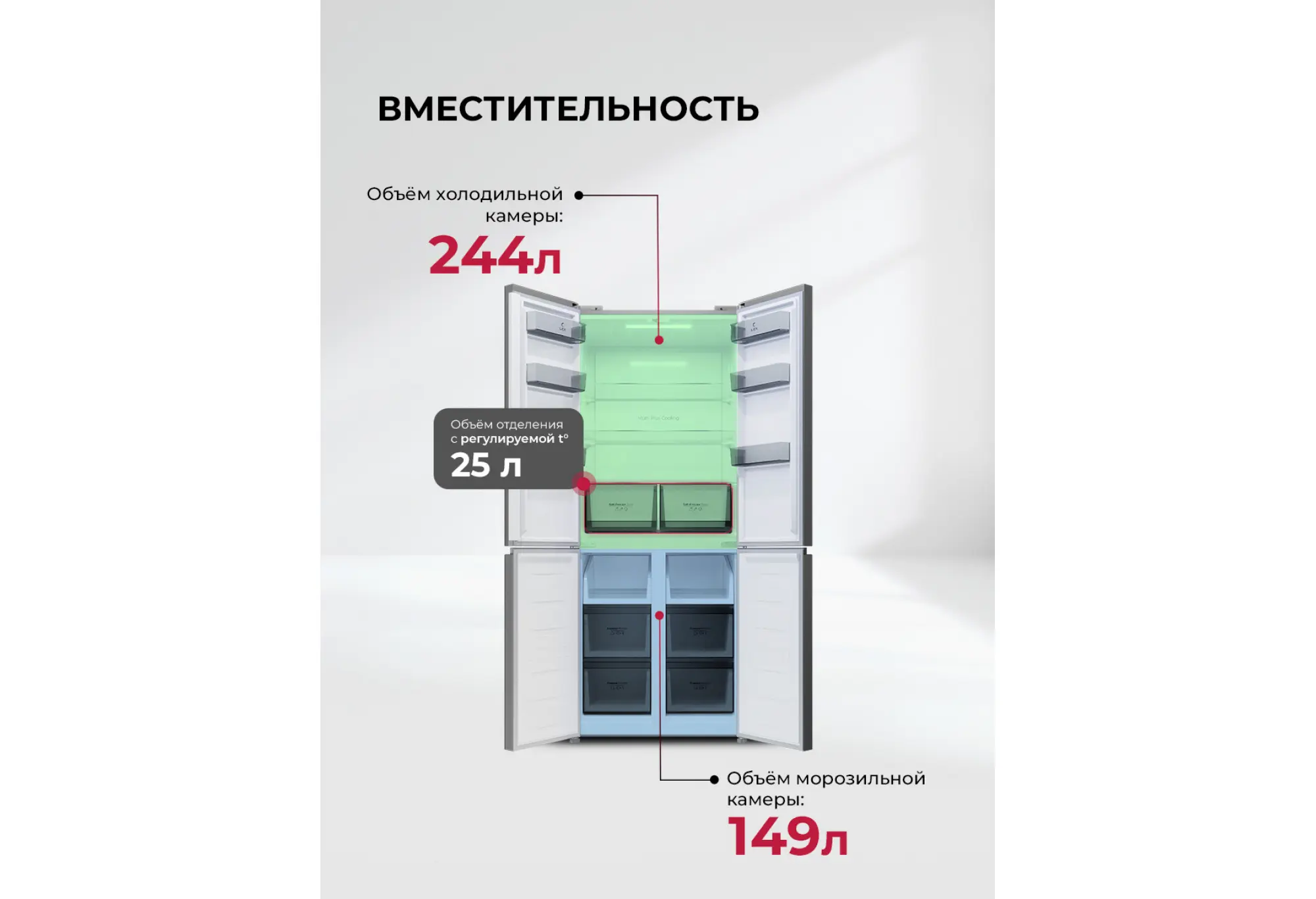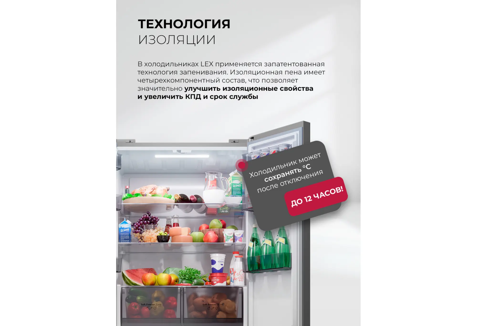 Зоны с независимой регулировкой температуры и влажности помогают поддерживать оптимальные условия для овощей, зелени и фруктов, продлевая срок их хранения. Режимы суперохлаждения и суперзаморозки позволяют быстро охладить или заморозить свежие продукты, сохранив их свойства и внешний вид.
