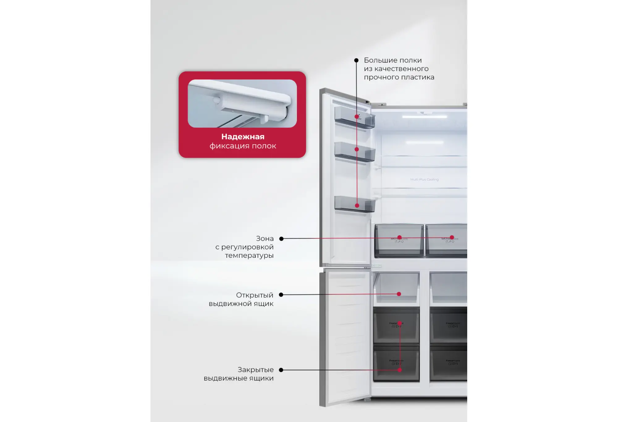 Система No Frost в холодильной и морозильной камерах предотвращает образование наледи и избавляет от необходимости ручной разморозки. Внутреннее пространство организовано за счет трех полок и двух выдвижных зон в холодильной камере, а также шести выдвижных отделений в морозильной — это удобно для раздельного хранения заготовок, полуфабрикатов и продуктов длительного хранения.