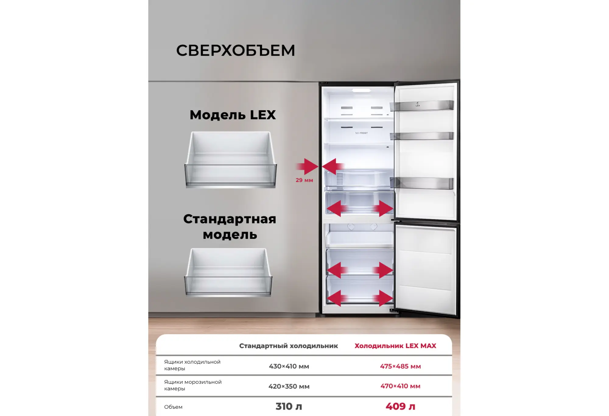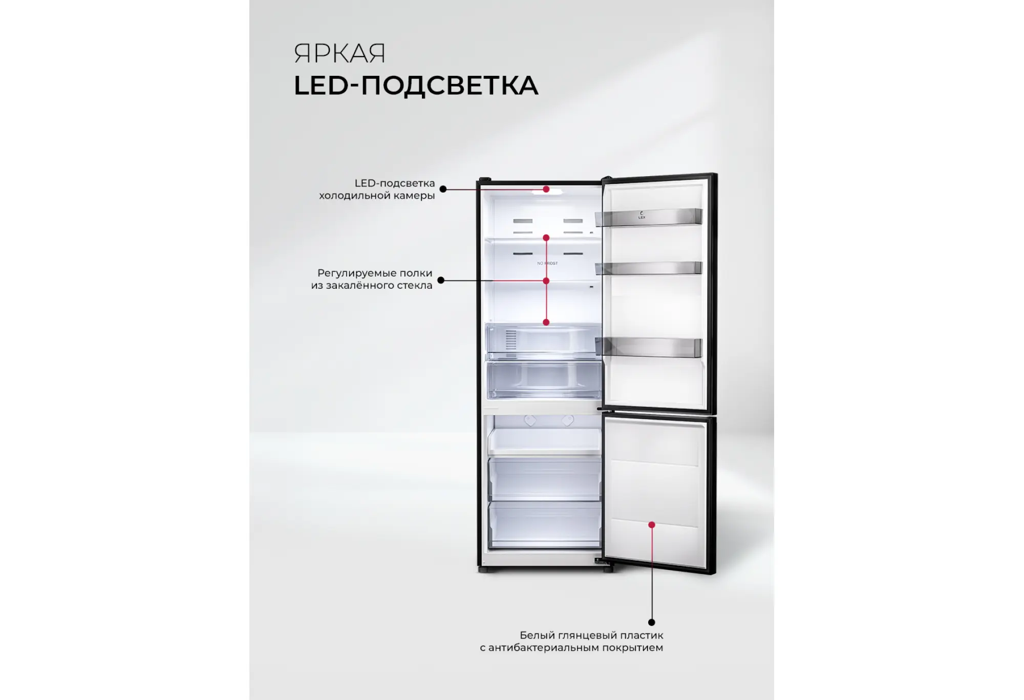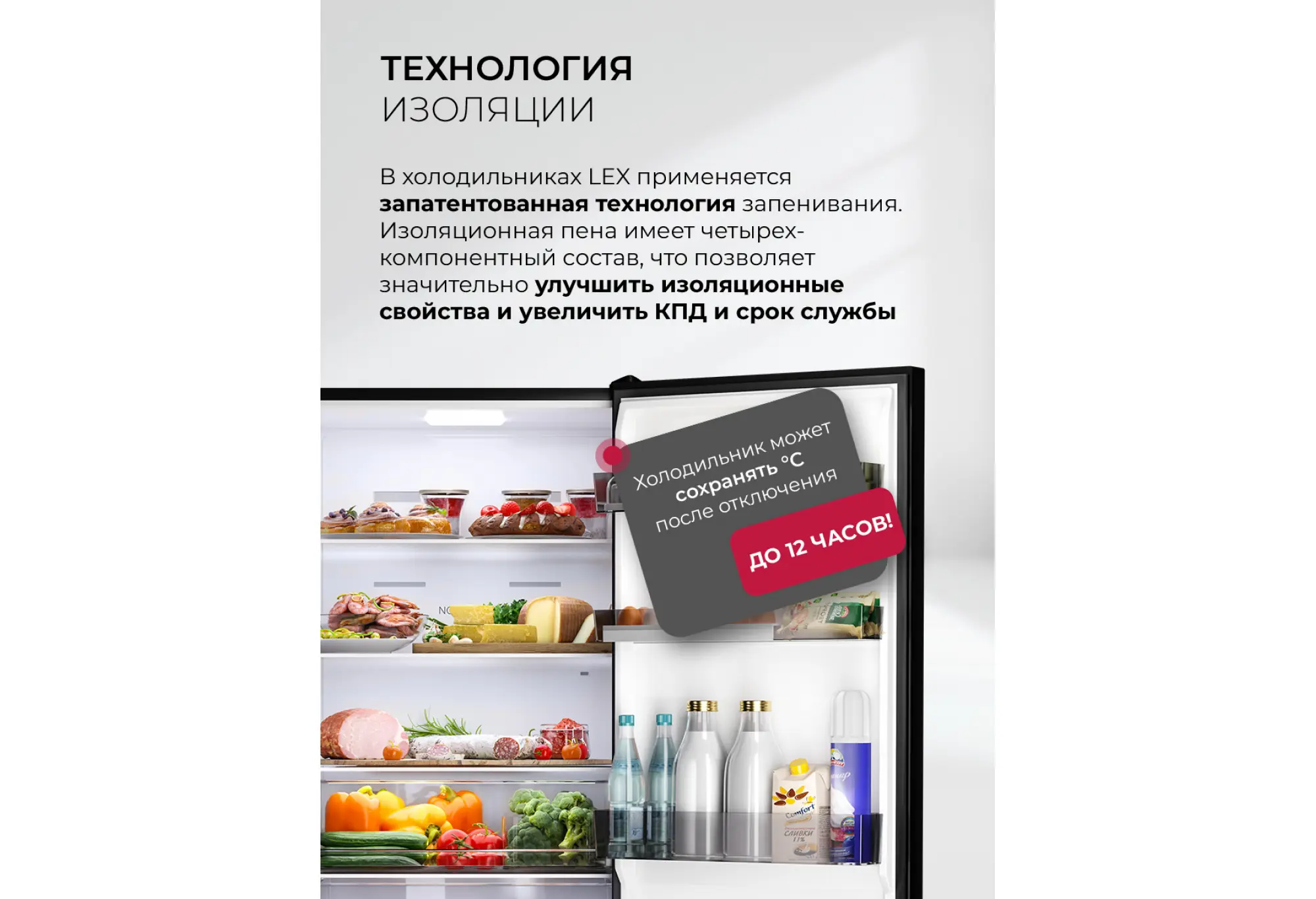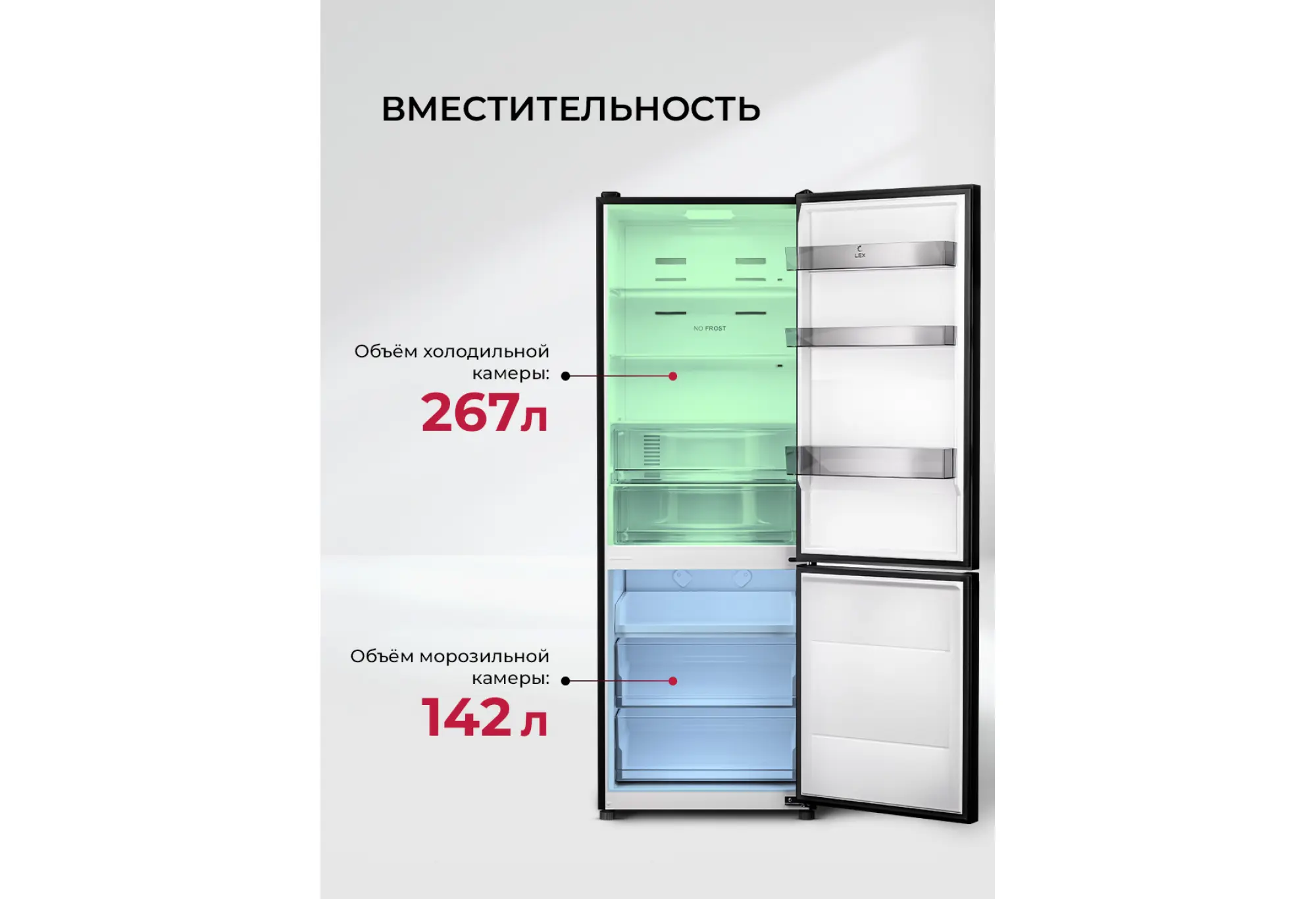 Холодильник LEX LKB185 оснащен современным инверторным компрессором, который гарантирует эффективную и практически бесшумную работу. Он также обеспечивает низкий расход энергии и долго поддерживает температуру без электропитания. Технология Total No Frost значительно упрощает обслуживание и помогает устанавливать оптимальную температуру и влажность.Стильный дизайн модели добавит элегантности в любую кухню.Два отделения с полезным объемом 409 литров дают возможность хранить все блюда и напитки на удобном уровне. Внутреннее пространство холодильника организовано максимально эффективно благодаря регулируемым полкам.LED-лампы обеспечивают яркий свет, помогая вам быстро найти все, что нужно. Электронная панель управления делает настройку параметров интуитивно понятной. А перенавешиваемые двери делают холодильник LEX LKB185 универсальным для любой кухни.
