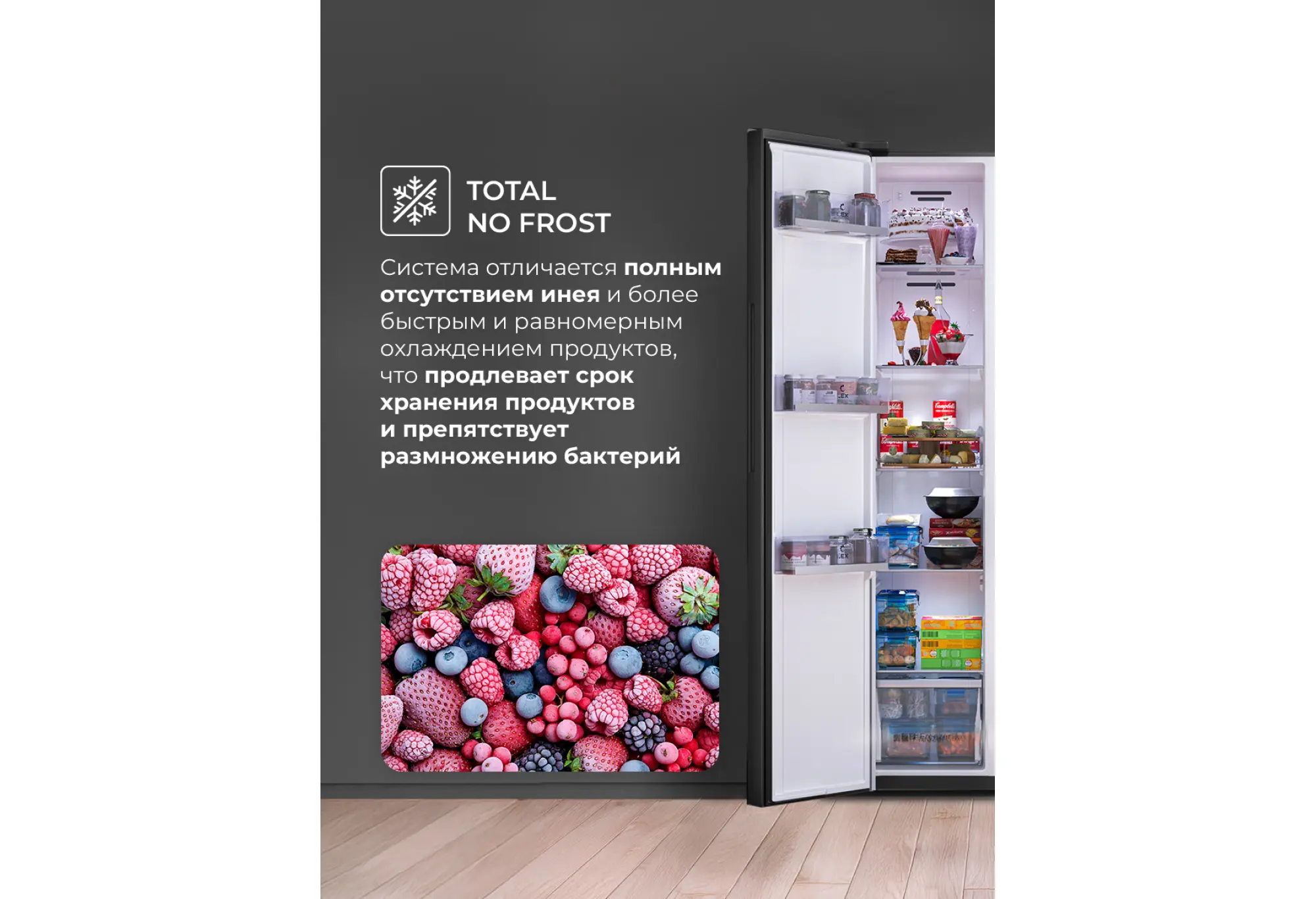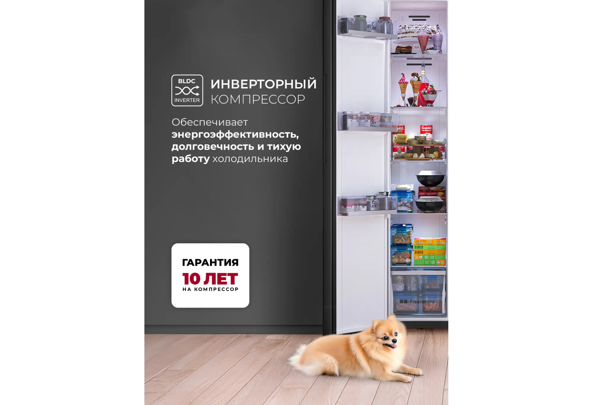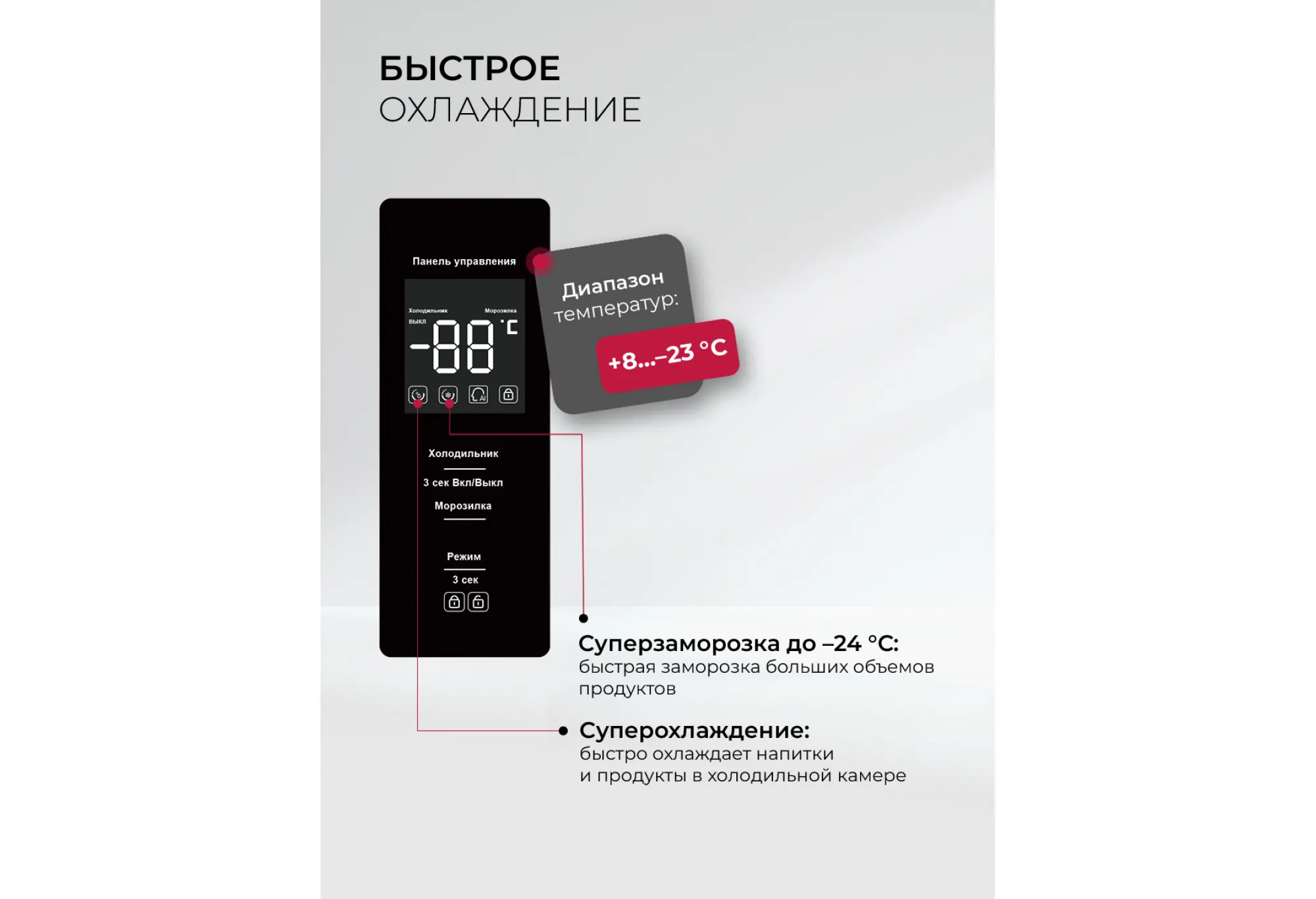 Технология No Frost избавляет от необходимости разморозки, сохраняя свежесть продуктов на более длительный срок. Инверторный компрессор работает тихо и эффективно, потребляя всего 361 кВт в год, что делает этот холодильник экономичным выбором класса энергопотребления А+. Интуитивное электронное управление с русскоязычной панелью предоставляет легкий доступ ко всем функциям прибора, а LED-подсветка равномерно освещает внутреннее пространство.