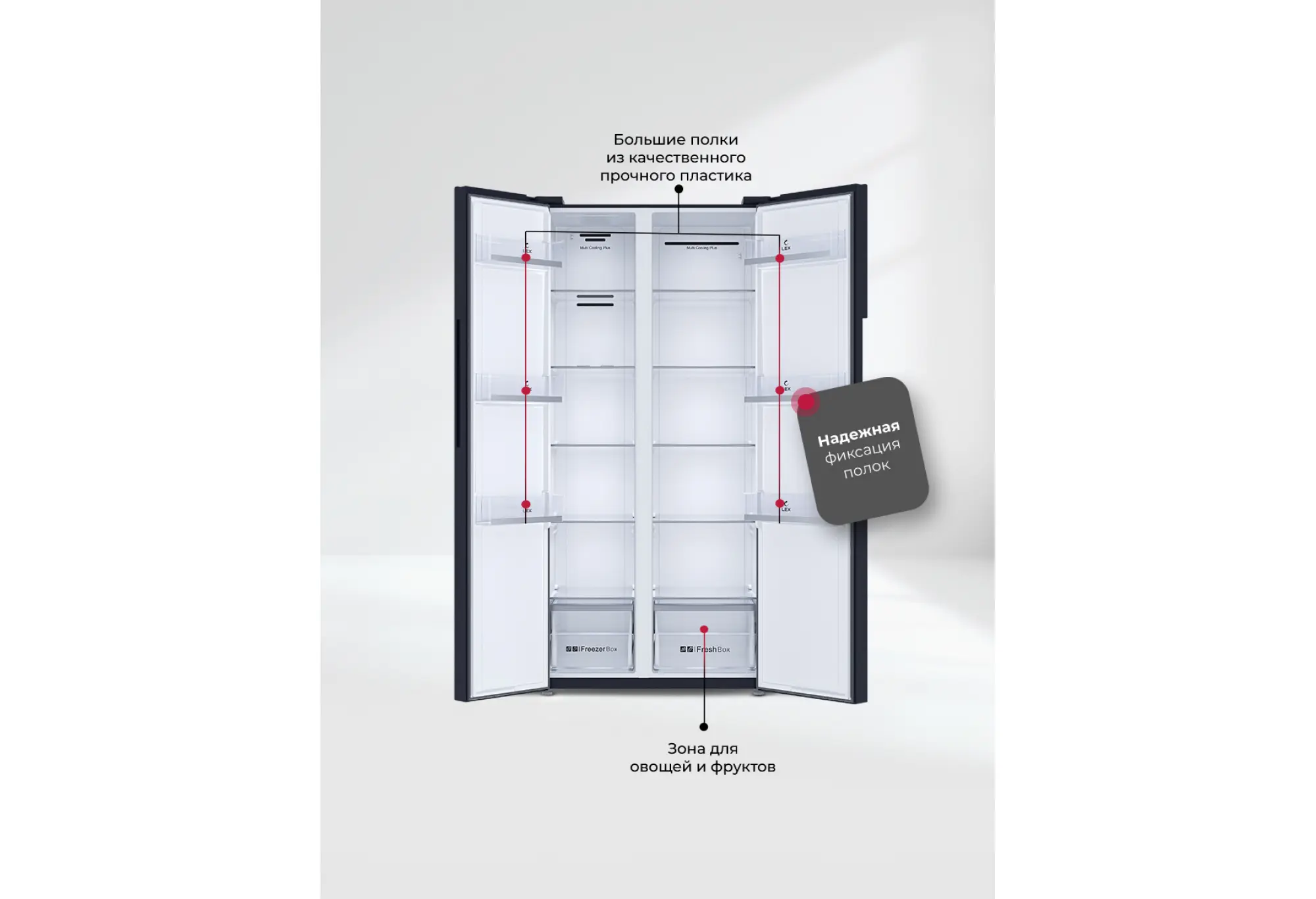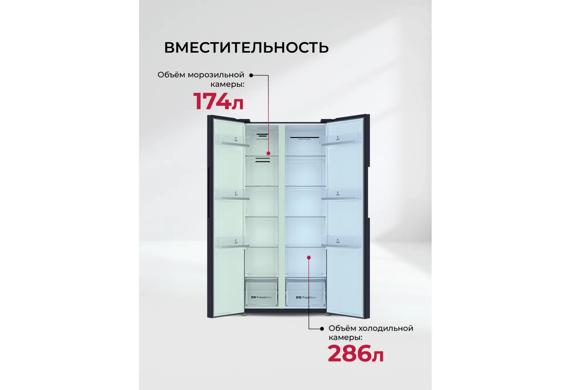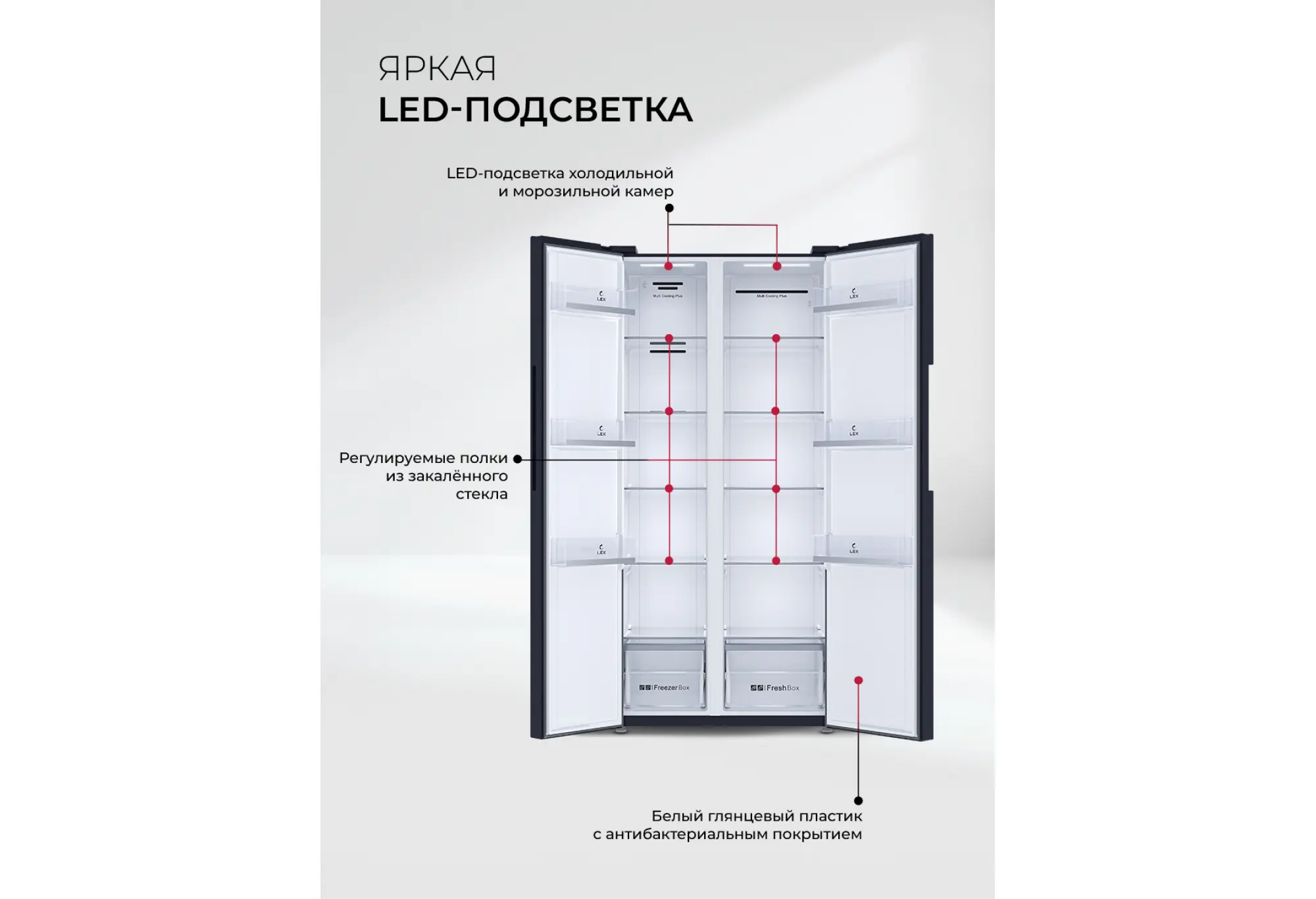 Технология No Frost избавляет от необходимости разморозки, сохраняя свежесть продуктов на более длительный срок. Инверторный компрессор работает тихо и эффективно, потребляя всего 361 кВт в год, что делает этот холодильник экономичным выбором класса энергопотребления А+. Интуитивное электронное управление с русскоязычной панелью предоставляет легкий доступ ко всем функциям прибора, а LED-подсветка равномерно освещает внутреннее пространство.