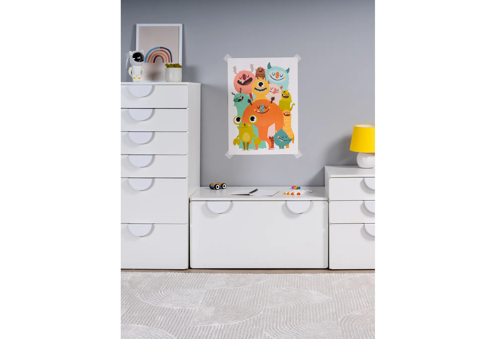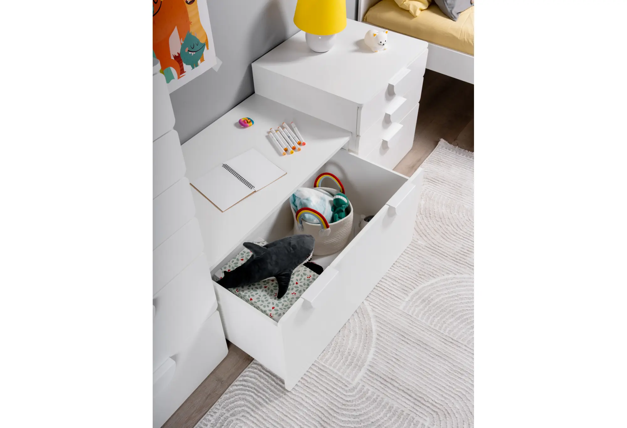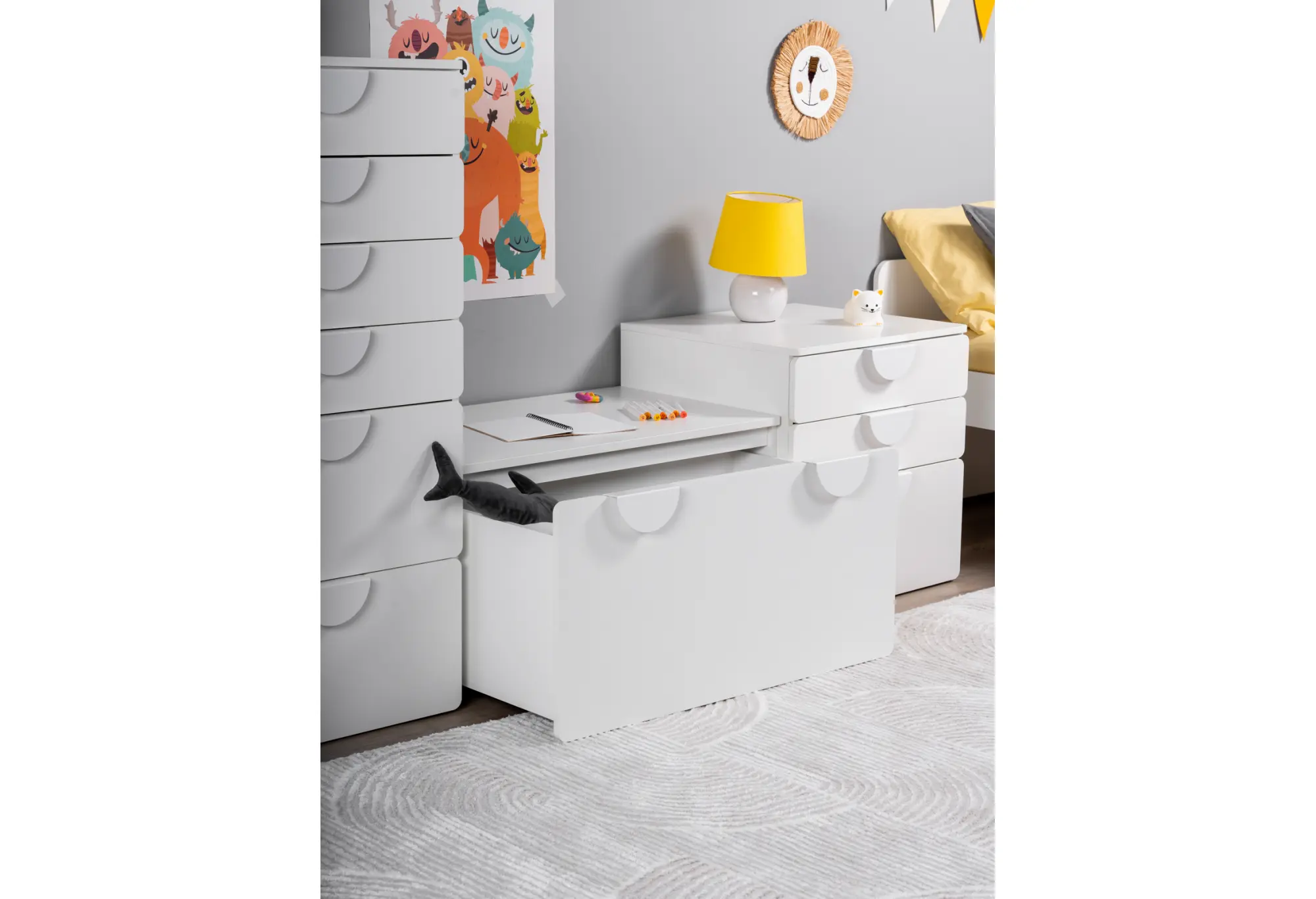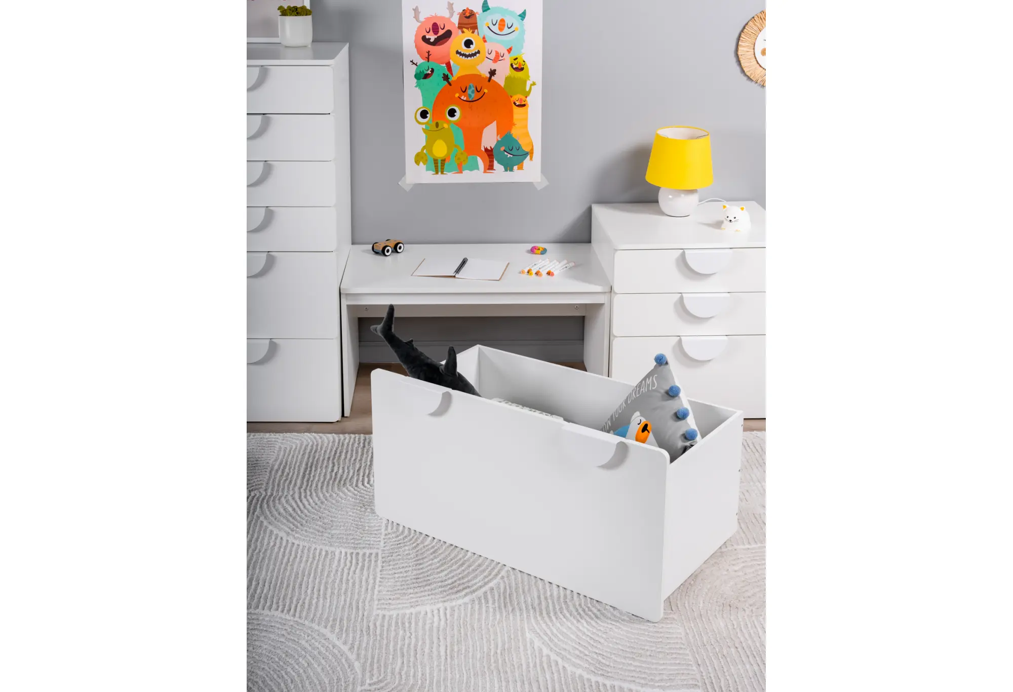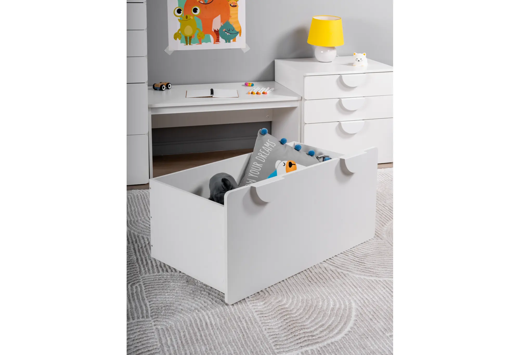 Выкатной ящик ПИКСИ — практичное решение для аккуратного хранения под скамьёй или кроватью. Корпус из прочной ДСП в белом цвете визуально облегчает пространство и легко вписывается в современные интерьеры прихожих, детских и спален.