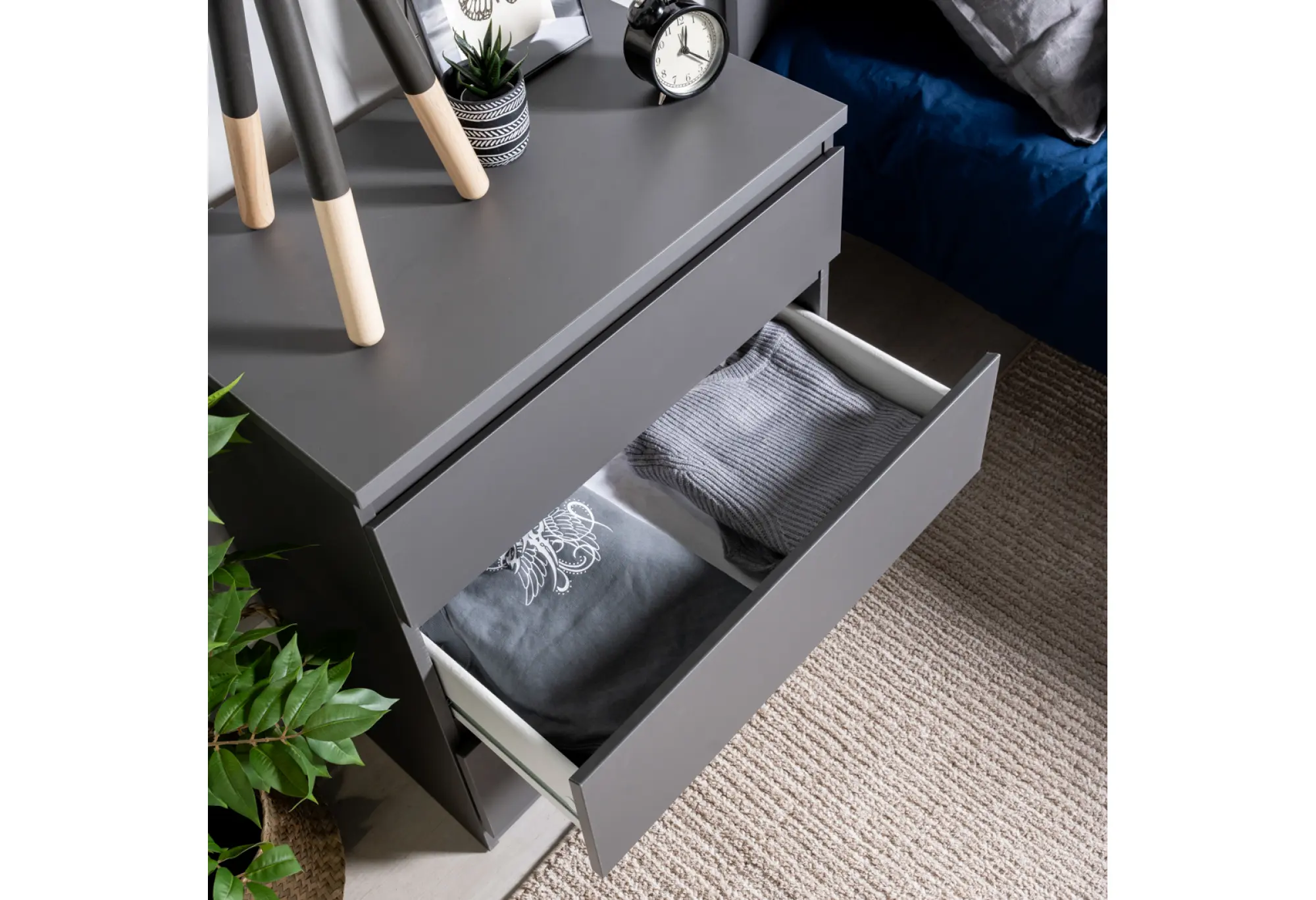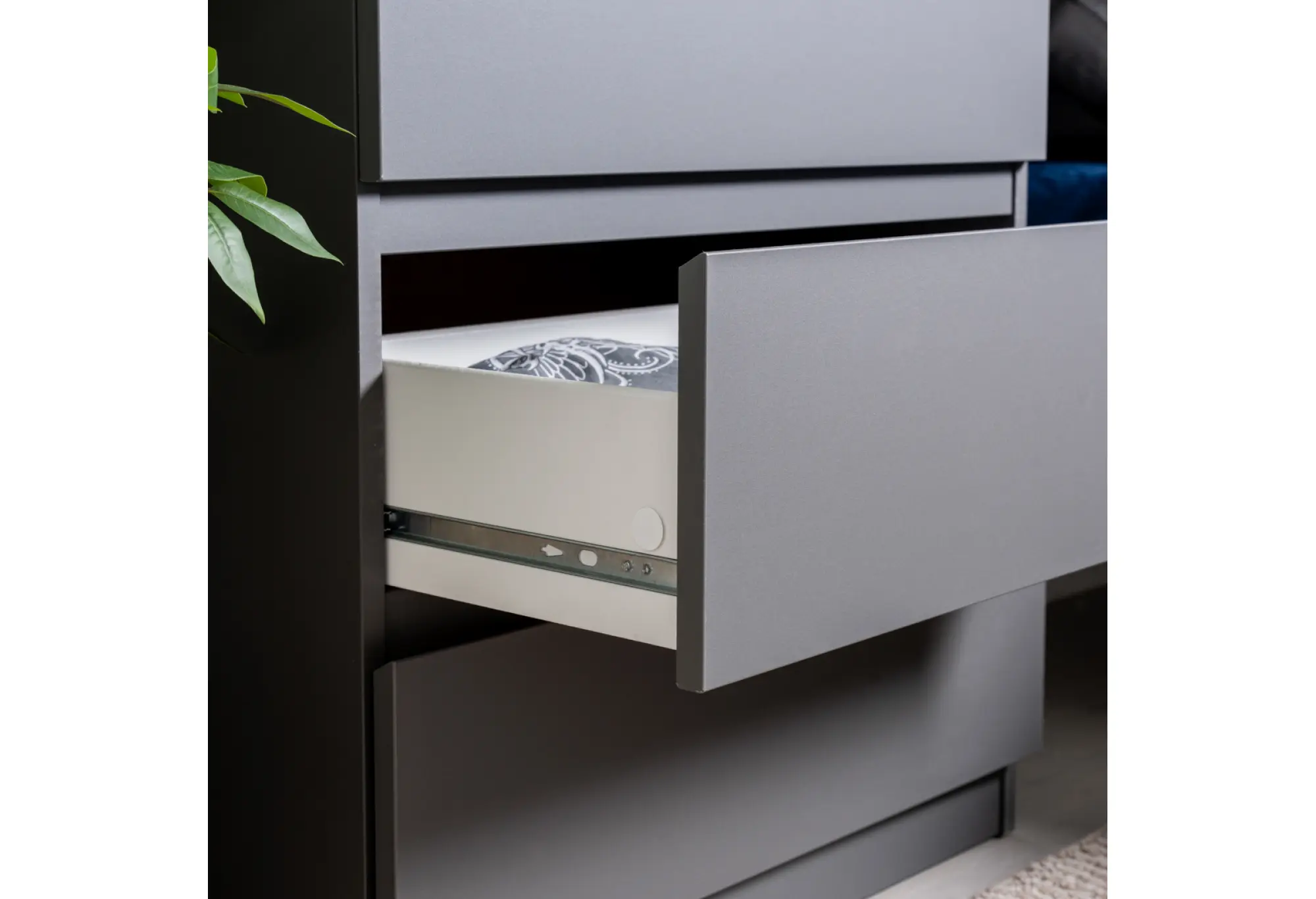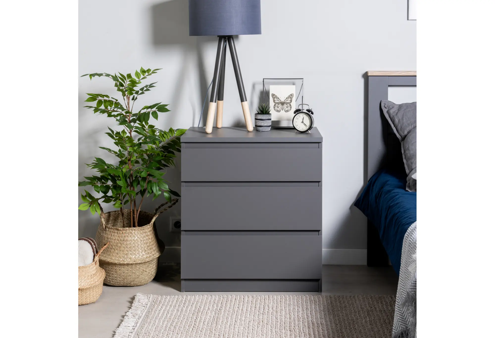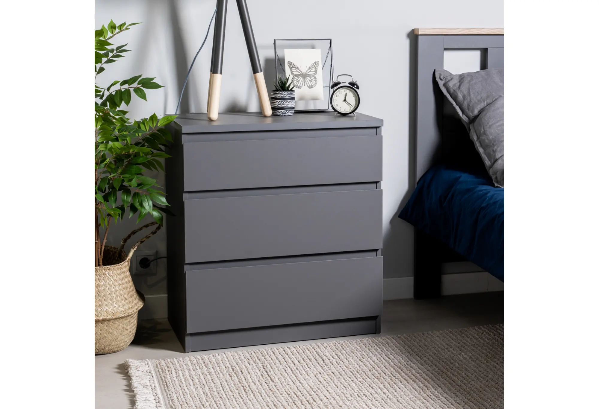Благодаря ширине 650 мм и глубине 396 мм комод не занимает много места и подходит для небольших комнат, прихожих или офисных зон. Высота 716 мм делает его удобным как для размещения вещей в ящиках, так и для использования верхней поверхности под мелкие предметы или офисные принадлежности. Три наружных выдвижных ящика обеспечивают организованное хранение, позволяя легко увидеть и достать содержимое.