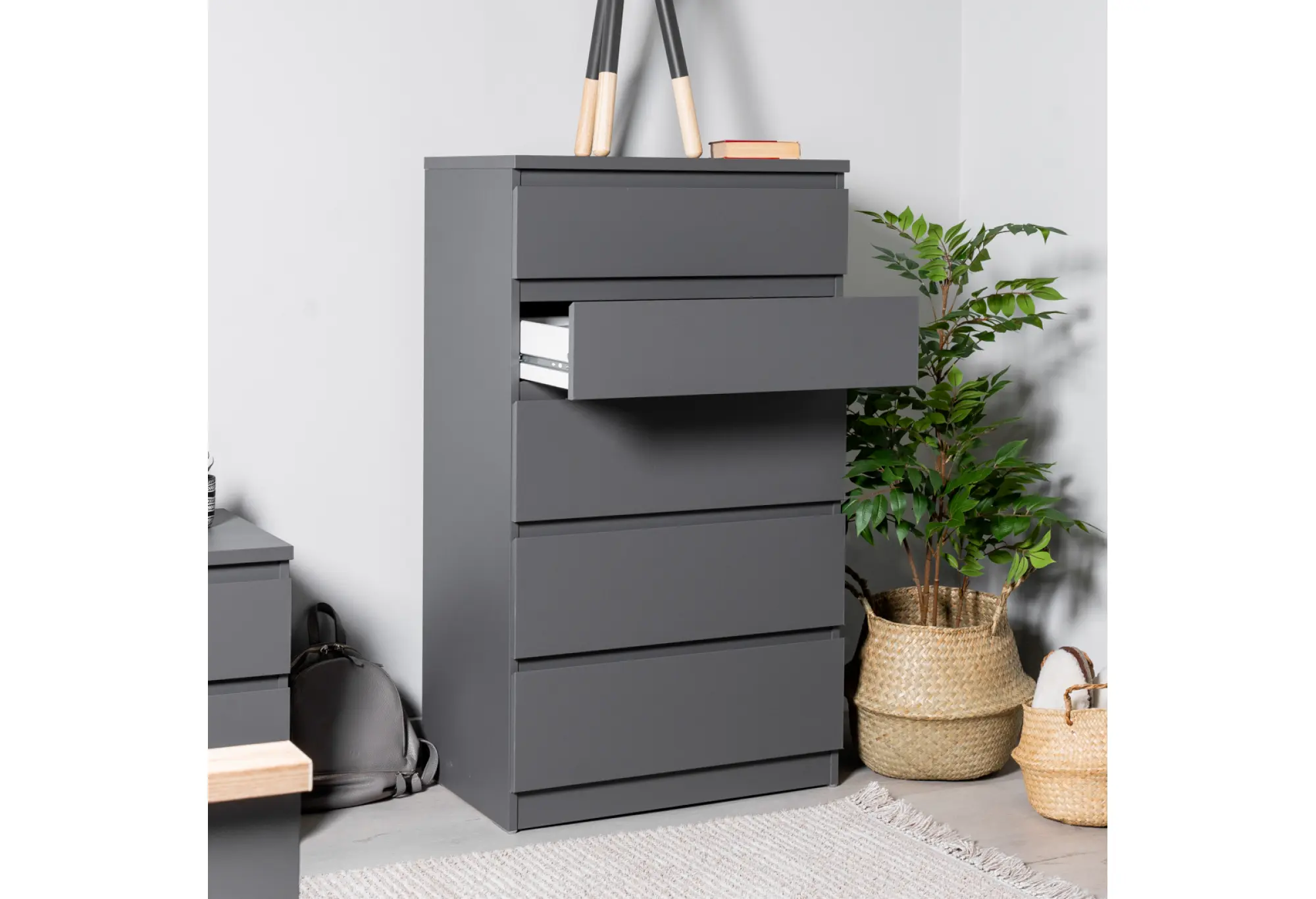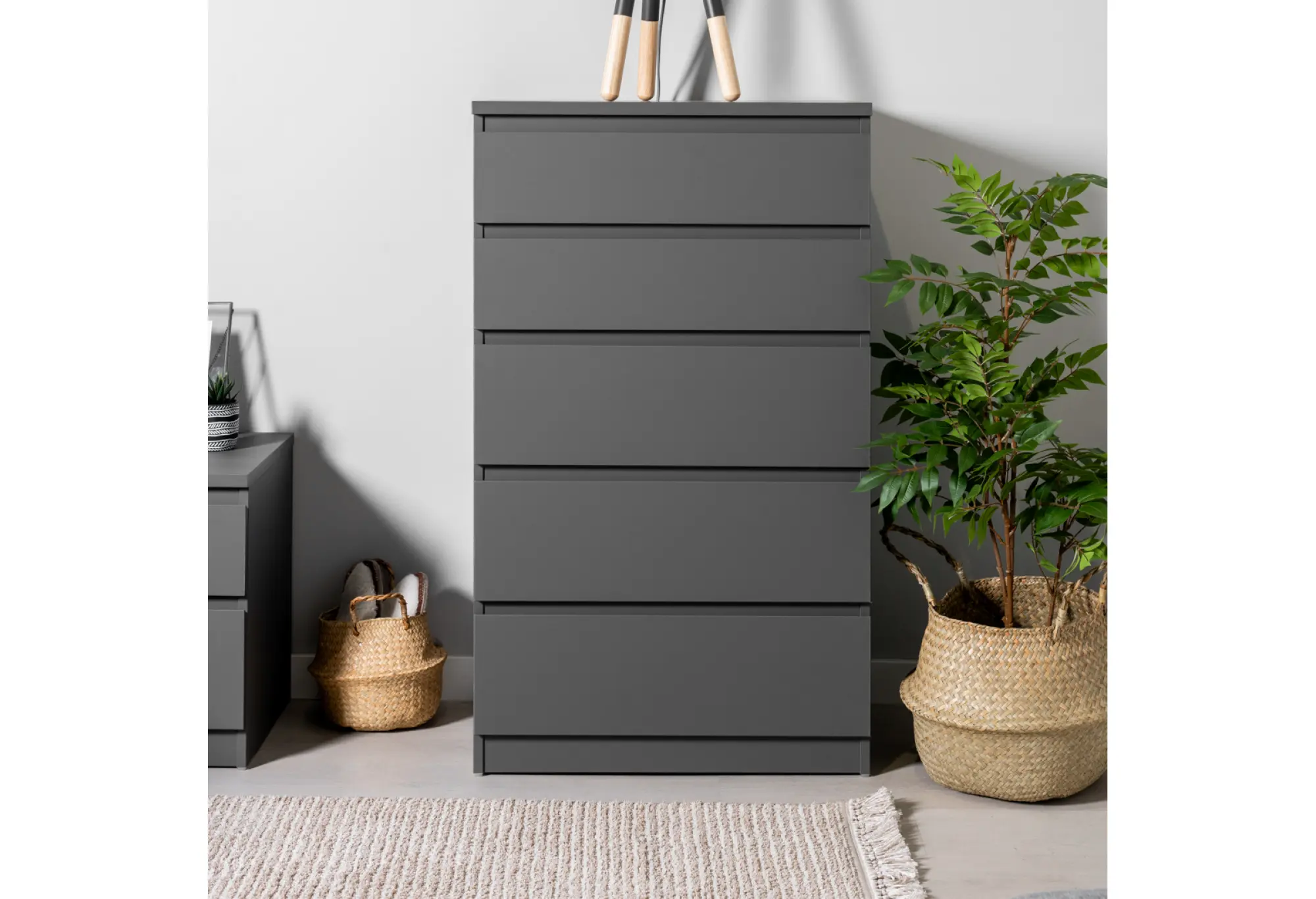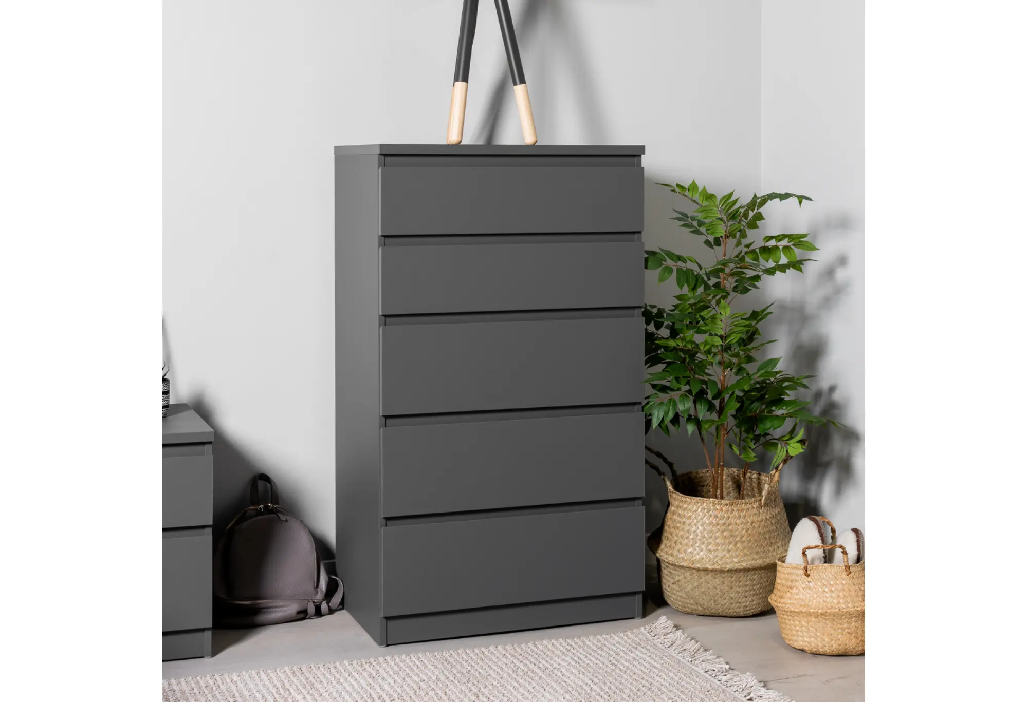Комод КАСТОР в сером цвете — компактное и функциональное решение для хранения в спальне, гостиной или прихожей. Пять выдвижных ящиков позволяют удобно разложить одежду, бельё, документы и мелкие вещи, поддерживая порядок в комнате. Продуманная высота делает комод удобным и для ежедневного использования, и для размещения сверху декора, оргтехники или необходимых под рукой предметов.