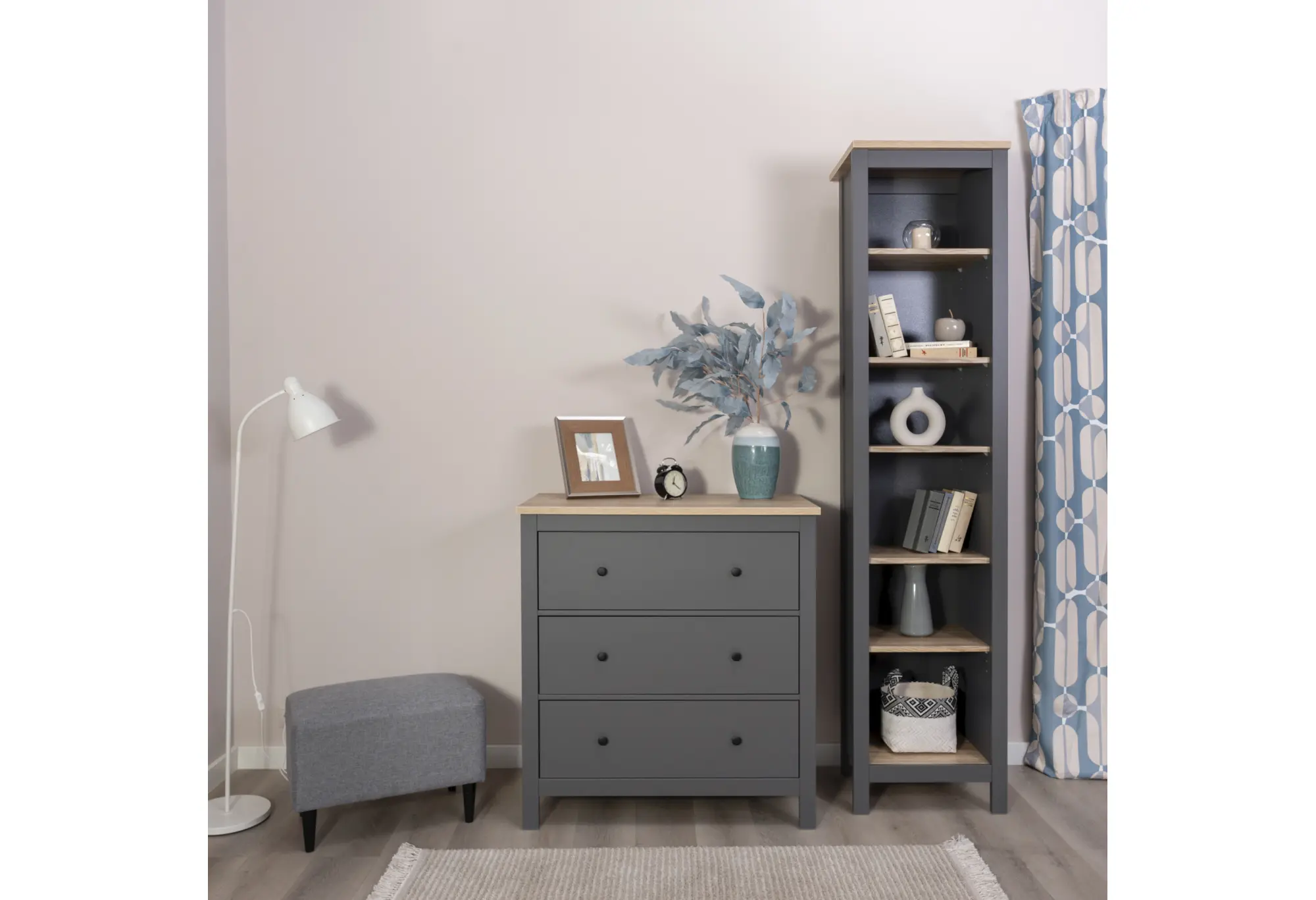 Комод с тремя ящиками из коллекции «САГА» выполнен в сочетании благородного серого цвета и оттенка ясеня. Лаконичный дизайн с ровными фасадами и аккуратными круглыми ручками легко впишется в современный интерьер спальни, гостиной или прихожей. Контрастная столешница под ясень визуально «облегчает» конструкцию и добавляет интерьеру естественных спокойных акцентов.
