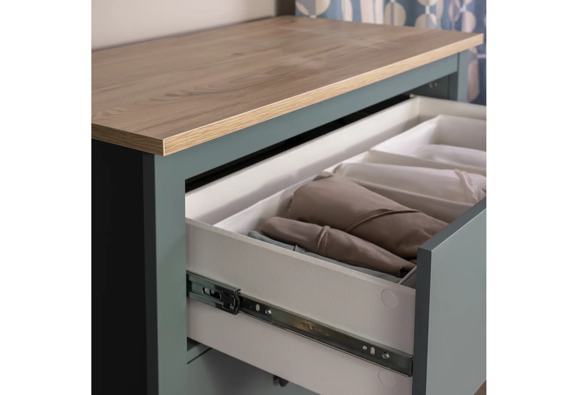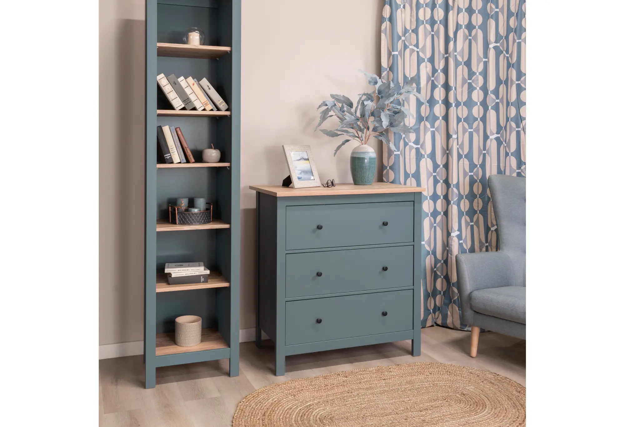 Комод из коллекции «САГА» сочетает лаконичный дизайн и практичность для повседневного использования. Корпус выполнен из ДСП и выдержан в темно-бирюзовом цвете, который визуально подчеркивает строгие прямые линии и аккуратные пропорции. Столешница под ясень создает спокойный контраст и добавляет изделию визуальную теплоту, хорошо вписываясь как в современные интерьеры, так и в более классическое оформление комнаты.