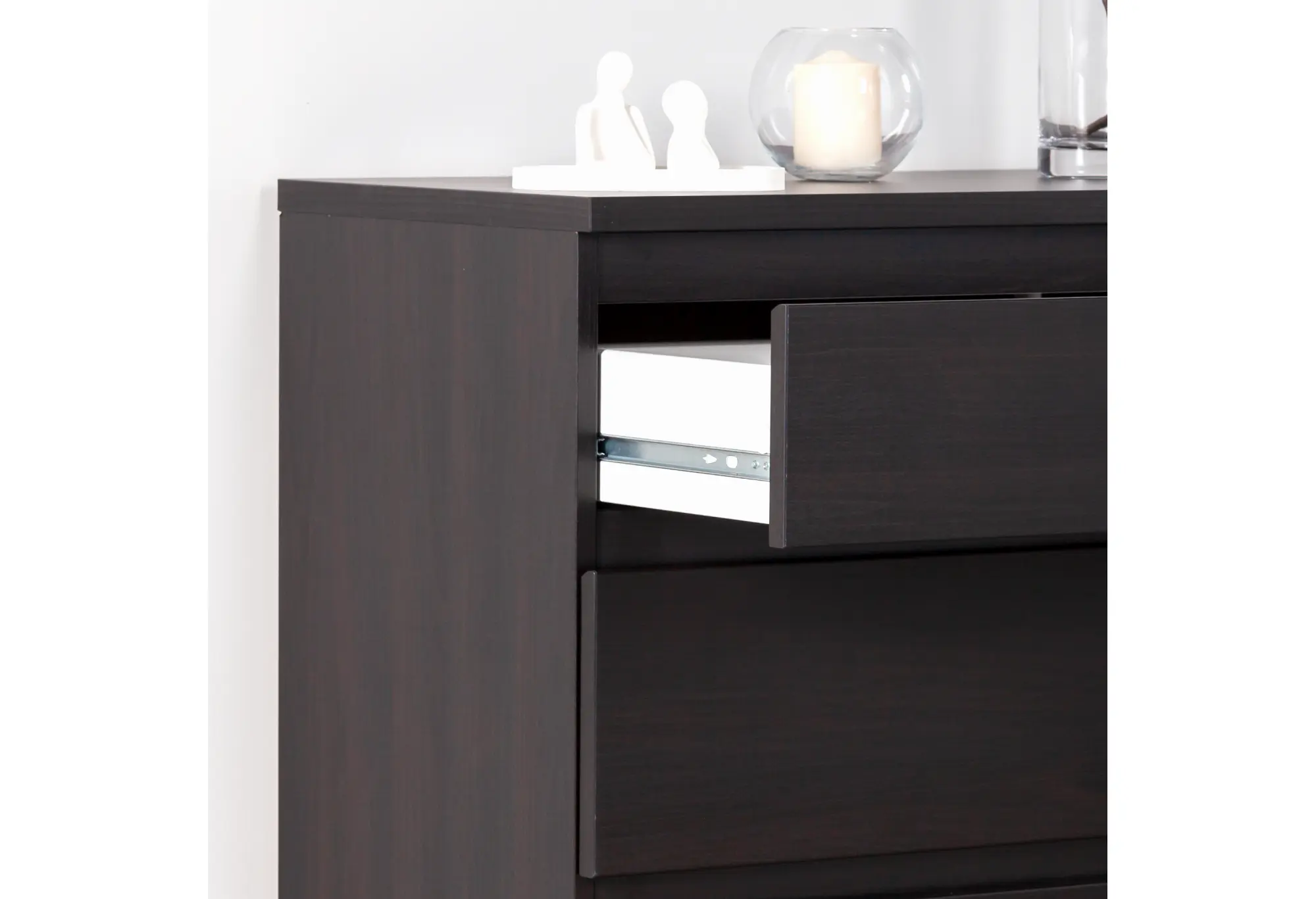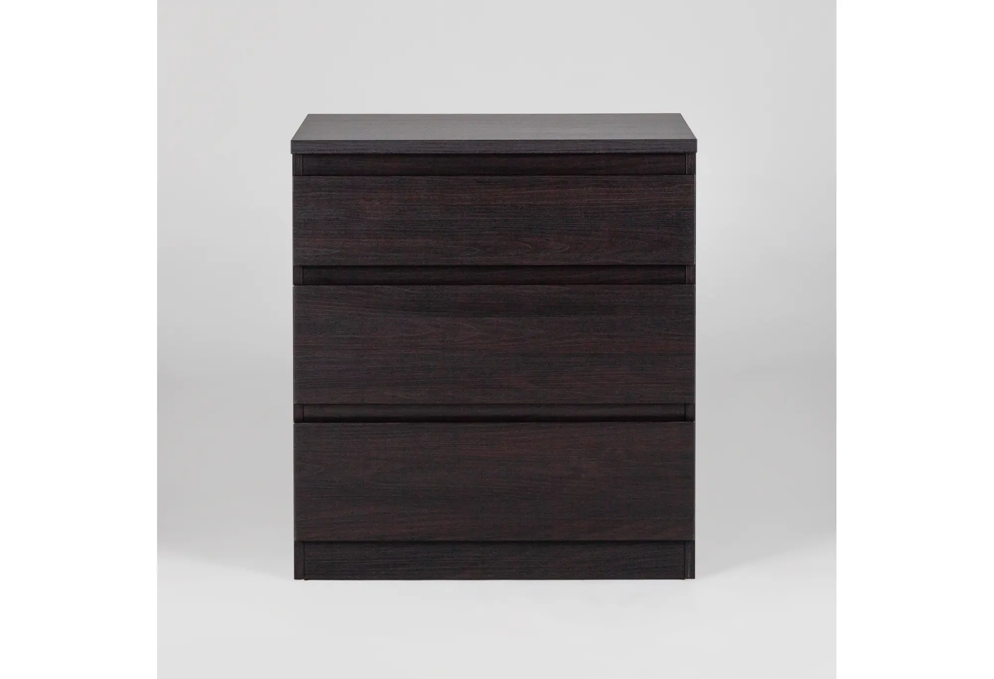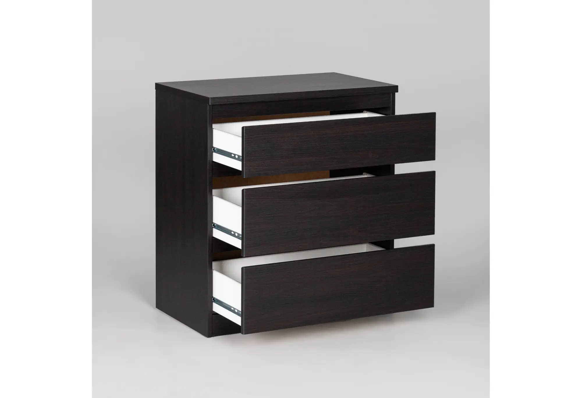 Компактный комод «Кастор» с тремя выдвижными ящиками выполнен из КДСП и окрашен в глубокий черный цвет. Лаконичный прямоугольный корпус без лишнего декора и фурнитуры визуально выглядит аккуратно и современно, легко вписывается как в небольшие комнаты, так и в функциональные зоны спальни, прихожей или кабинета.