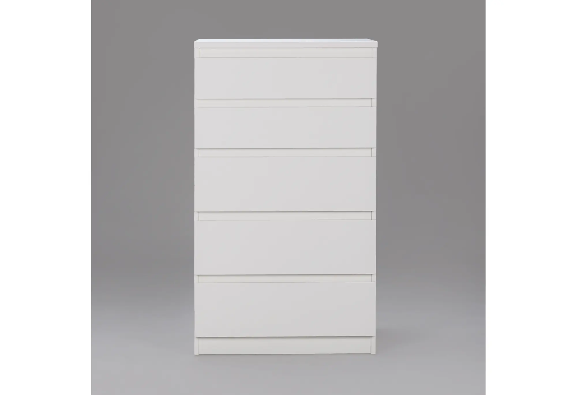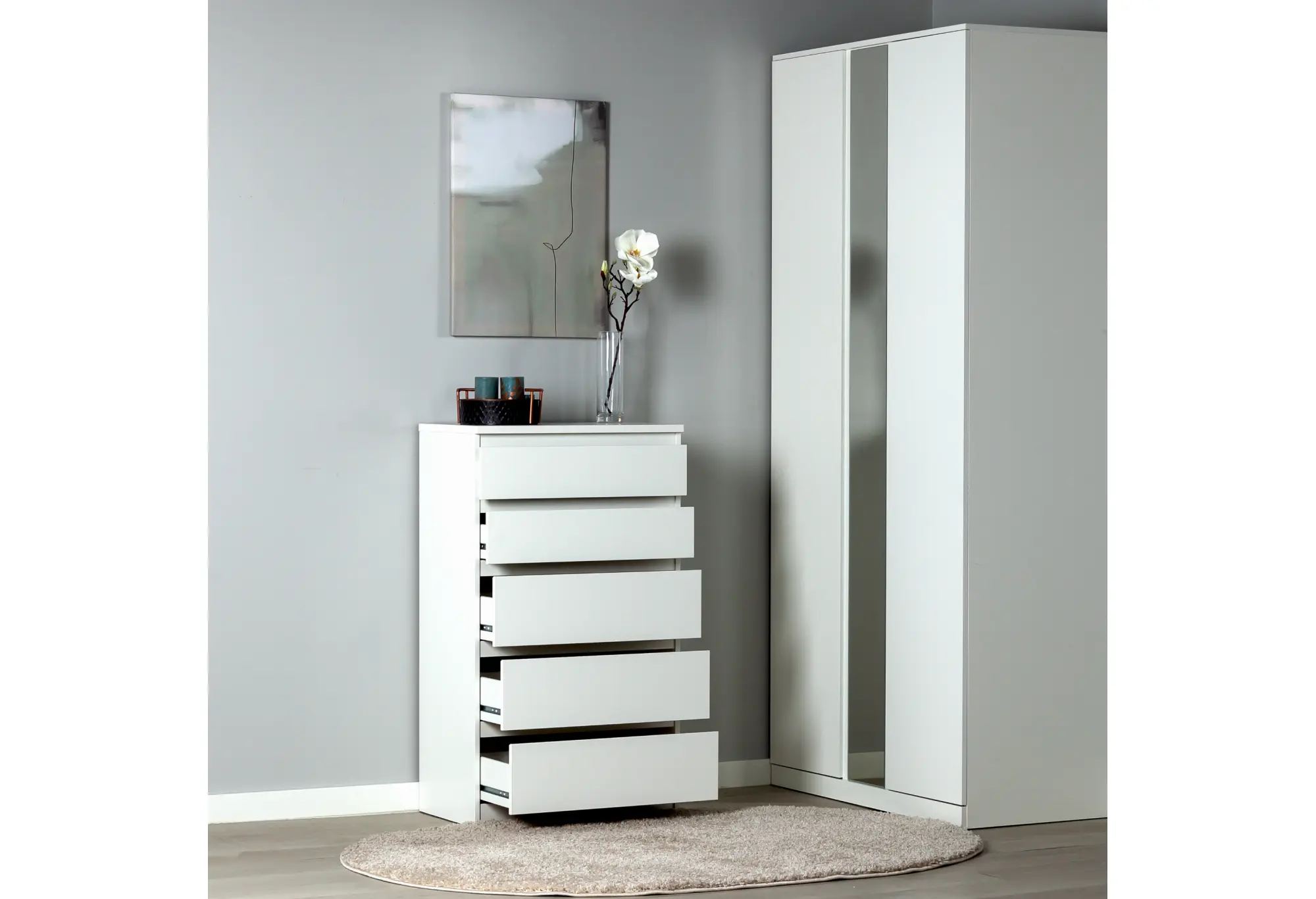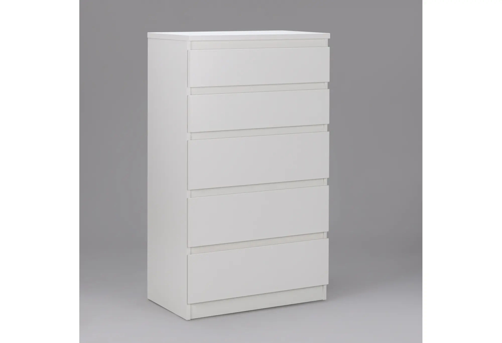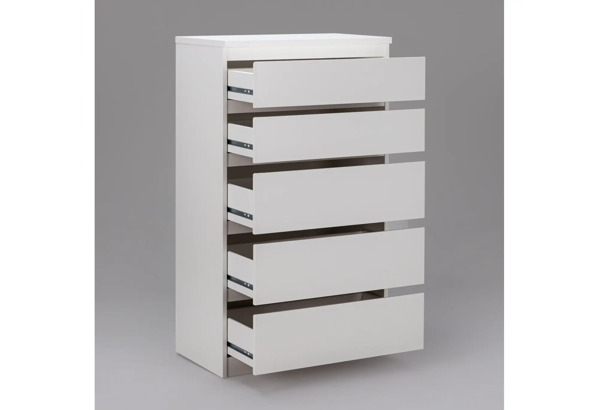 Компактный комод «Кастор» с пятью выдвижными ящиками выполнен в современном лаконичном стиле и полностью выдержан в белом цвете. Прямые линии корпуса и фасадов создают аккуратный, нейтральный внешний вид, который легко впишется в интерьер спальни, прихожей или детской. Поверхность комода образует ровную горизонтальную площадку, которую можно использовать для размещения необходимых предметов или декора.