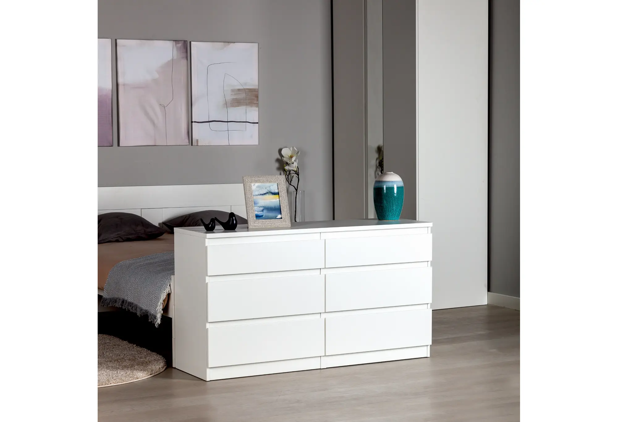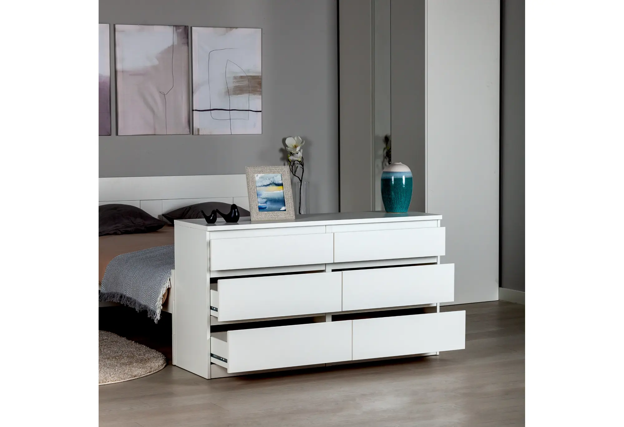 Комод на шесть выдвижных ящиков в белом цвете выполнен из КДСП и рассчитан на ежедневное использование в спальне, гостиной или прихожей. Лаконичный прямоугольный корпус с ровными фасадами без лишнего декора визуально смотрится аккуратно и легко вписывается в современный интерьер. Нейтральный белый цвет делает комод уместным как в светлых, так и в контрастных помещениях, не перегружая пространство.