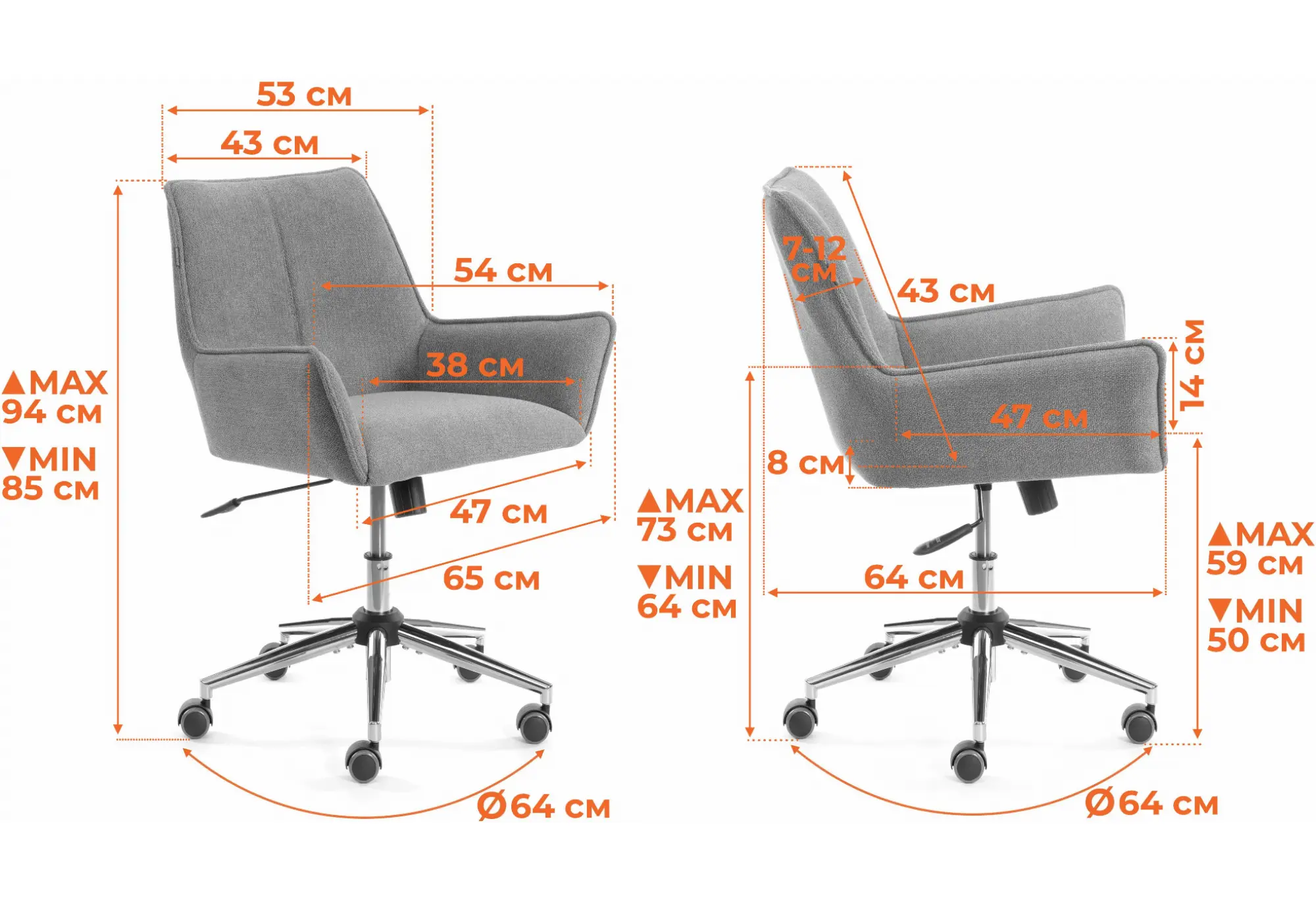 Кресло Murano (Мурано) — это стильное и функциональное решение для офисов, кабинетов и домашних интерьеров. Вот его ключевые характеристики: Основание: Стальная крестовина (разборная) диаметром 640 мм, покрытие — хром, по тесту BIFMA 2. Ролики: с полиуретановым (прорезиненым) покрытием, подходят для паркета и ламината, диаметр 50 мм, шток 11 мм, проходит тест BIFMA 3. Газовый лифт: хромированный, 3 класс, с ходом не менее 90 мм, прошедший тест BIFMA. Механизм: возможность изменения высоты и угла наклона кресла до 15 градусов с фиксацией в рабочем положении и регулировкой под вес пользователя. Подлокотники: фиксированные, задрапированные, обеспечивают дополнительный комфорт. Наполнение: сиденье: фанера 10 мм, комбинация рециклированного ППУ высокой плотности (60 кг/м³) и первичного ППУ плотностью не менее 22 кг/м³. спинка: каркас из металла, наполнение из первичного ППУ плотностью не менее 22 кг/м³. Обивка: велюр/букле HYP, износоустойчивая ткань, 50,000 циклов по тесту Мартиндейла. Вес: нето 11,25 кг, брутто 13,55 кг. Максимальный вес пользователя — до 120 кг. Кресло Murano сочетает в себе современный дизайн с проверенной качеством, что делает его отличным выбором для различных интерьеров.