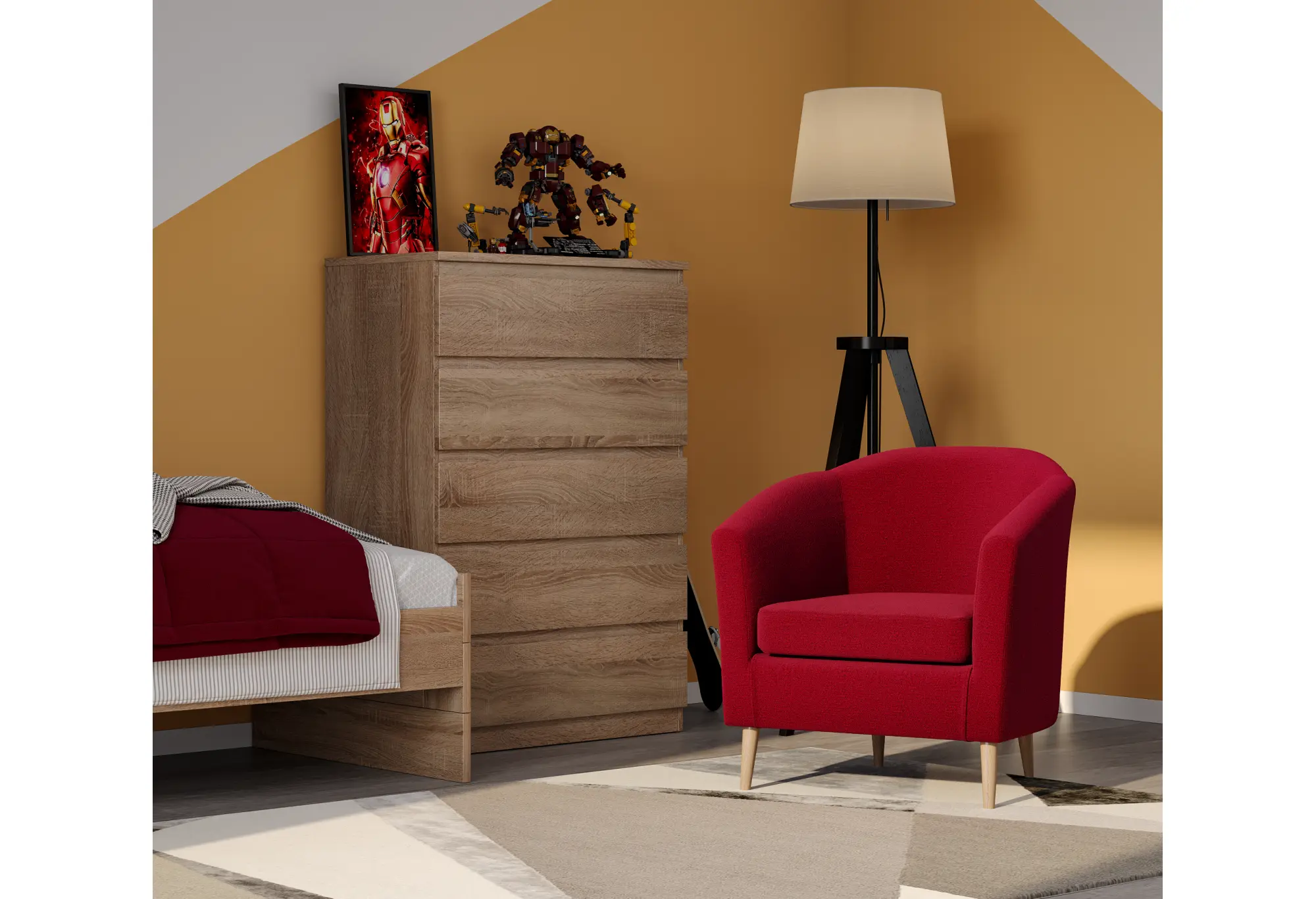 Кресло для отдыха «Тунне» в бордовом цвете создаёт уютный акцент в гостиной, спальне или зоне ожидания. Компактные габариты 780×675×760 мм позволяют удобно разместить его даже в ограниченном пространстве, при этом посадка остаётся визуально и физически комфортной. Обтекаемая спинка в форме ракушки плавно переходит в подлокотники, поддерживая корпус по бокам и формируя удобную зону для отдыха.