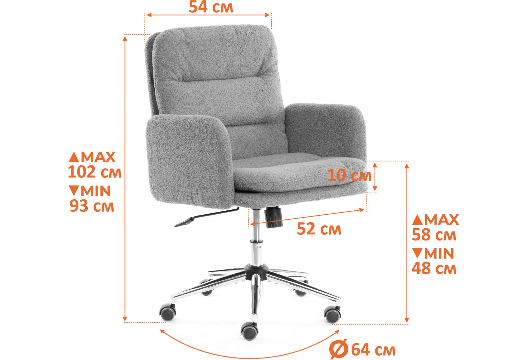 Кресло Dover представляет собой отличное решение для офисного пространства благодаря сочетанию стиля, функциональности и комфорта. Рассмотрим некоторые ключевые характеристики и их преимущества: 1. Основание: Стальная крестовина с хромированным покрытием обеспечивает прочность и устойчивость, а разборная конструкция упрощает транспортировку и установку. Соответствие стандарту BIFMA гарантирует долговечность и безопасность использования. 2. Ролики: Полиуретановые ролики с прорезиненным покрытием подходят для различных полов, включая паркет и ламинат, что предотвращает их повреждение и минимизирует шум при движении 3. Газовый лифт: Возможность регулировки высоты сидения на 90 мм позволяет подстроить кресло под рост пользователя, что важным образом влияет на его комфорт и производительность. 4. Механизм регулировки: Удобная регулировка угла наклона кресла и возможность фиксирования в рабочем положении создают оптимальные условия для рабочего процесса, снижая нагрузку на спину. 5. Подлокотники: Фиксированные подлокотники обтянуты тканью, что добавляет дополнительный комфорт и поддерживает правильную осанку. 6. Наполнение: Комбинация фанеры и первичного ППУ с различной плотностью обеспечивает поддержку и комфорт во время длительного сидения. 7. Обивка: Износостойкая ткань букле с высокой стойкостью по тесту Мартиндейла (80,000 циклов) делает кресло долговечным, устойчивым к износу и легким в уходе. 8. Вес: Низкий вес кресла в 17,5 кг (нетто) делает его легким для перемещения, что удобно для динамичных офисных пространств. 9. Максимальный вес пользователя: Кресло рассчитано на пользователей весом до 120 кг, что расширяет его круг применения и подходит для большинства пользователей. В совокупности, кресло Dover отлично подходит как для домашнего, так и для офисного использования, обеспечивая не только эстетический вид, но и комфорт на протяжении всего рабочего дня.
