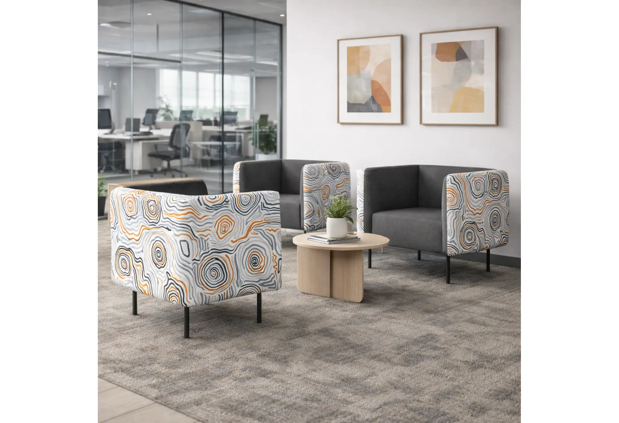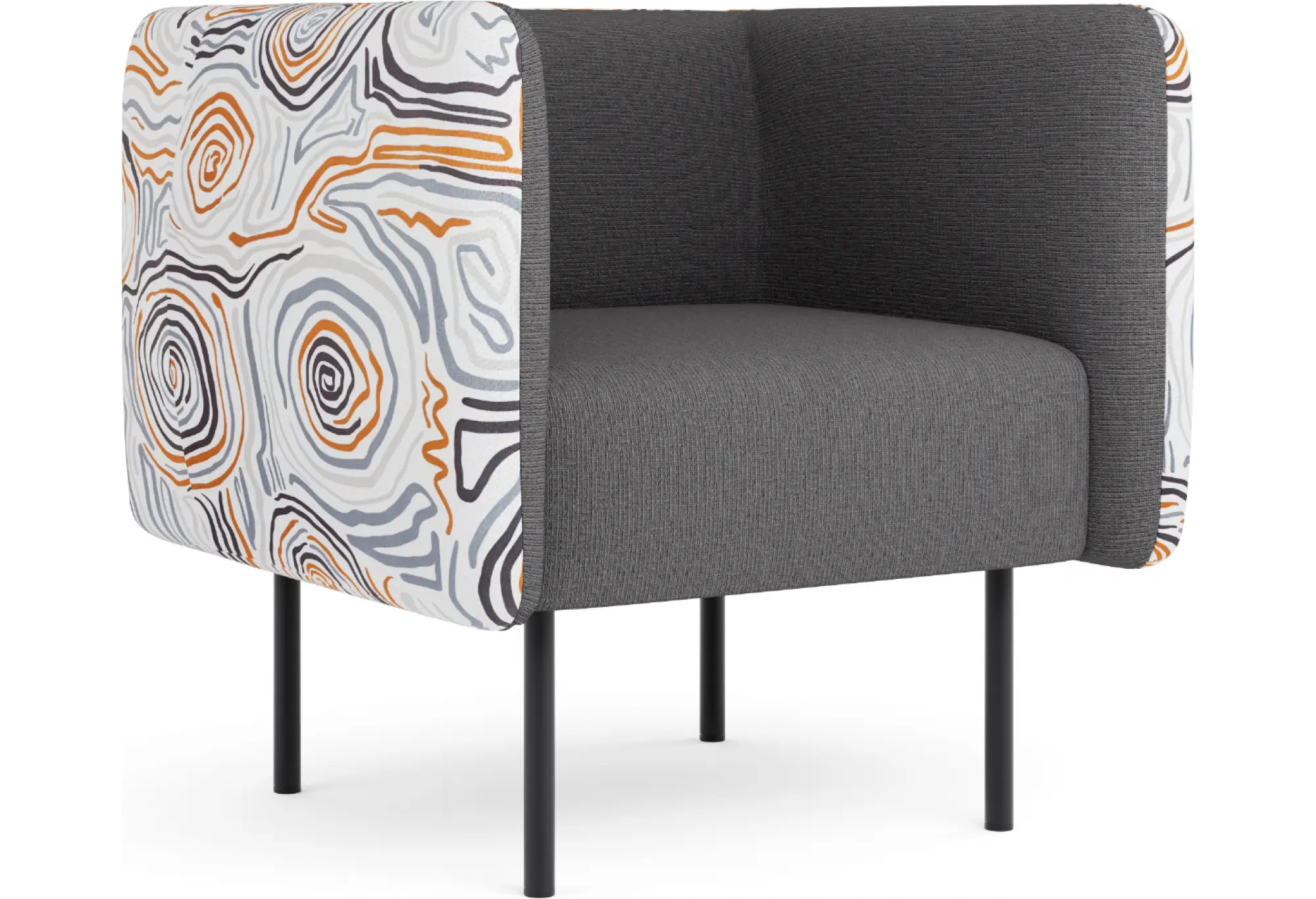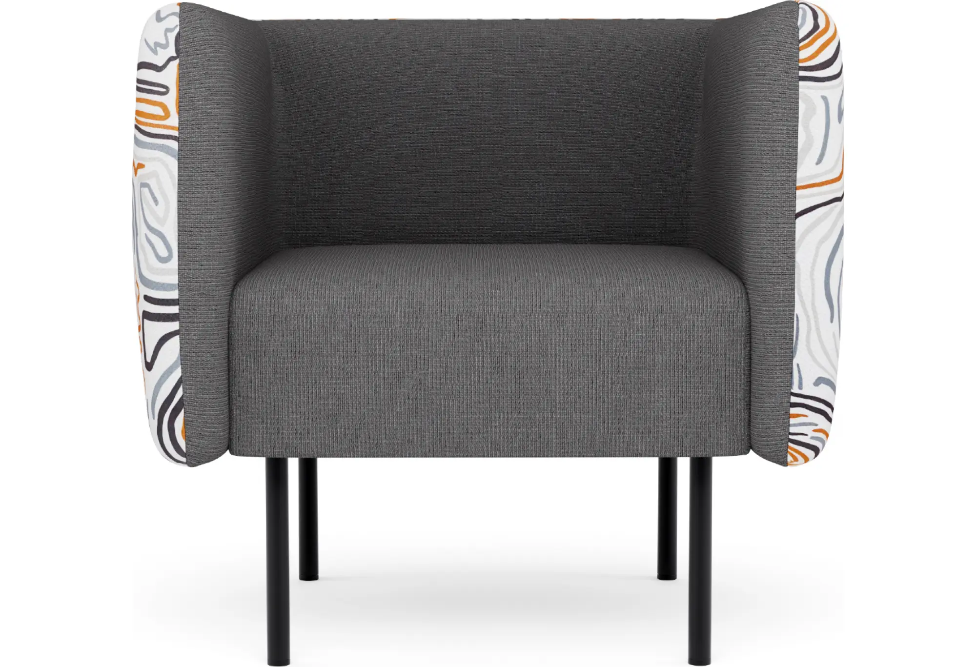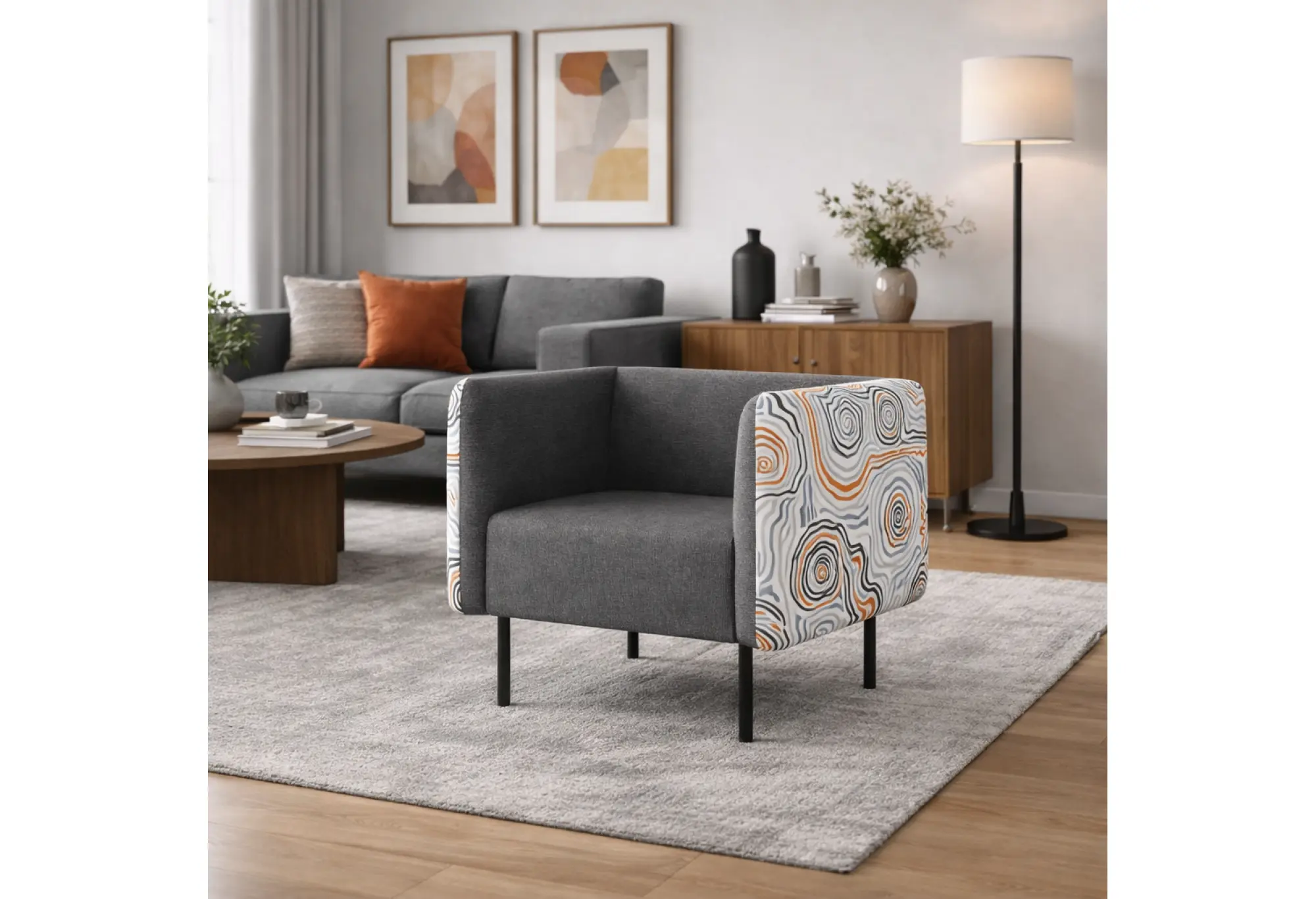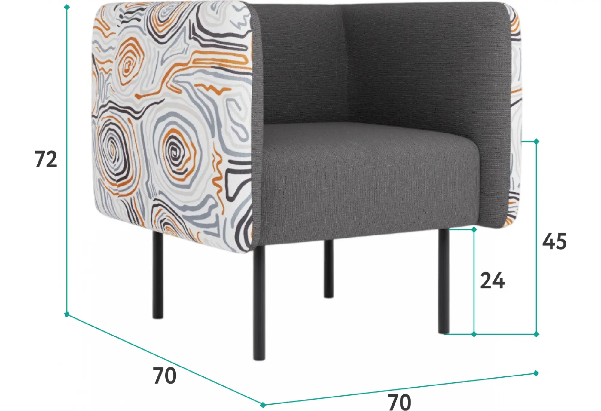 Компактное кресло РИО в сером цвете станет выразительным акцентом в современном интерьере. Лаконичная форма с прямыми линиями и открытыми боками делает модель визуально лёгкой, а контрастная обивка с оригинальным принтом придаёт пространству динамику и индивидуальность.