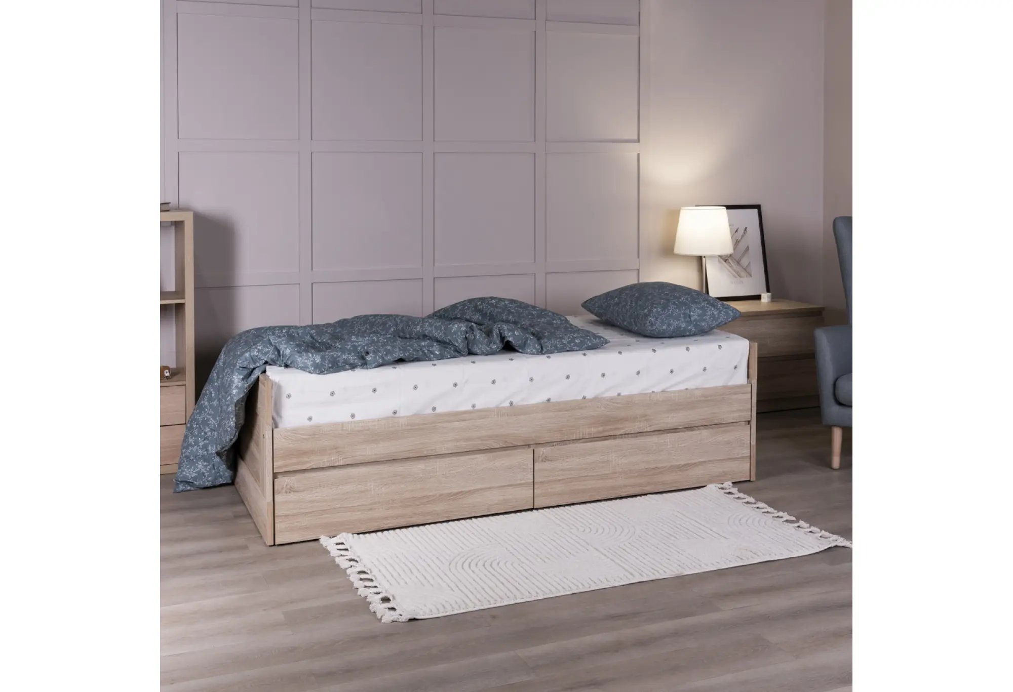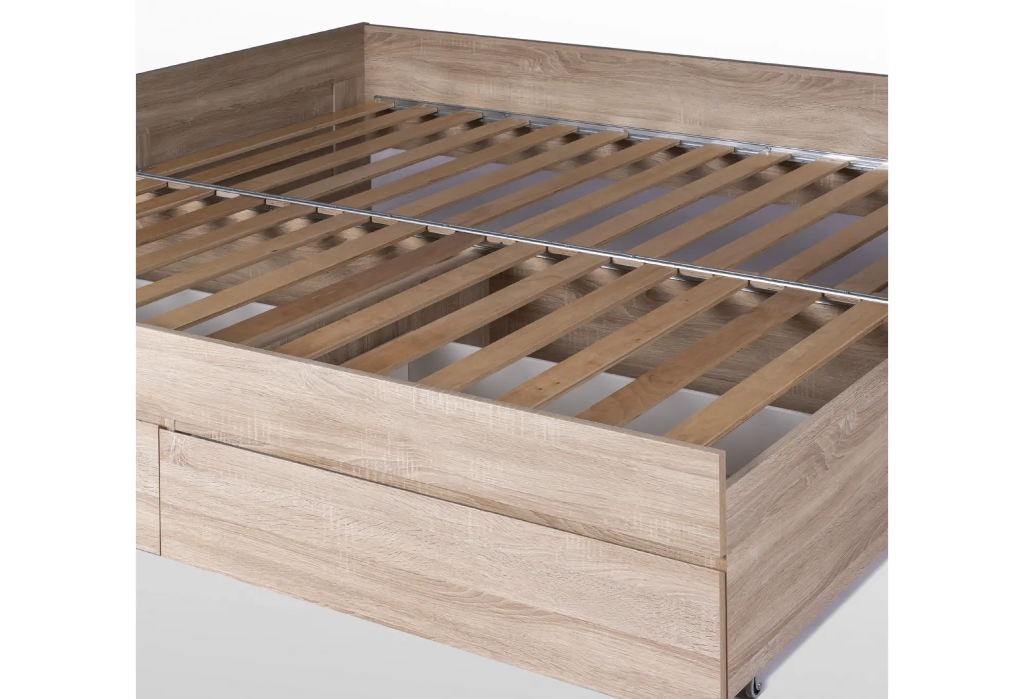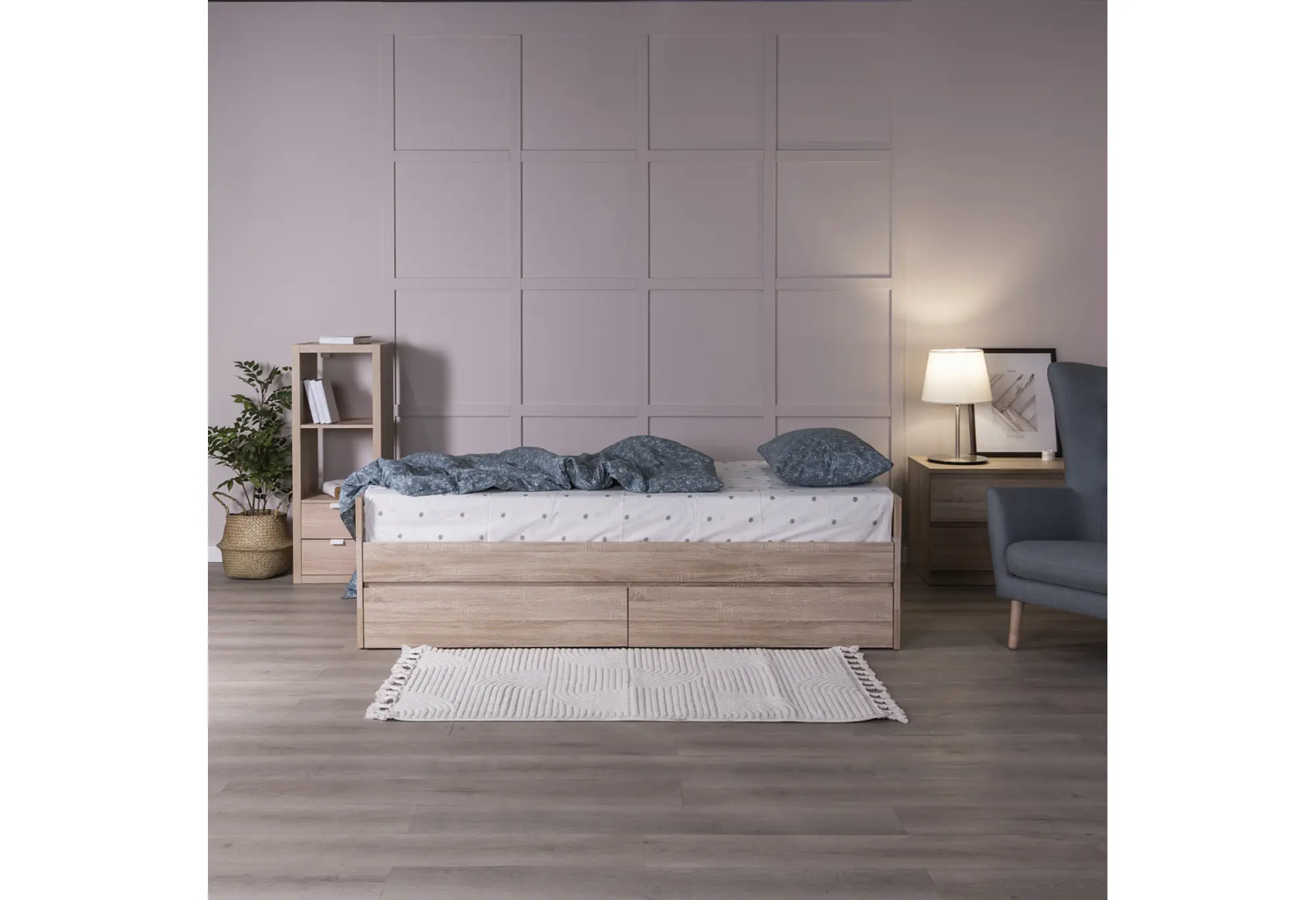 Два выдвижных ящика под кроватью позволяют удобно хранить постельное белье или другие вещи, освобождая дополнительное место в комнате. Ортопедическое основание способствует здоровому и комфортному сну, поддерживая правильное положение тела.