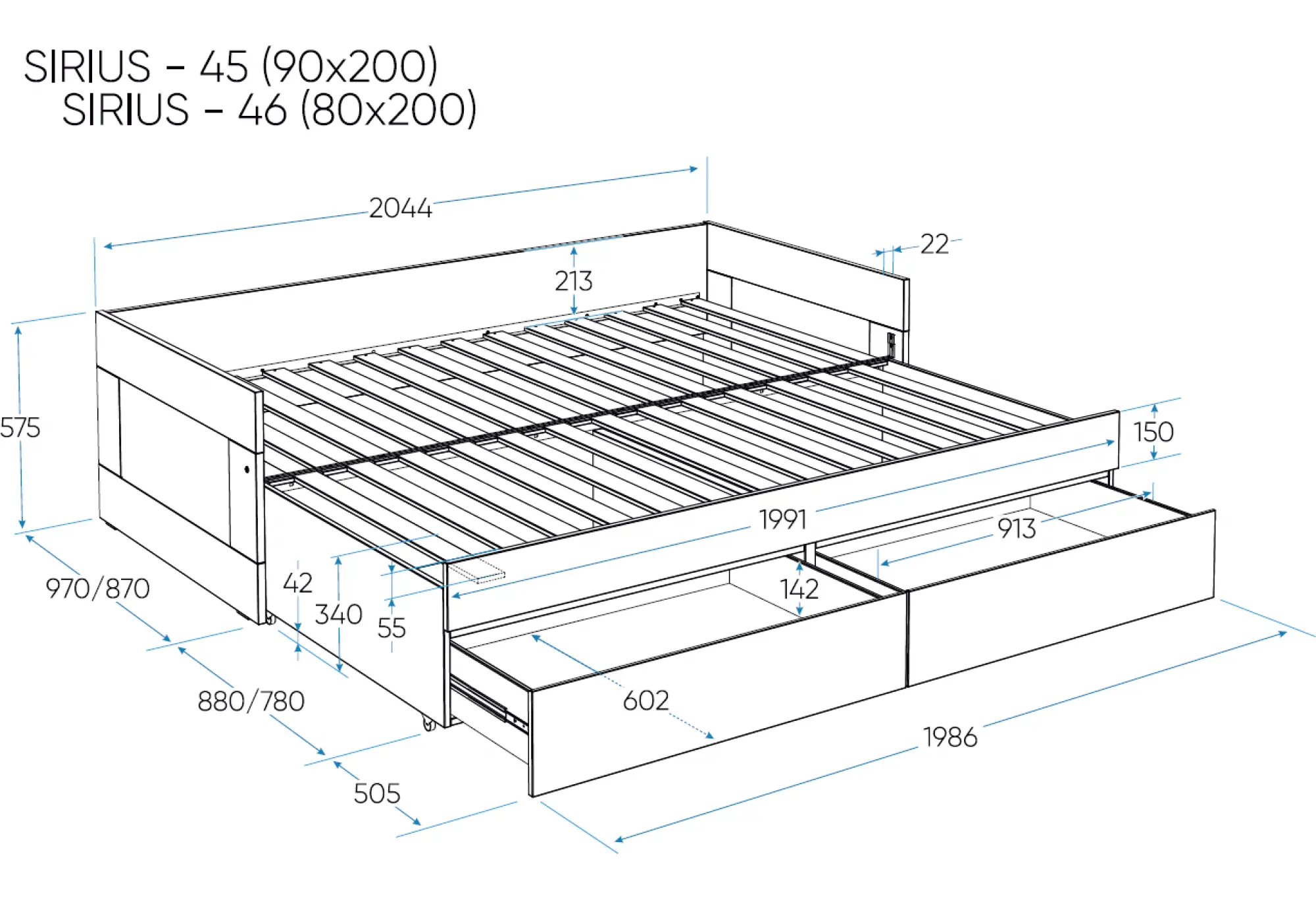 Кровать "СИРИУС" представляет собой идеальное решение для тех, кто ценит функциональность и стиль в меблировке. Эта раздвижная кровать может трансформироваться из односпальной в двухспальную, обеспечивая максимальную гибкость в использовании пространства. Изготовленная из надежного и прочного ДСП толщиной 22 мм, она гарантирует долгий срок службы и устойчивость конструкции.