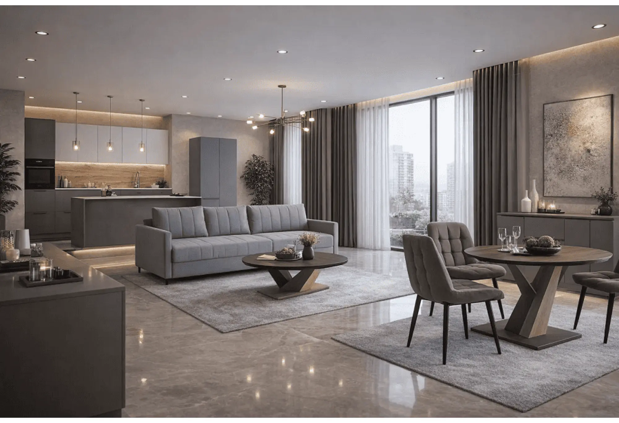 Готовый комплект «Квартира студия 2» помогает оформить современное открытое пространство в едином стиле. В набор входит кухня «Фортуна» длиной 3 метра, рассчитанная на полноценную рабочую зону. Глубина 600 мм позволяет удобно разместить технику и посуду, а высота 2200 мм даёт достаточно места для хранения на верхних шкафах. Лаконичные фасады и прямые линии поддерживают современный интерьер, хорошо сочетаются с нейтральной отделкой и мягким освещением.