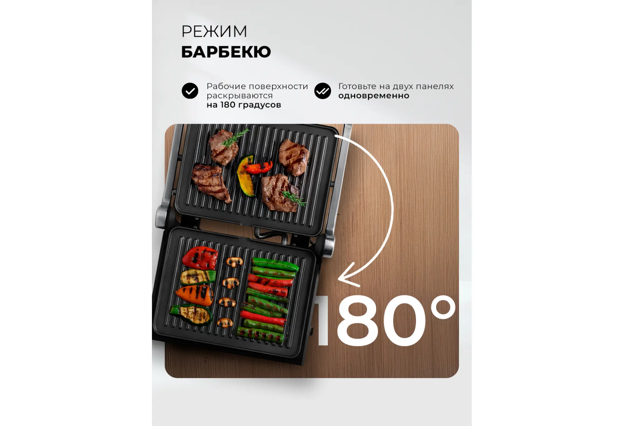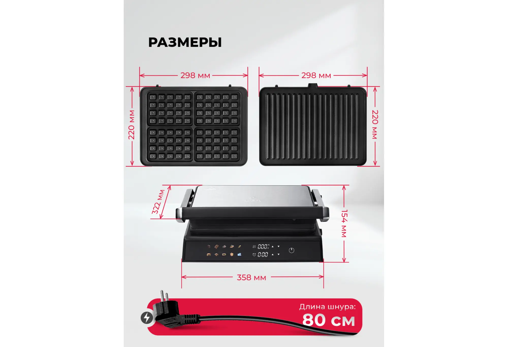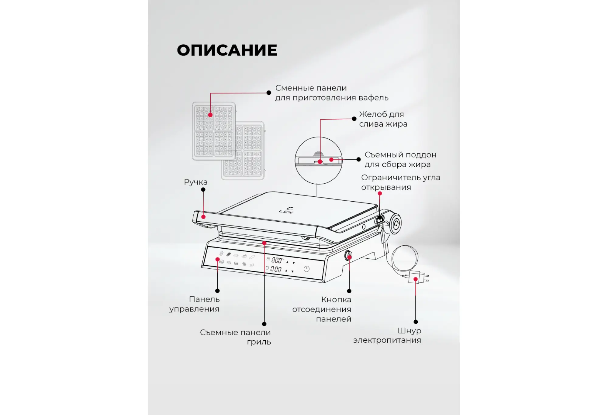 Электрический гриль со съемными панелями с вафельницей LEX LXGR 5007 — это гриль, барбекю и вафельница в одном устройстве.Гриль быстро и равномерно нагревается, обеспечивает нужную температуру приготовления для превосходной корочки снаружи и сочности внутри. Модель имеет 10 автоматических программ, в том числе для приготовления вафель. Сменные панели для них входят в комплект.Максимальная мощность гриля — 2000 Вт, температуру можно выбрать в диапазоне от 50 до 230 °C. Это дает возможность точной настройки под любой рецепт. Вы можете изменить время и температуру приготовления в любом режиме.Рабочие поверхности раскрываются на 180 градусов, что позволяет приготовить блюда в режиме «Барбекю» на двух панелях одновременно. На гриле можно поджарить мясо и овощи, а также приготовить аппетитные вафли на десерт.Панели с антипригарным покрытием позволяют готовить блюда без лишнего масла и жира: они стекают по специальному желобу в поддон.За устройством просто ухаживать: съемный поддон и антипригарные сменные панели легко очищать после использования.Интуитивно понятное сенсорное управление и яркий цветной дисплей обеспечивают простоту и удобство использования, а функция автоматического отключения гарантирует безопасность при длительном приготовлении.