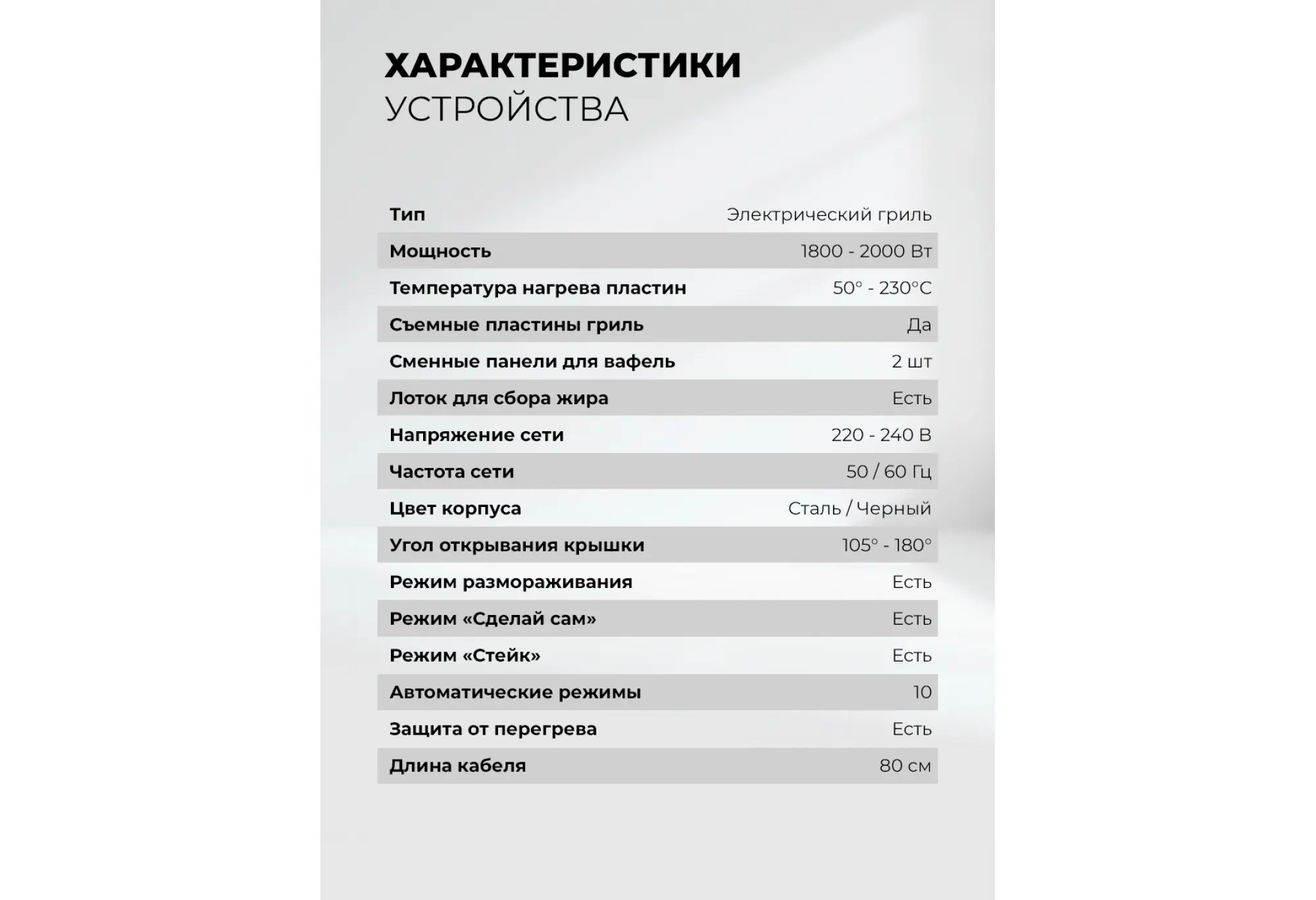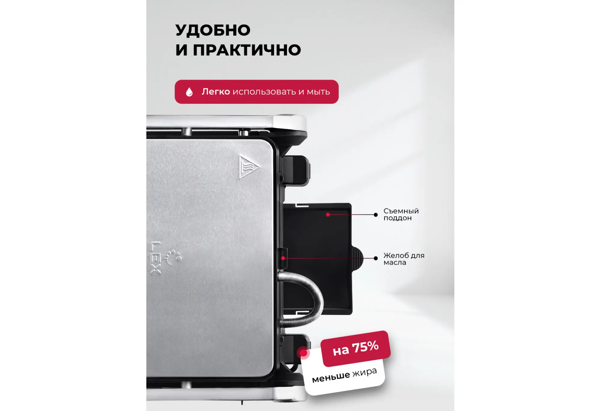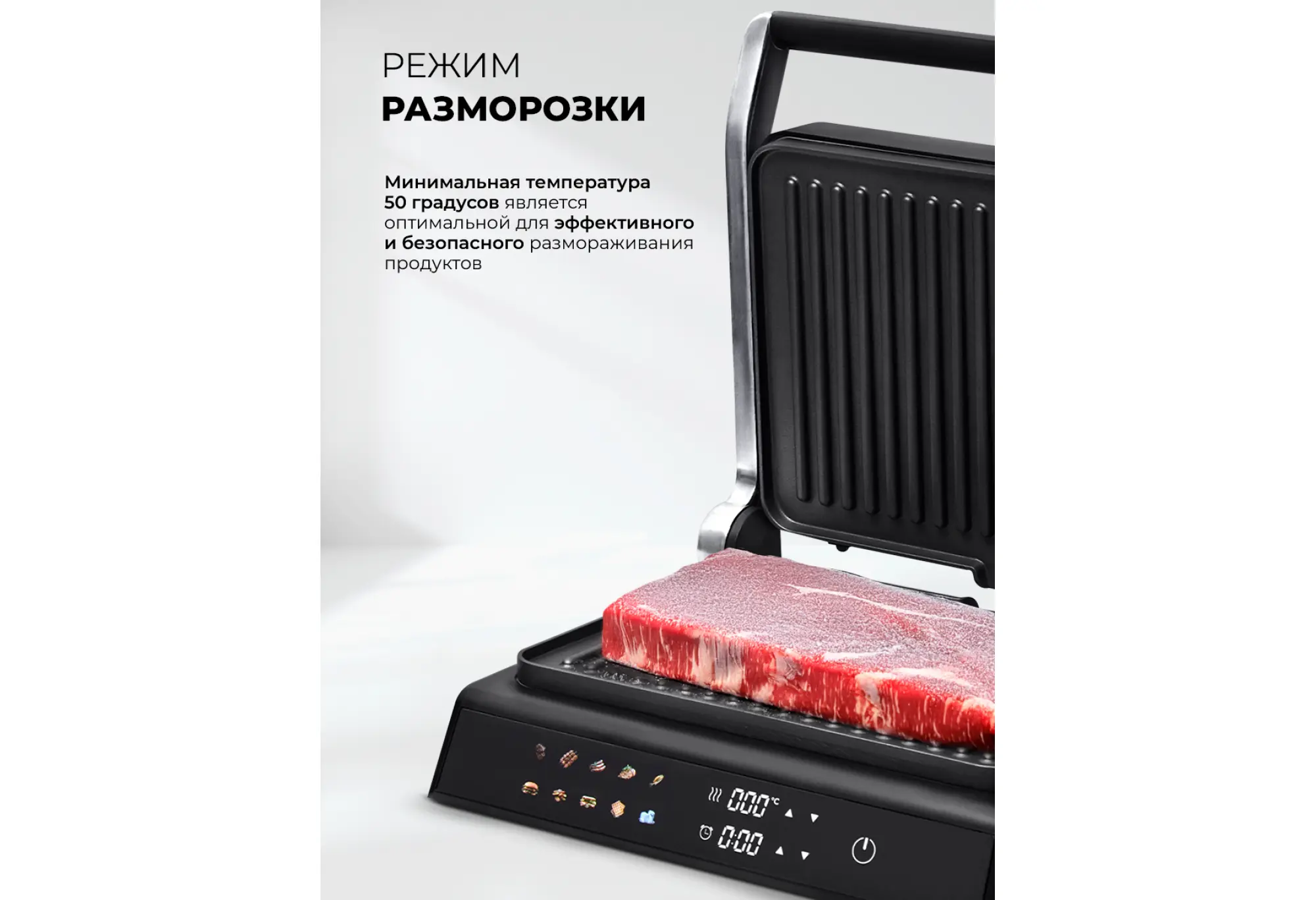 Электрический гриль со съемными панелями с вафельницей LEX LXGR 5007 — это гриль, барбекю и вафельница в одном устройстве.Гриль быстро и равномерно нагревается, обеспечивает нужную температуру приготовления для превосходной корочки снаружи и сочности внутри. Модель имеет 10 автоматических программ, в том числе для приготовления вафель. Сменные панели для них входят в комплект.Максимальная мощность гриля — 2000 Вт, температуру можно выбрать в диапазоне от 50 до 230 °C. Это дает возможность точной настройки под любой рецепт. Вы можете изменить время и температуру приготовления в любом режиме.Рабочие поверхности раскрываются на 180 градусов, что позволяет приготовить блюда в режиме «Барбекю» на двух панелях одновременно. На гриле можно поджарить мясо и овощи, а также приготовить аппетитные вафли на десерт.Панели с антипригарным покрытием позволяют готовить блюда без лишнего масла и жира: они стекают по специальному желобу в поддон.За устройством просто ухаживать: съемный поддон и антипригарные сменные панели легко очищать после использования.Интуитивно понятное сенсорное управление и яркий цветной дисплей обеспечивают простоту и удобство использования, а функция автоматического отключения гарантирует безопасность при длительном приготовлении.