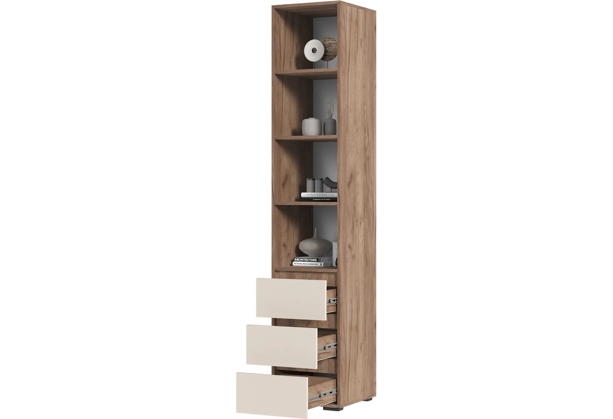 Функциональность пенала привлекает наличием нескольких полок и ящиков с шариковыми направляющими, что обеспечивает легкость и плавность использования. Прочные пластиковые опоры высотой 20 мм поддерживают стабильность и долговечность конструкции.