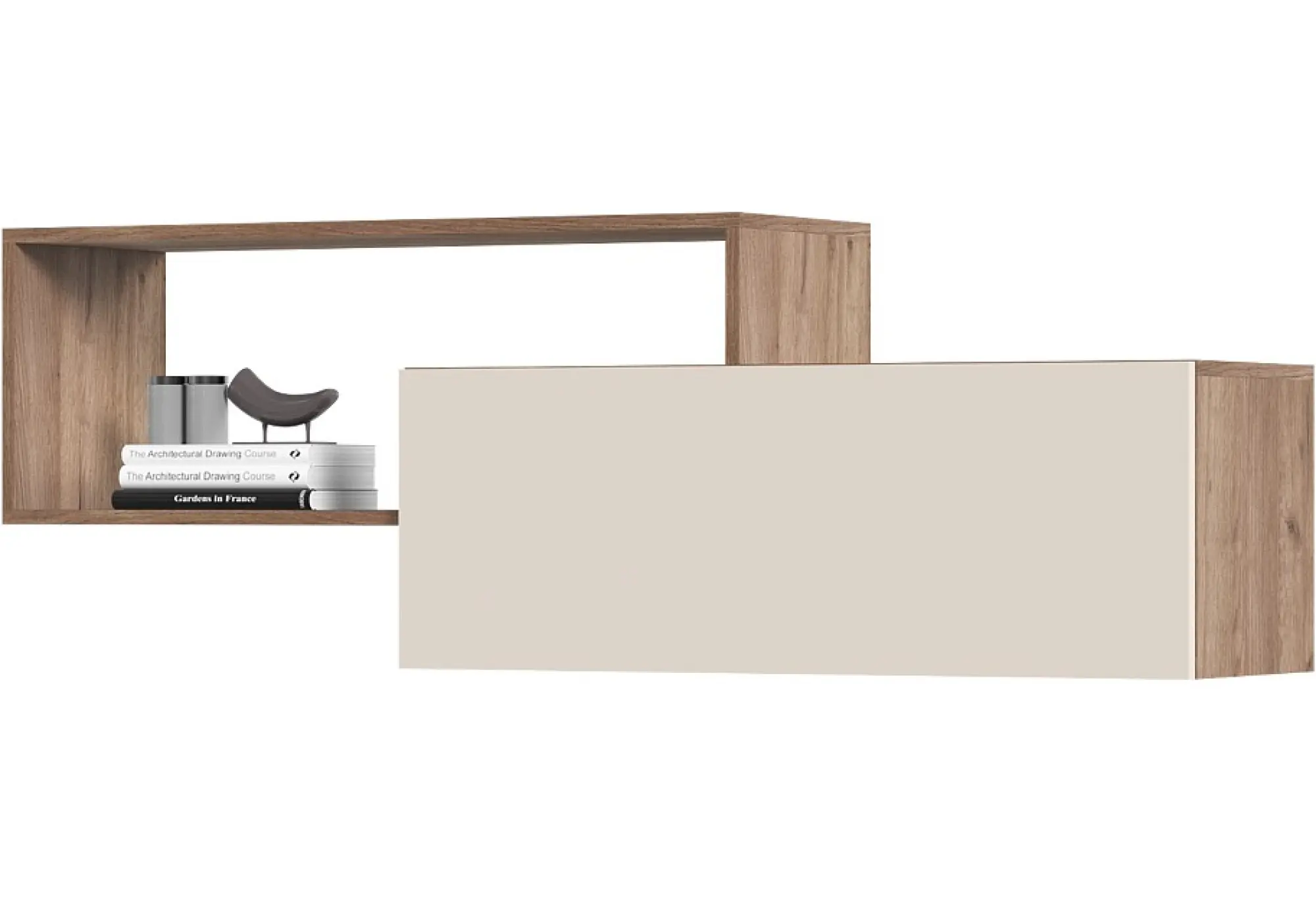 Конструкция выполнена из ЛДСП, что обеспечивает стабильную геометрию, удобство в уходе и устойчивость к повседневным нагрузкам. Открытая часть полки удобна для книг, декора, рамок с фотографиями, а закрытая секция с фасадом графитового цвета поможет скрыть от глаз все, что не хочется держать на виду. Четкие линии и продуманные пропорции позволяют вписать модель как в одиночном варианте, так и в составе модульной композиции над ТВ-зоной или рабочим столом.