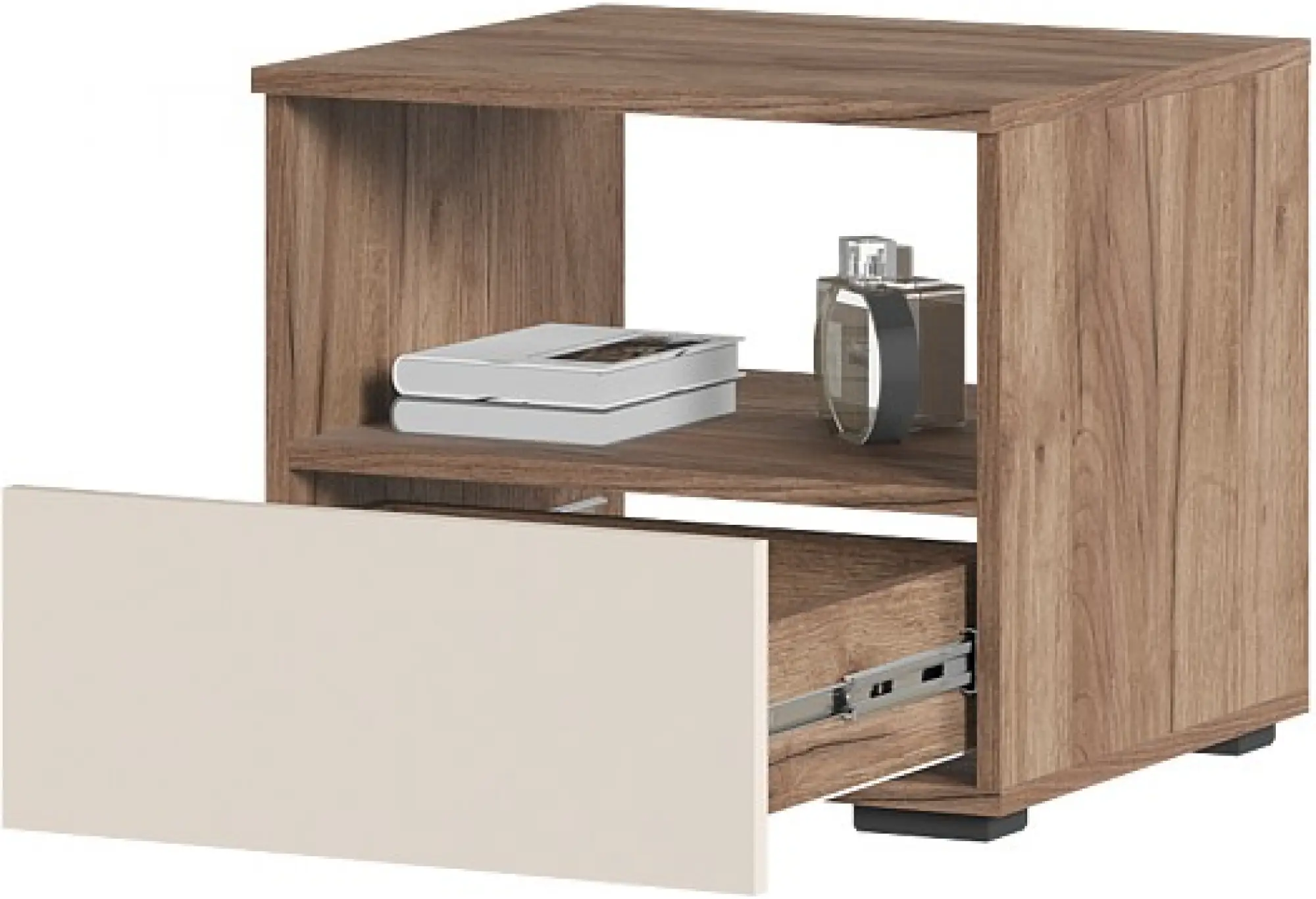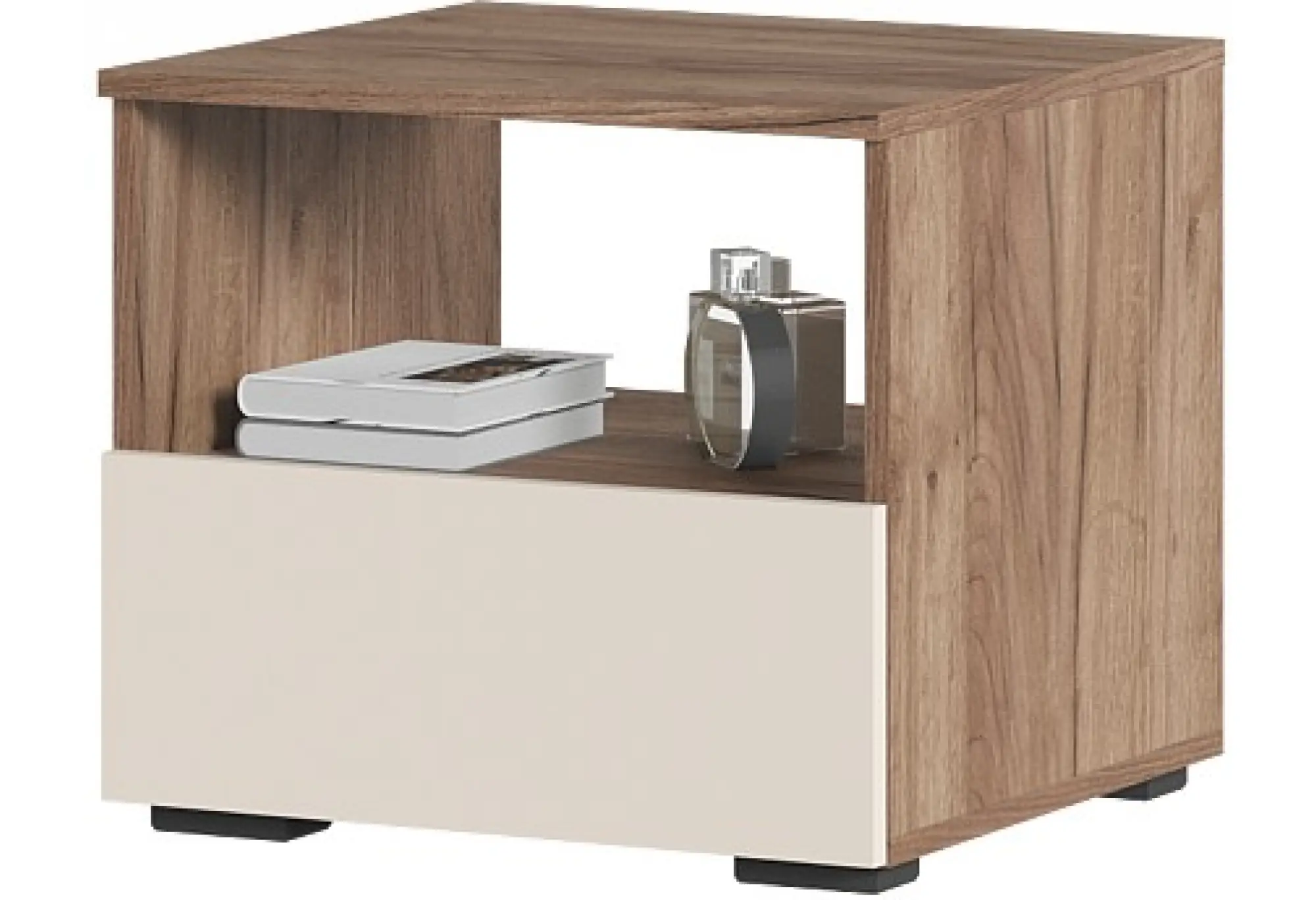 Верхняя открытая ниша удобна для тех вещей, которые должны быть под рукой - книга, гаджеты, очки или декор. Закрытый выдвижной ящик на шариковых направляющих обеспечивает плавное и тихое выдвижение, а также скрытое хранение личных мелочей. Пластиковые опоры высотой 20 мм защищают нижнюю кромку тумбы от контакта с полом и облегчают поддержание чистоты.