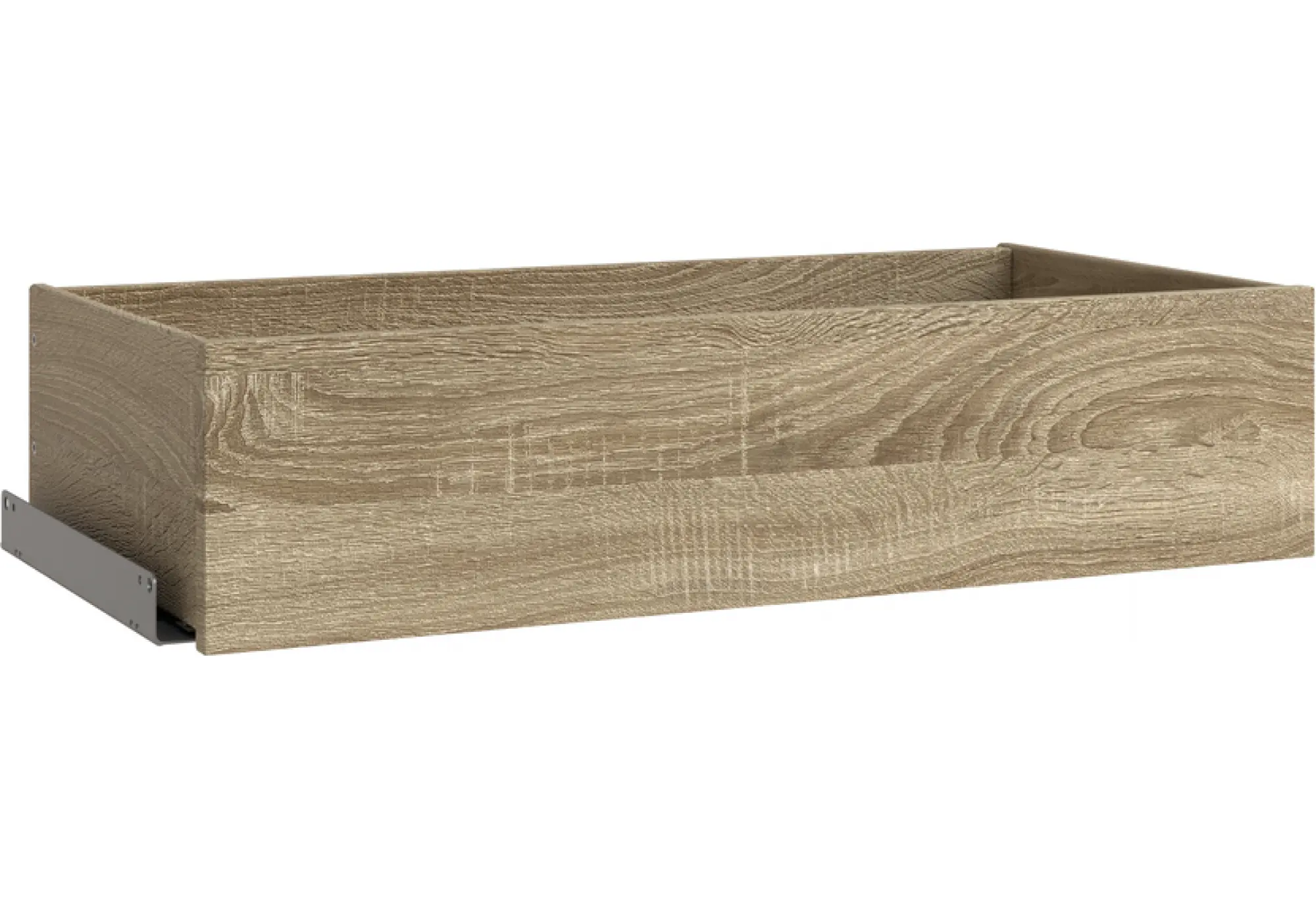 Корпус выполнен из ДСП толщиной 16, 12 и 10 мм, что обеспечивает достаточную жёсткость конструкции при ежедневном использовании. Покрытие под древесную текстуру дуба Сонома делает ящик визуально лёгким и современным, он гармонично сочетается с большинством шкафов в аналогичном оттенке и светлых интерьерах.
