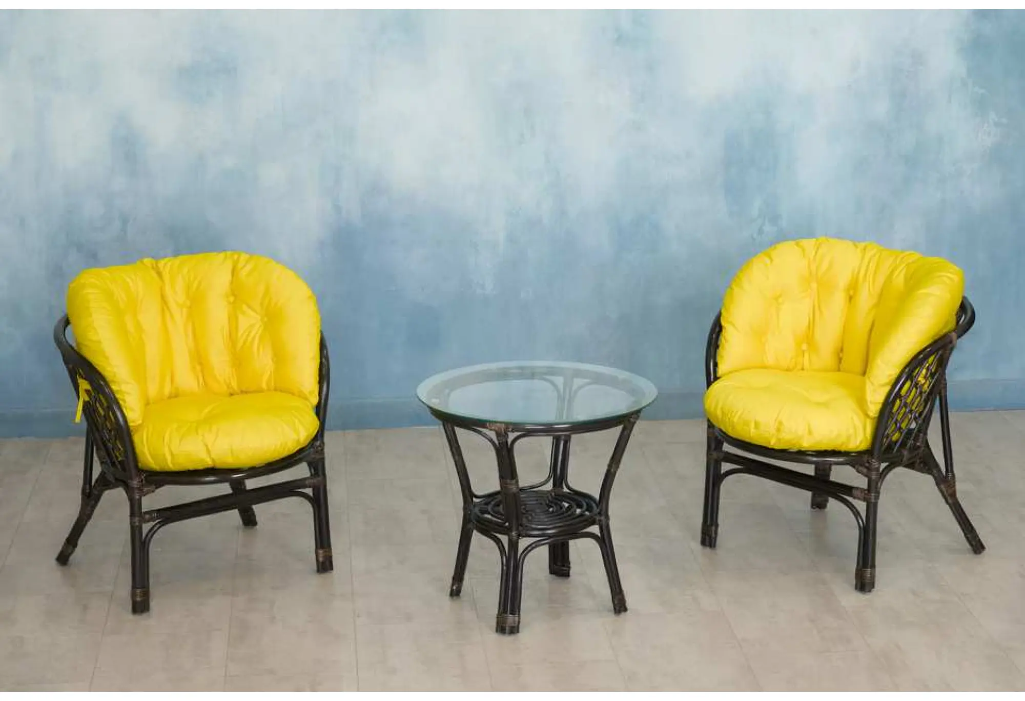 — В набор входят два удобных кресла с мягкими подушками и стильный круглый столик с прозрачной стеклянной столешницей.