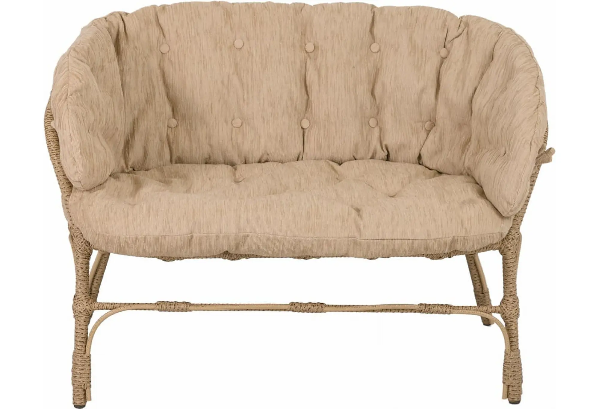 Двухместный диван из искусственного ротанга с удобной мягкой бежевой подушкой станет отличным выбором для обустройства вашего дачного участка, будь то терраса, открытая веранда, внутренний дворик или сад. Его размеры составляют всего лишь 115×70×75 сантиметров, позволяя гармонично вписаться даже в ограниченное пространство.