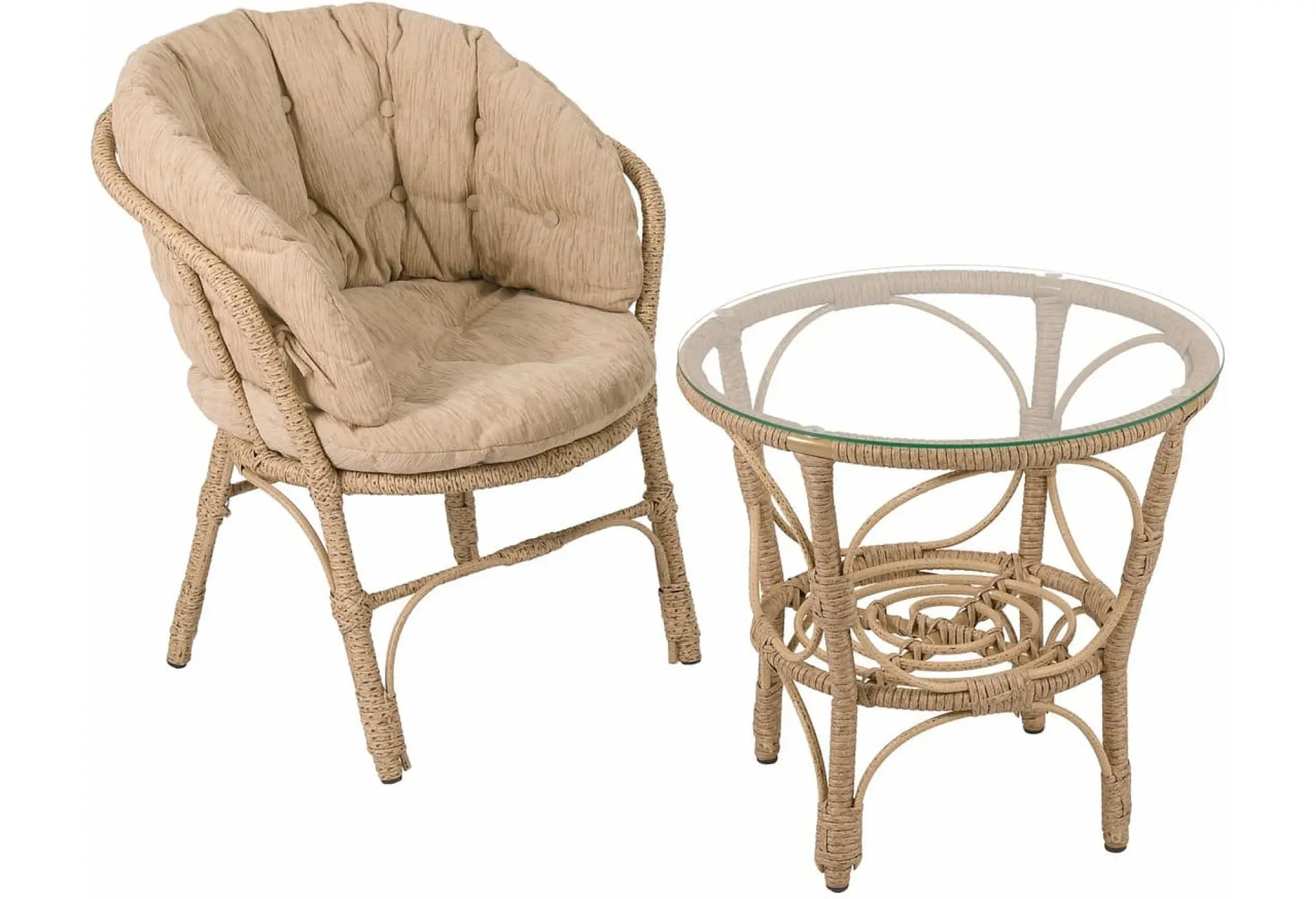 Каркас кресел выполнен из сталь с полимерным покрытием, а плетение — прочный искусственный ротанг, который отличается долговечностью и устойчивостью к воздействию погодных условий. Мягкие подушки обеспечивают комфорт и удобство при использовании.
