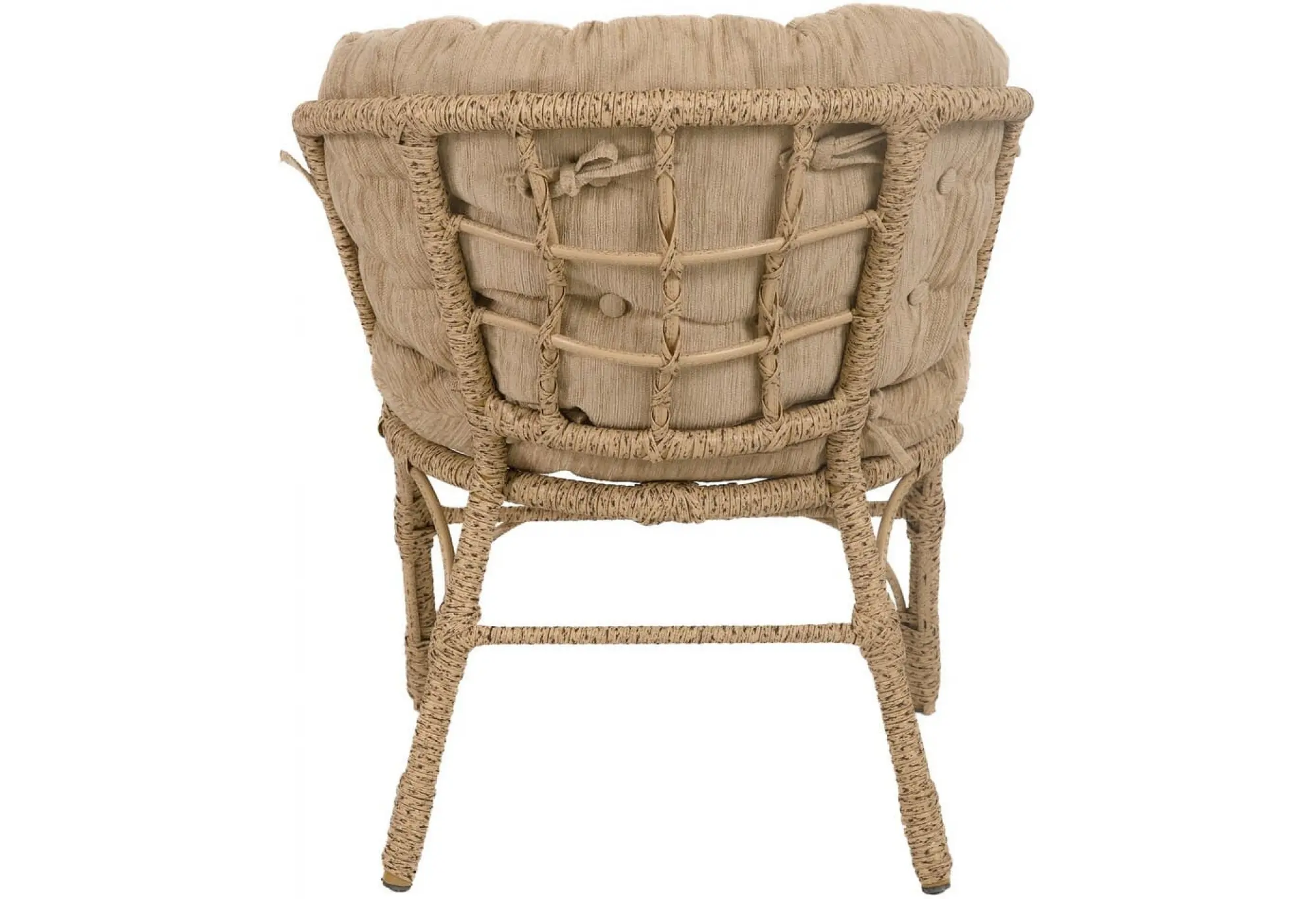 Кресла имеют округлую форму спинки и сиденья, создавая удобную посадку для длительного отдыха. Мягкие бежевые подушки визуально облегчают композицию и улучшают комфорт, их легко снимать при необходимости. Стол оснащен круглой столешницей оптимального диаметра для размещения напитков, посуды и небольших закусок. Небольшая высота стола способствует комфортному общению, не загромождая пространство.