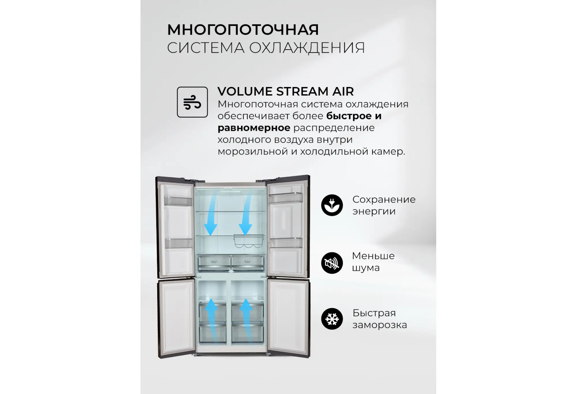 Обе камеры оснащены системой No Frost, поэтому внутри не образуется иней, не требуется ручная разморозка, а температура распределяется равномерно. Два независимых контура охлаждения дают возможность точно настраивать условия в холодильном и морозильном отделениях, поддерживая оптимальный режим для разных типов продуктов.
