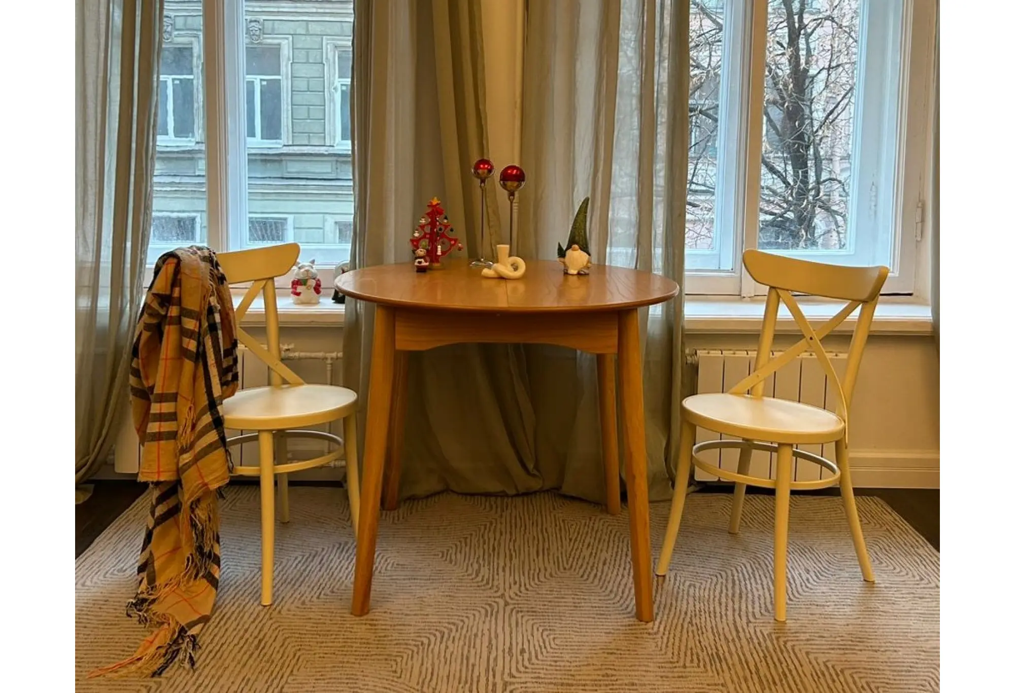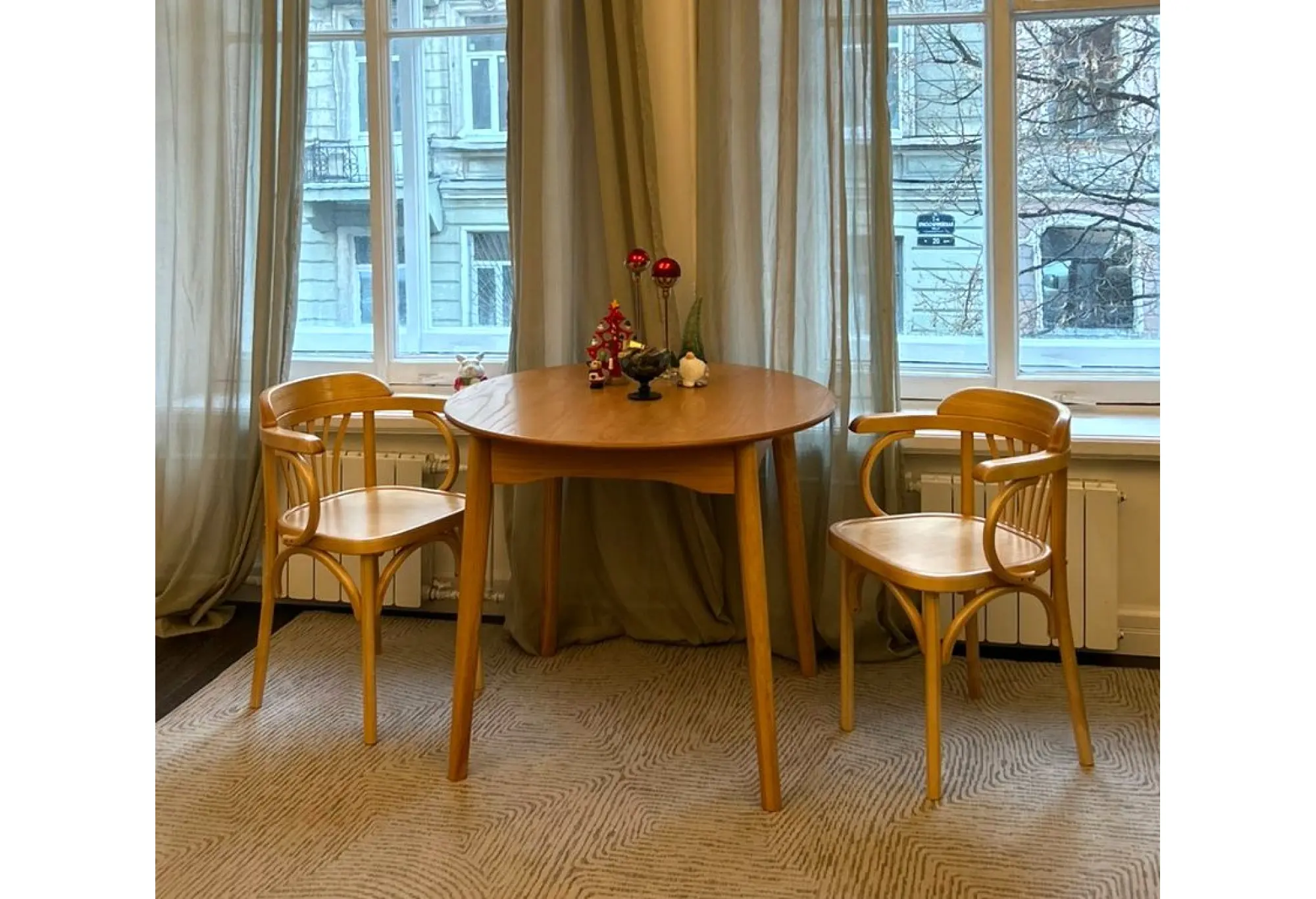 Столешница выполнена из шпонированного буком МДФ, что гарантирует прочность и износостойкость. Надежные ножки из массива бука обеспечивают устойчивость и долговечность. Простота раздвижного механизма позволяет мгновенно увеличить размеры стола, что особенно удобно для приема гостей.
