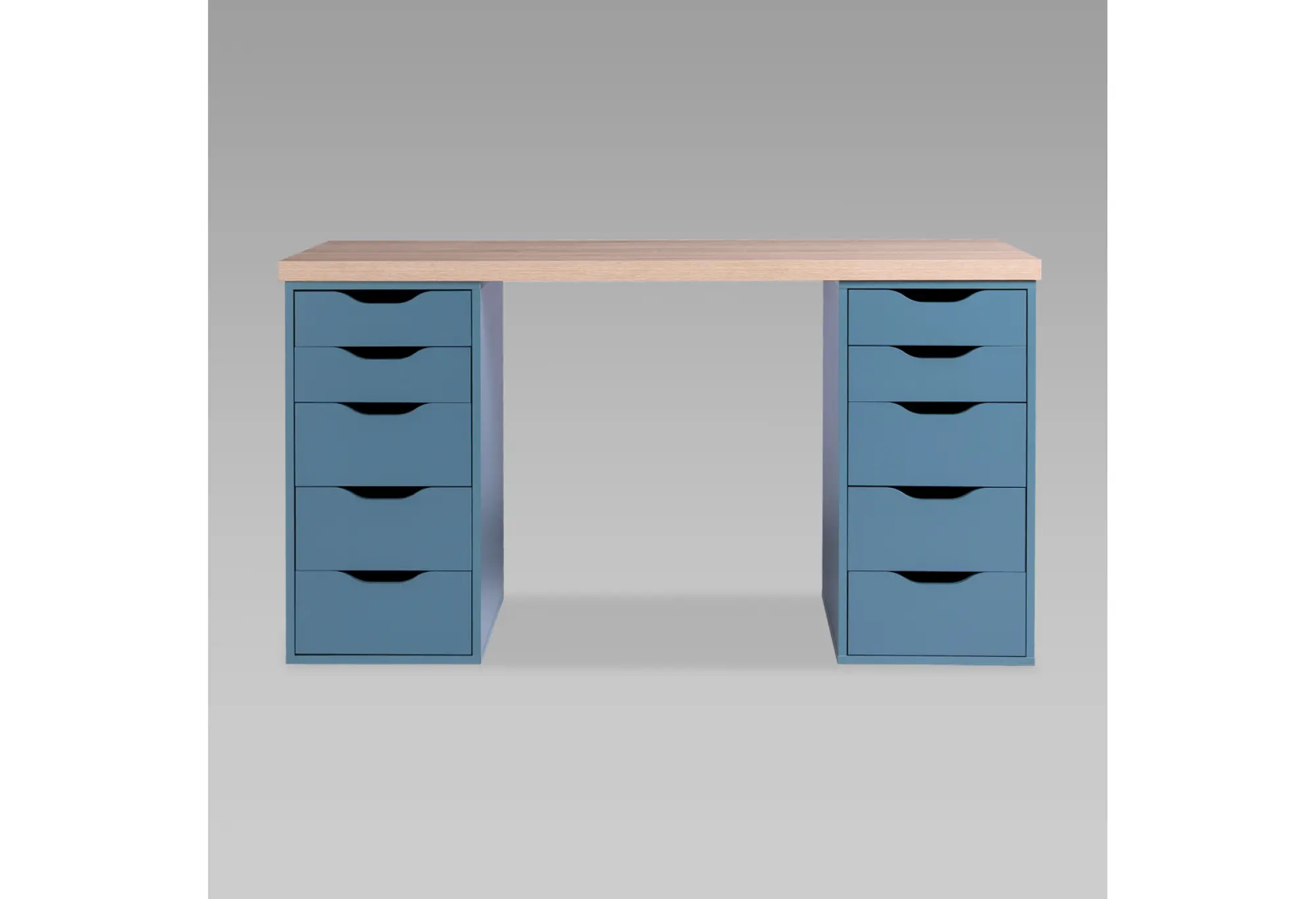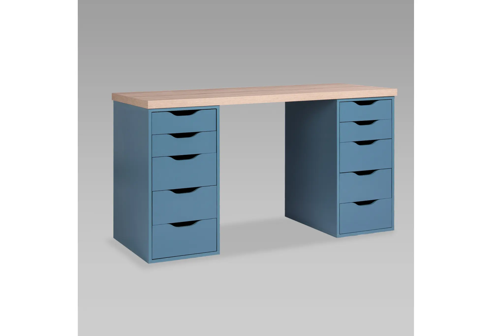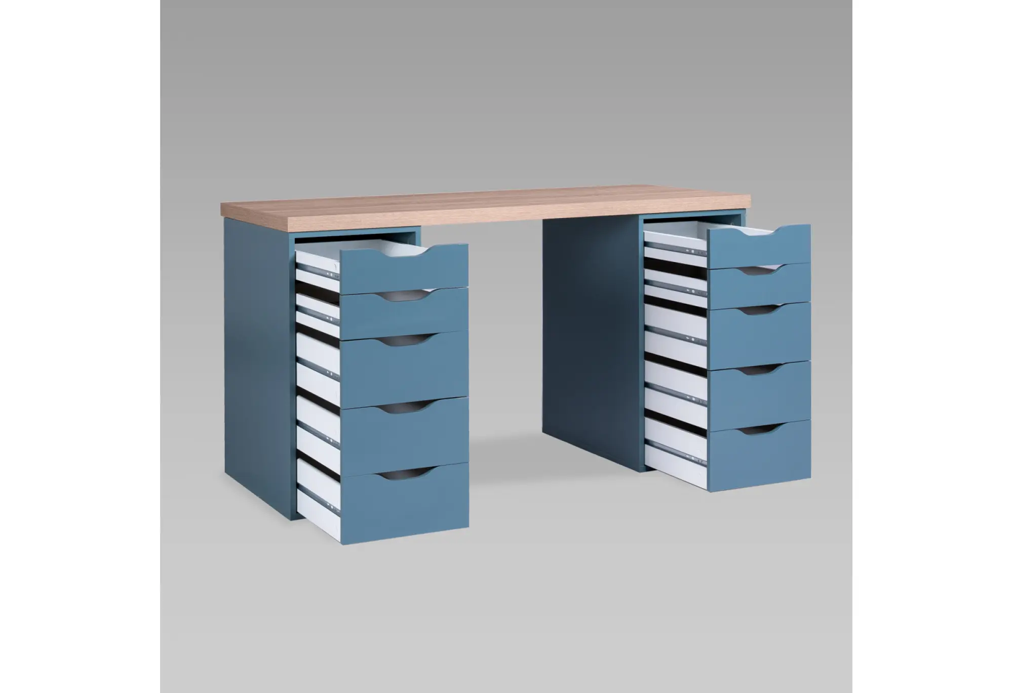 Подстолье образуют две тумбы, каждая с пятью выдвижными ящиками разной высоты. Благодаря этому удобно разложить как мелкие канцелярские принадлежности, так и более объемные вещи, держать их под рукой и при этом поддерживать порядок на рабочей поверхности. Корпус и тумбы изготовлены из ДСП, поверхность декорирована бумагой и окрашена УФ-материалами, что придает покрытию аккуратный, ровный оттенок и завершенный внешний вид.