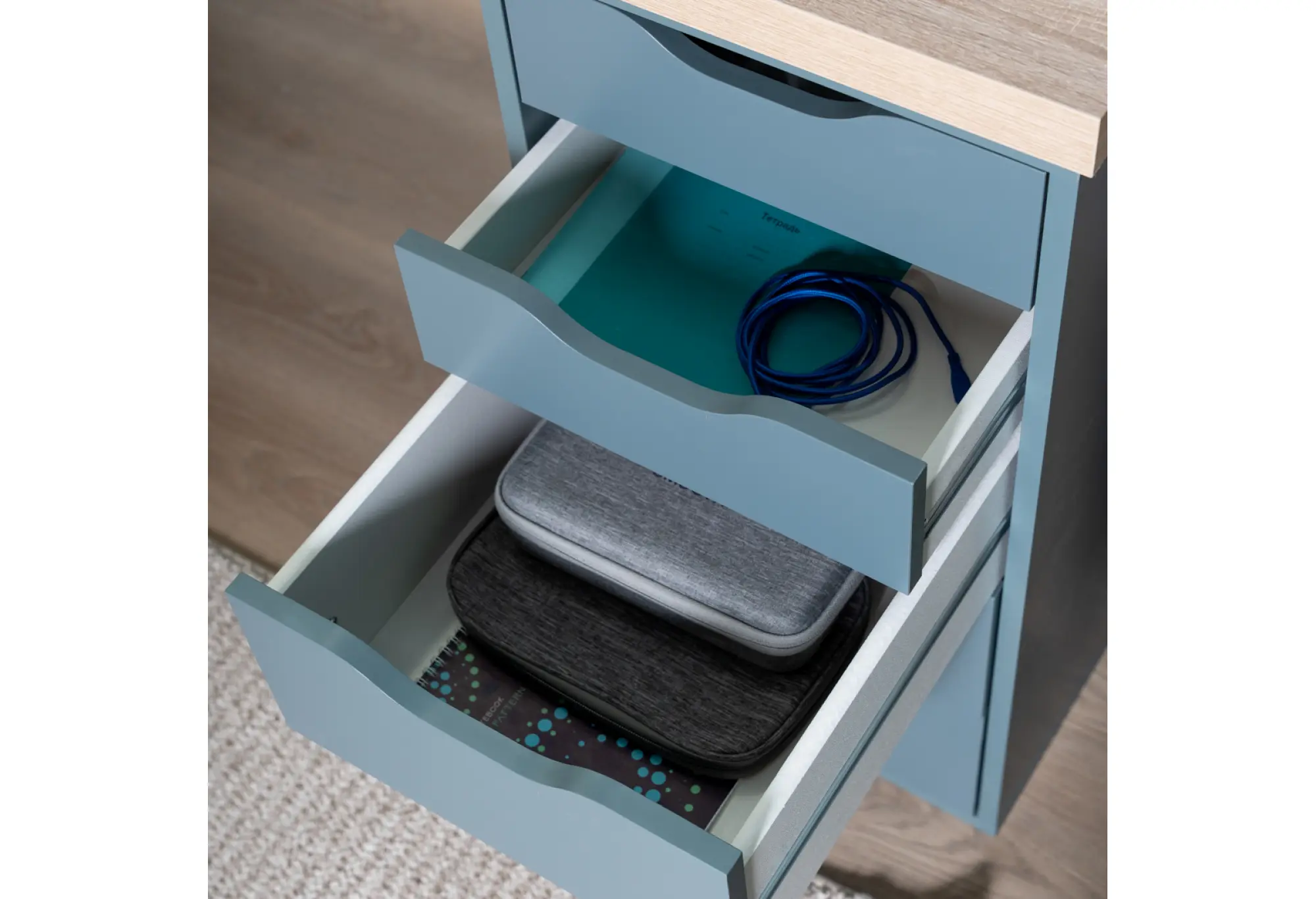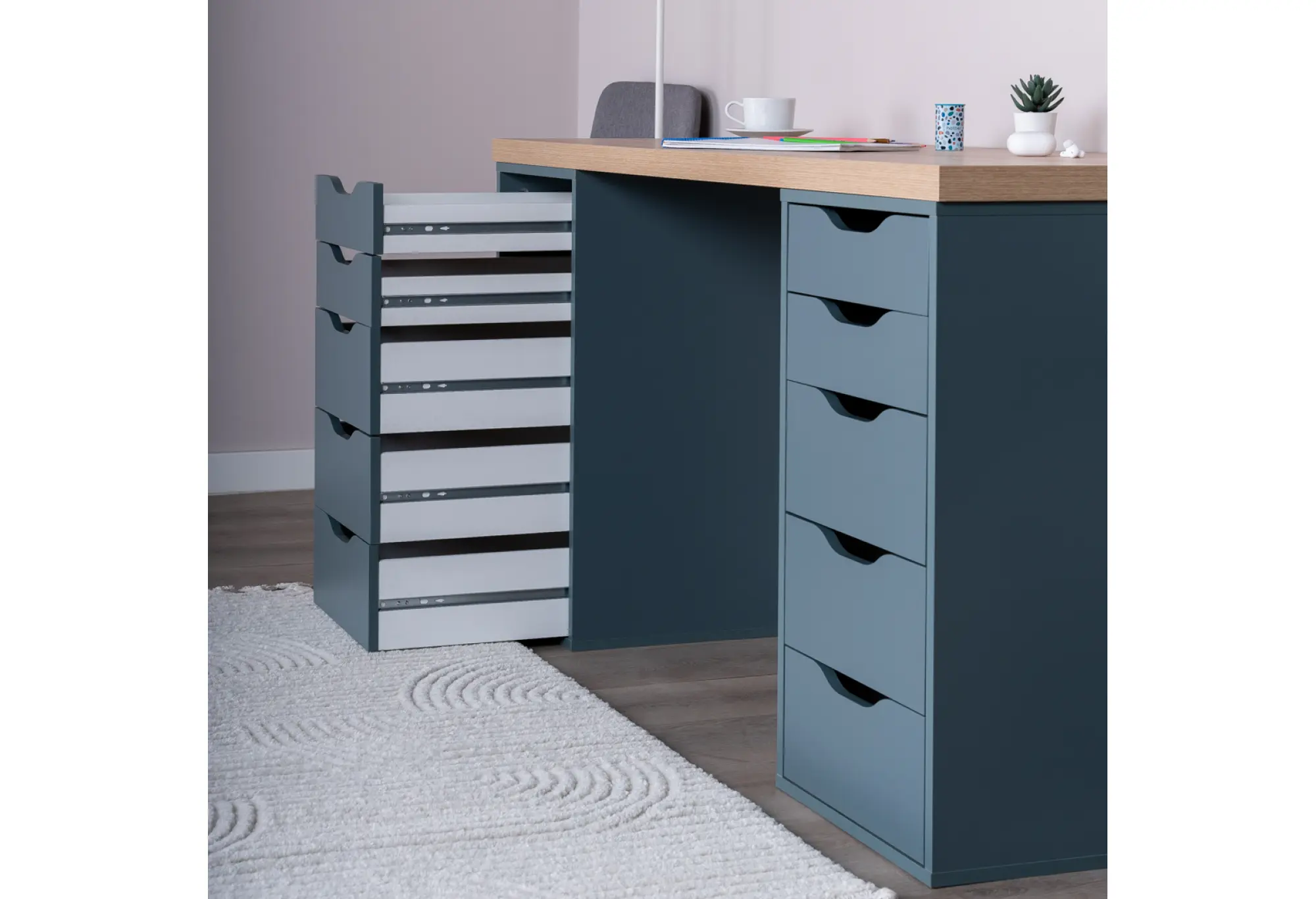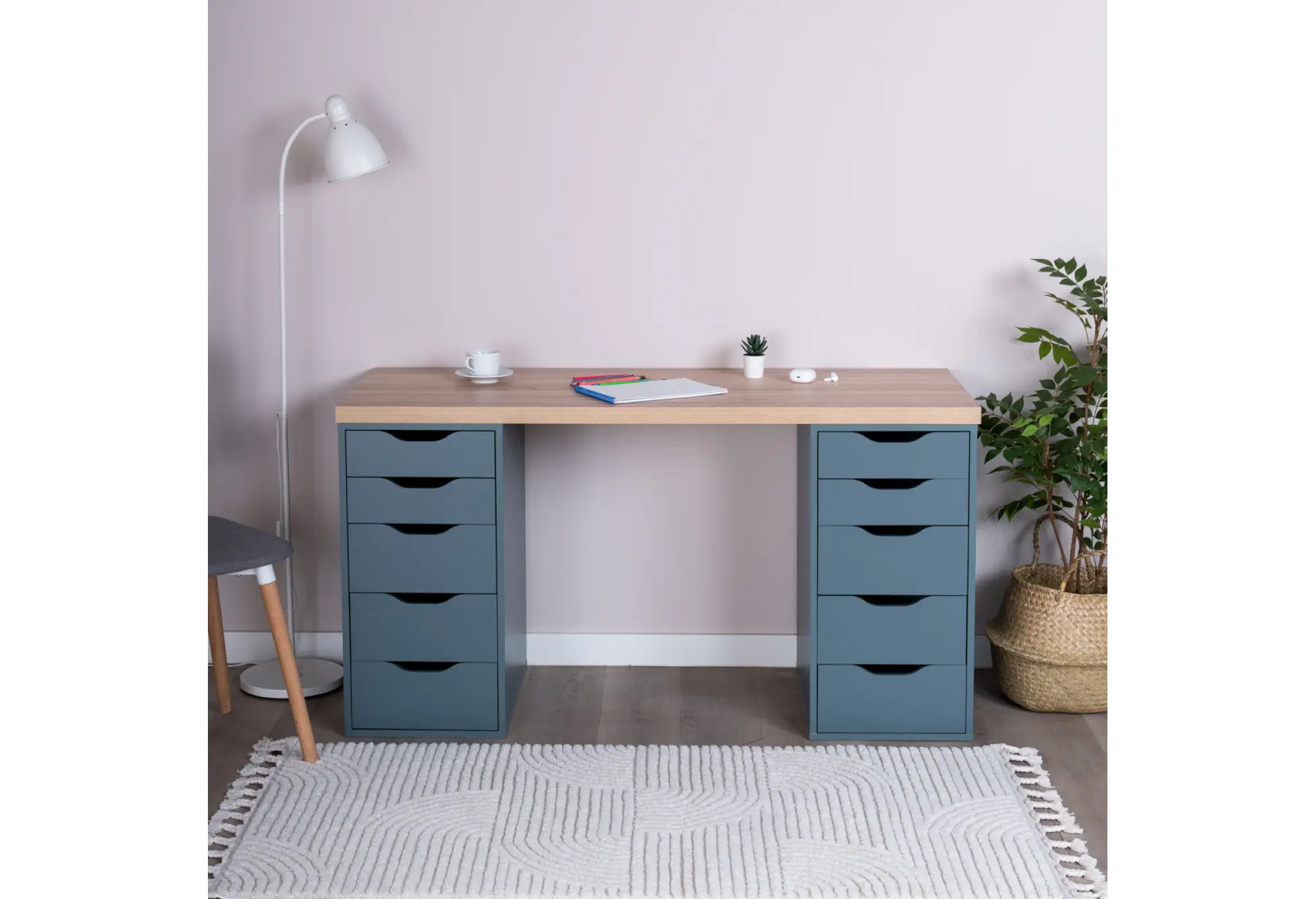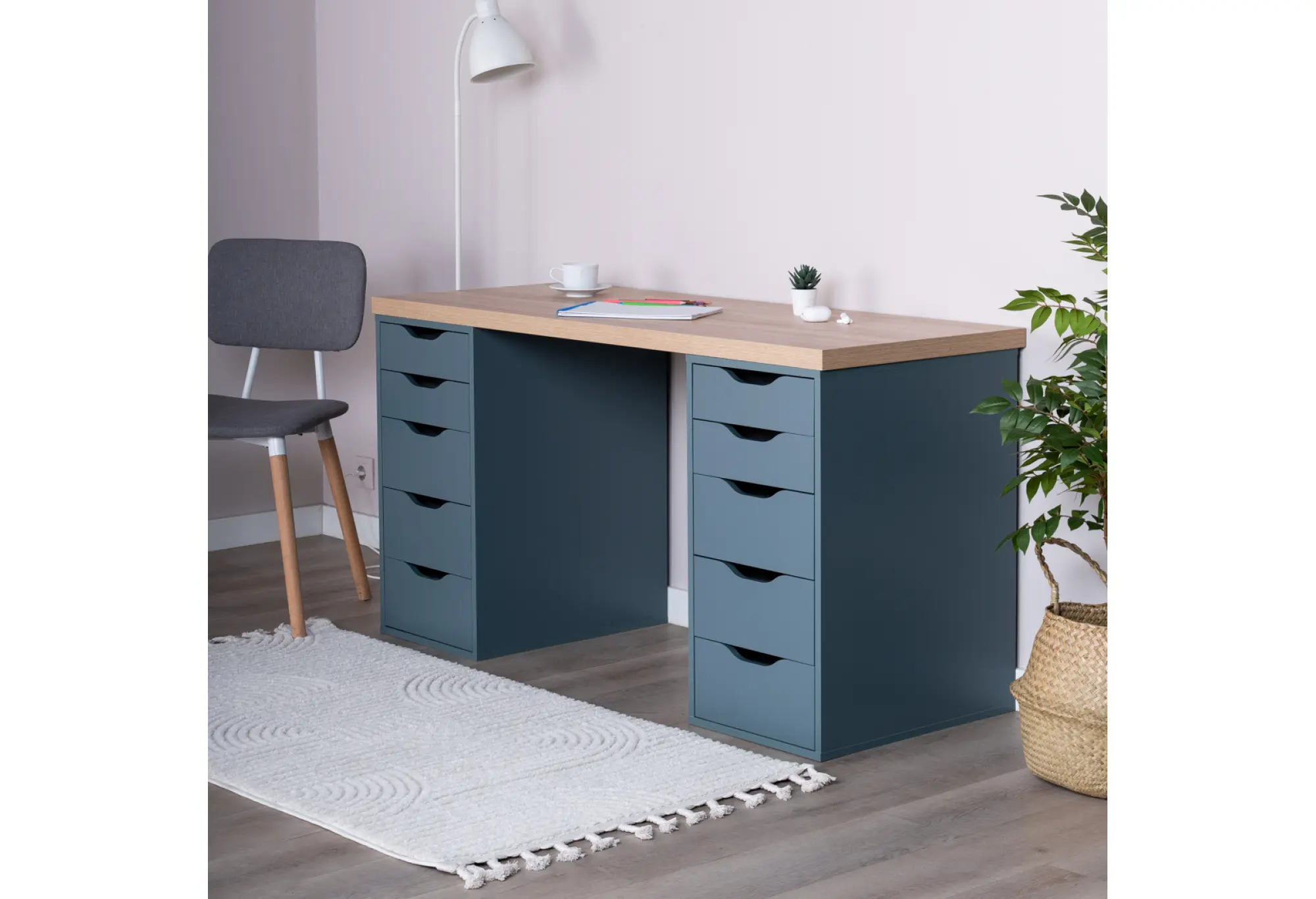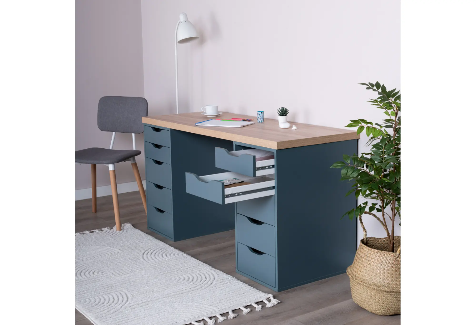 Фасады ящиков выполнены без навесных ручек. Открывание осуществляется за счет аккуратных вырезов, которые подчеркивают современный стиль модели и облегчают уход за столом. Цветовое решение «дуб беленый/серо-бирюзовый» визуально выделяет теплую текстуру столешницы на фоне спокойного, приглушенного оттенка тумб, что гармонично смотрится в интерьере кабинета, детской или домашнего офиса. Продуманная конструкция и материалы обеспечивают надежность стола как для домашних, так и для общественных помещений, что подтверждается гарантией 24 месяца.