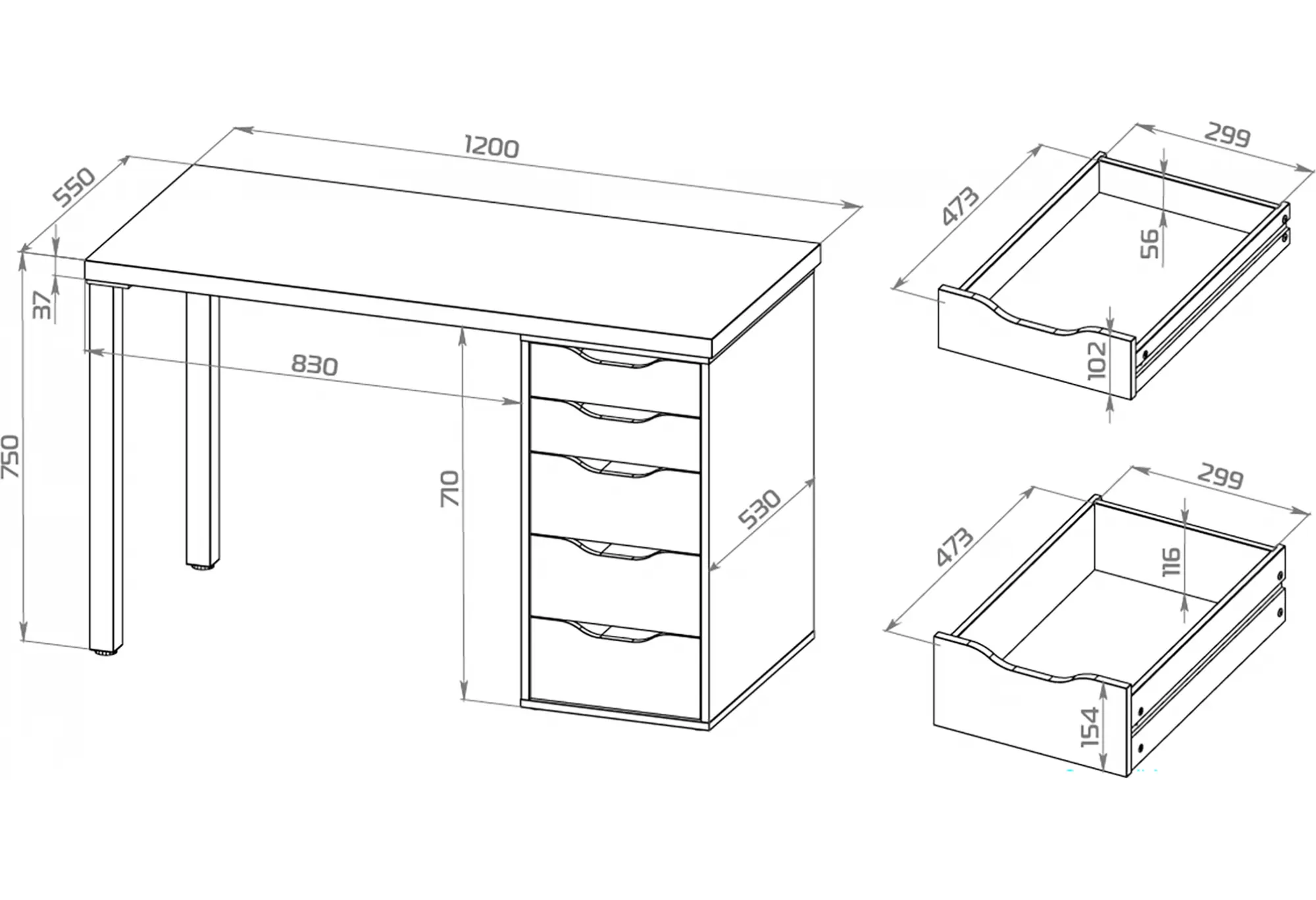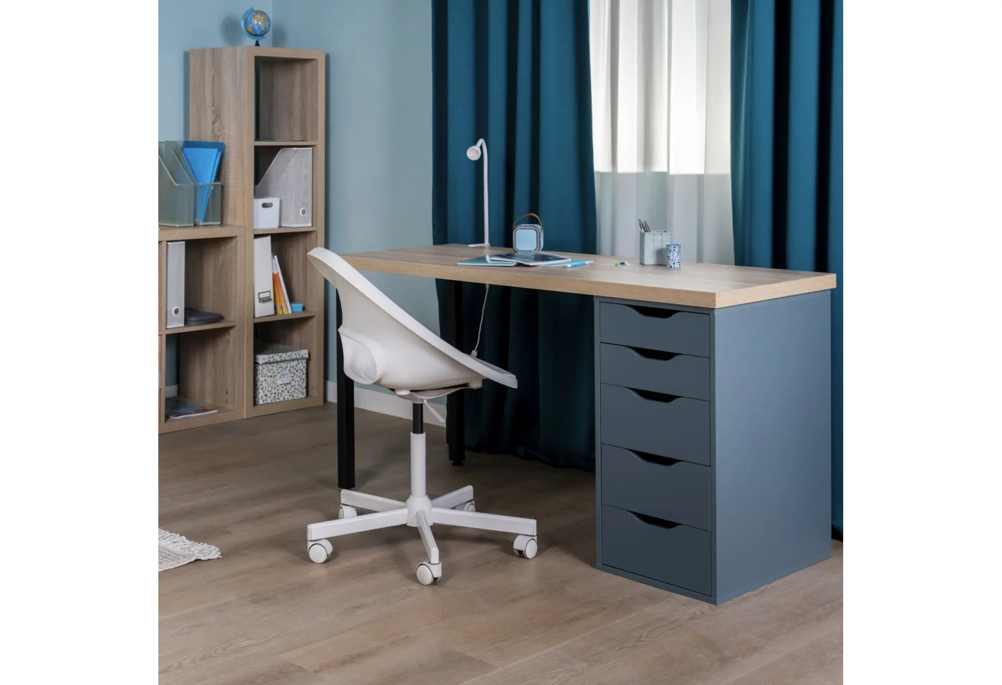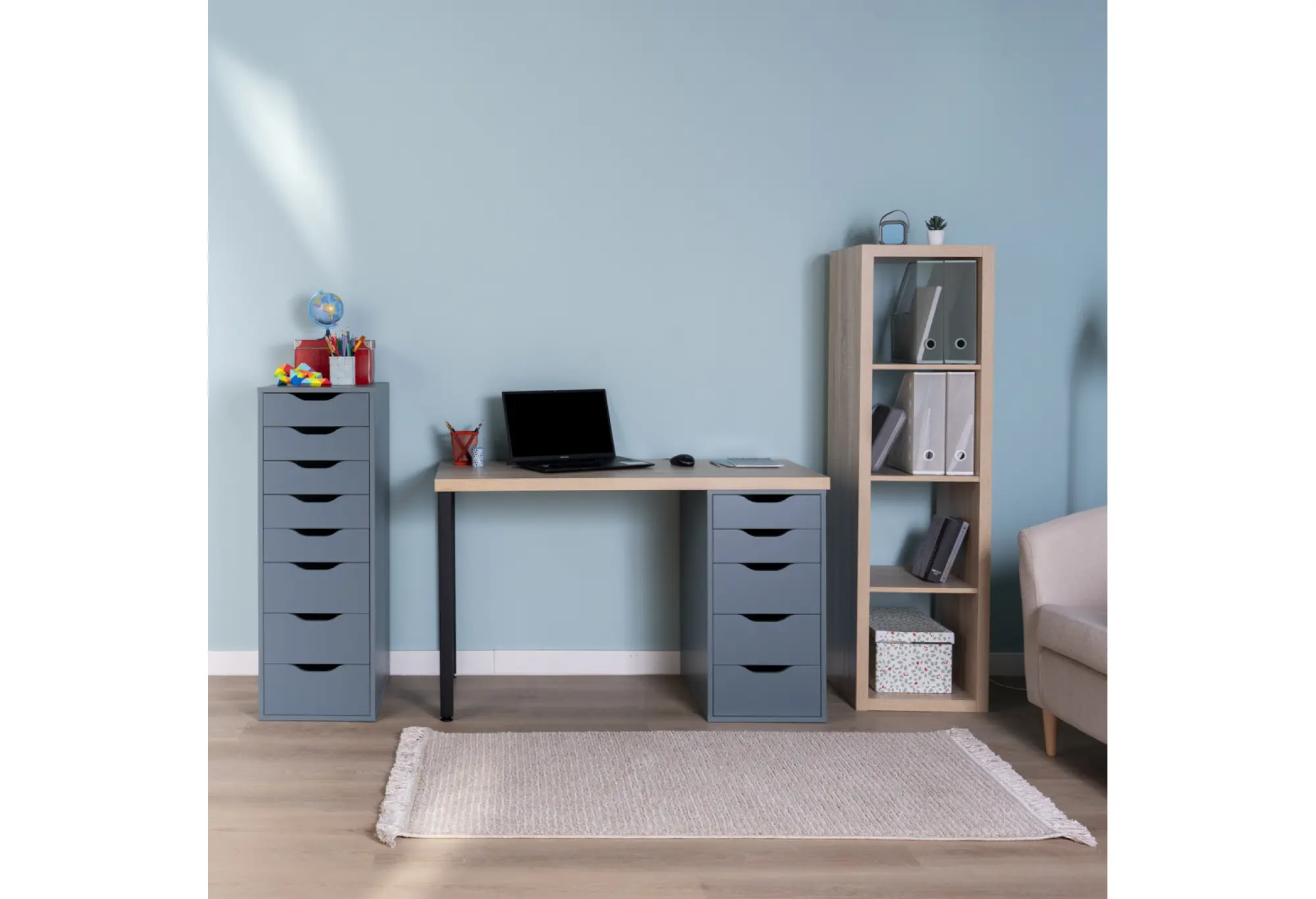 Элегантные металлические ножки в черном цвете регулируются по высоте для идеальной устойчивости. Функциональная тумба с пятью выдвижными ящиками, декорированная изящной бумагой и окрашенная УФ-материалами, предлагает удобное хранение документов и различных предметов. Отсутствие ручек на ящиках и аккуратные вырезы для выдвижения обеспечивают минималистичный и аккуратный вид.